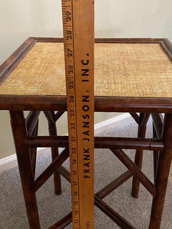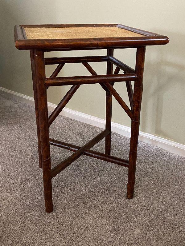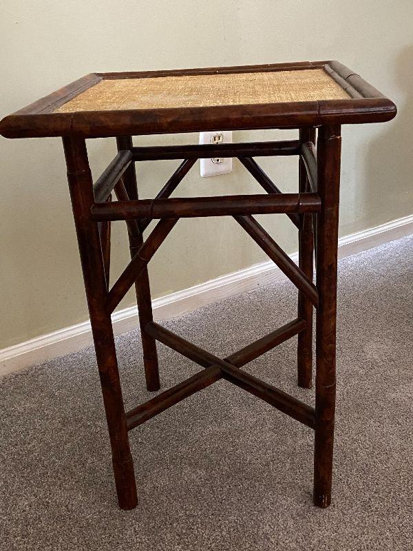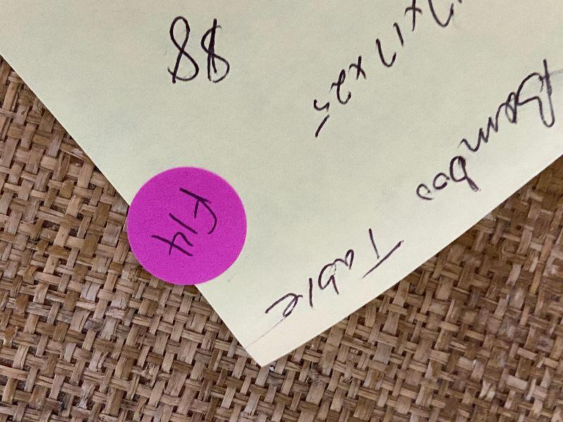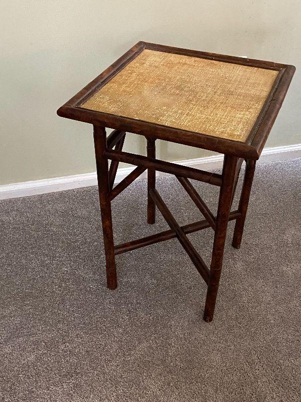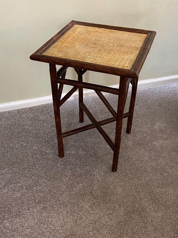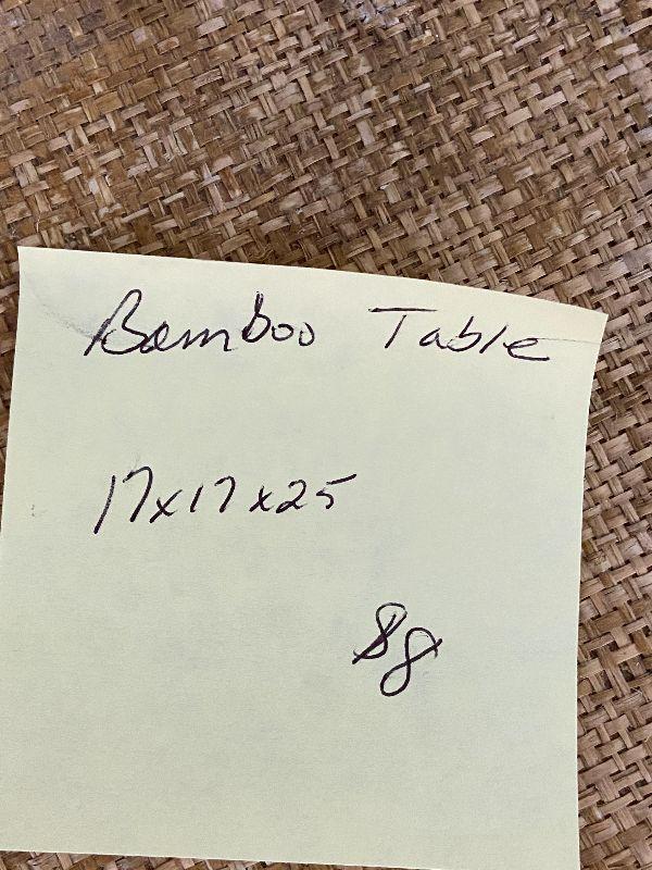 Bamboo table with woven top. Please see all pictures for contents in this listing, the condition of items in the listing, and the size if measurements were taken. Thank you for looking and have fun bidding.