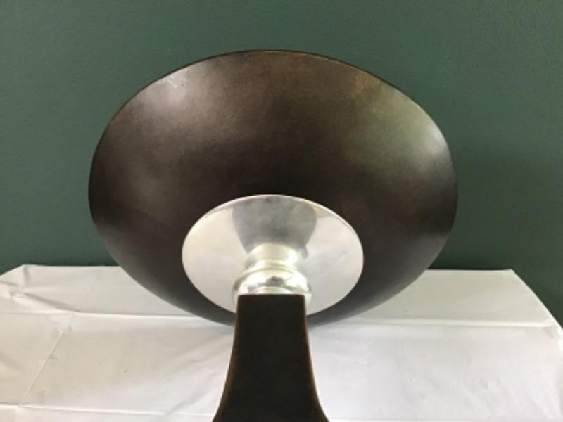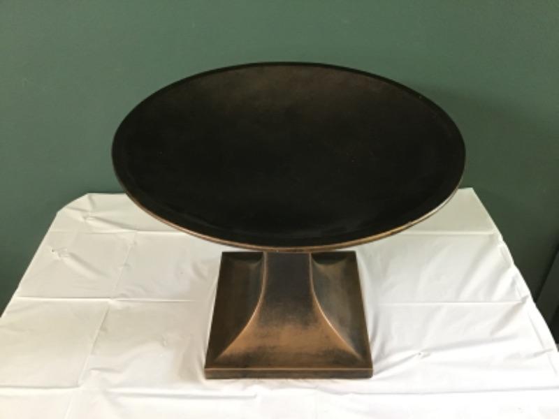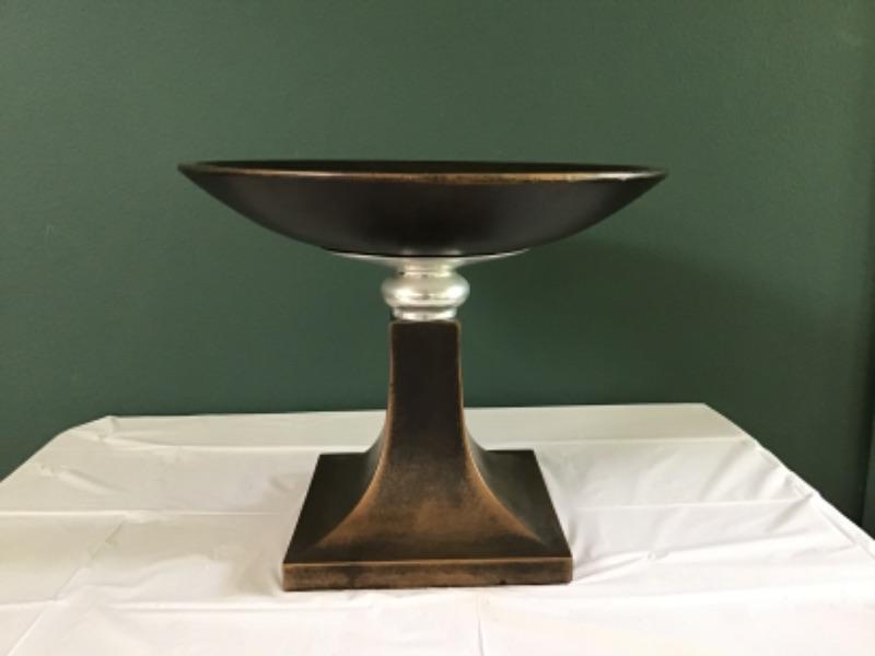 It is 13 7/8” tall. The bowl is 16 1/2” wide x 2 3/8” deep. The base is affixed with felt.