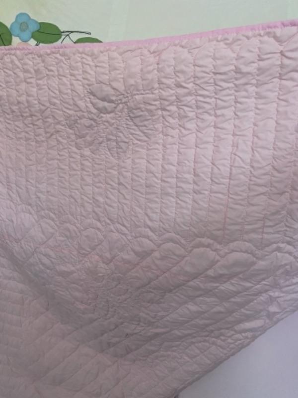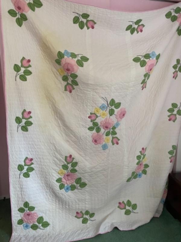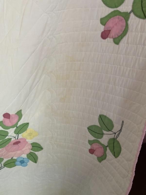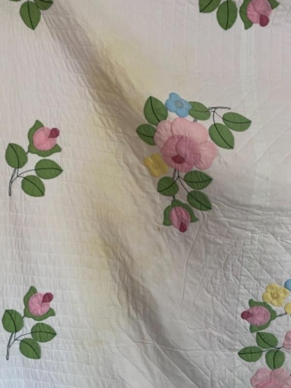Handmade Floral rose appliqué quilt, measuring 96” x 79”, some large areas of yellow stain please see pictures