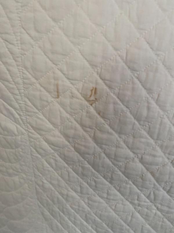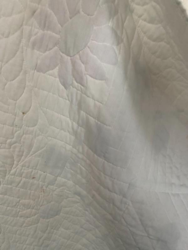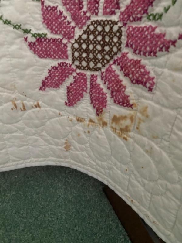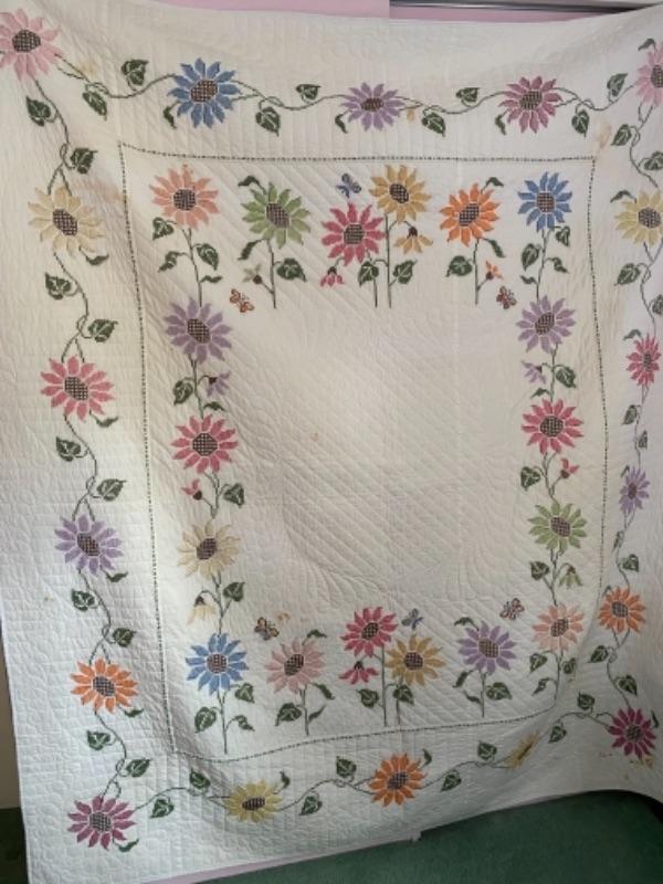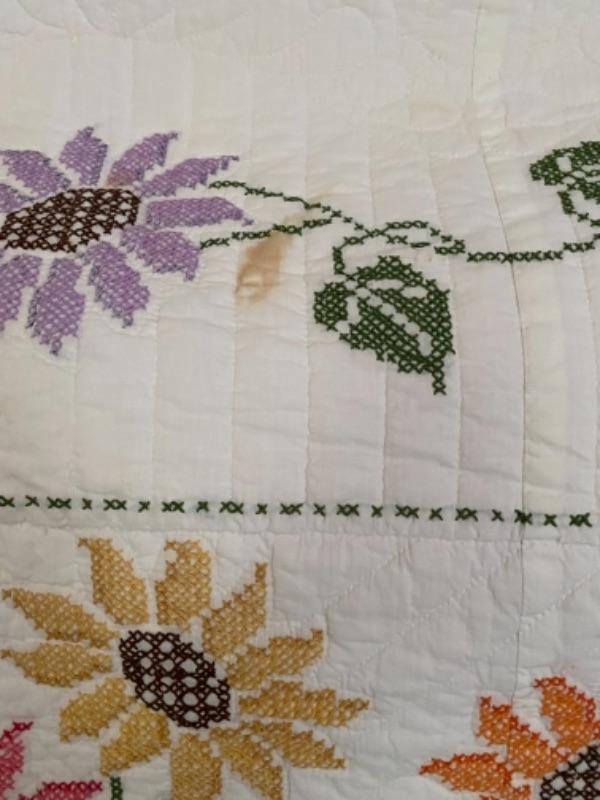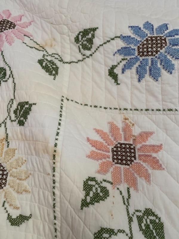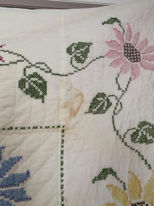 Vintage handmade Crosstitch quilt with flowers and butterflies several spots over the quilt please see pictures measuring