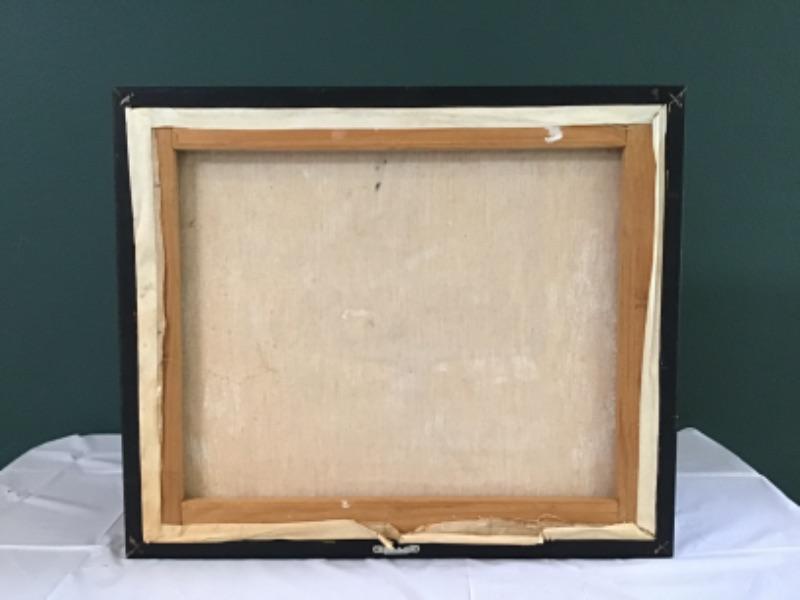 It is unsigned. Framed it is 19 1/2” wide x 16 1/2” tall.