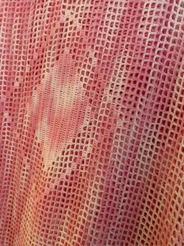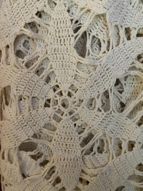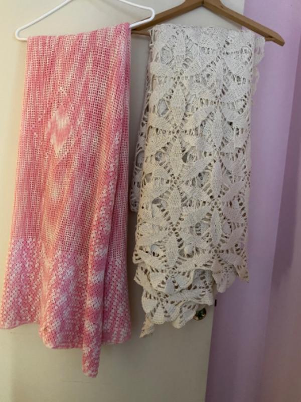 The pink and white one measures 96” x 79” the off-white crochet measures 108” x 121”