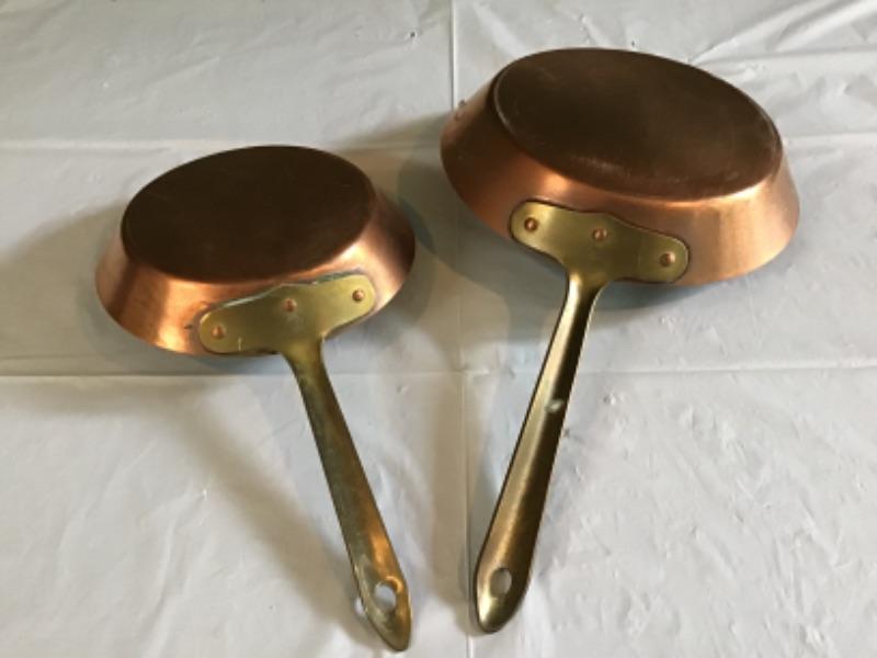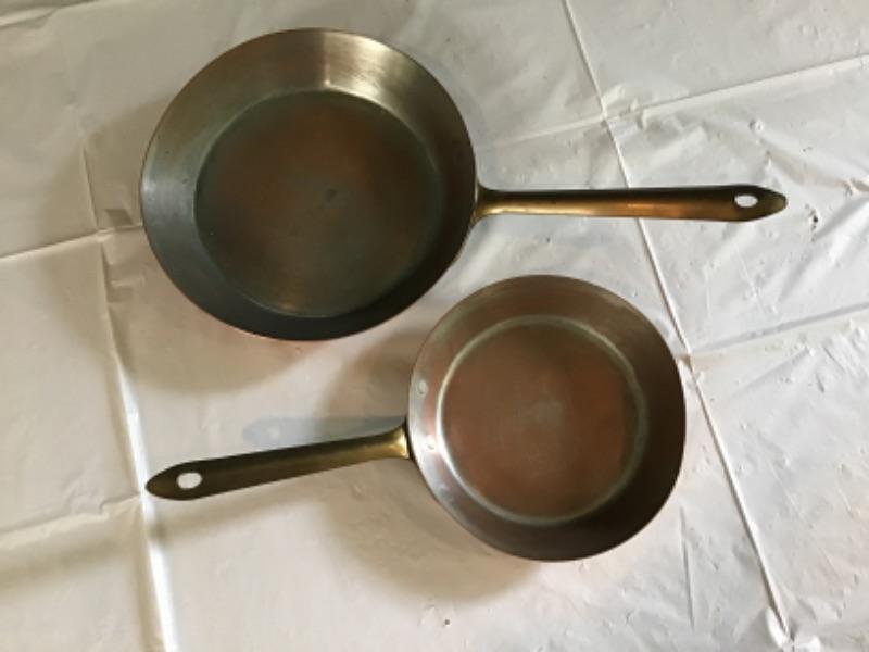The larger pan is 8 1/4” wide (across rim) x 1 3/8” tall. The smaller is 6 5/8” (across rim) x 1 1/4 tall.