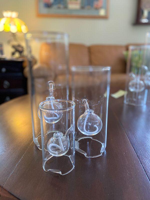 Glass Wolford handblown glass oil lamps. Please see all pictures for contents in this listing, the condition of items in the listing, and the size if measurements were taken. Thank you for looking and have fun bidding.