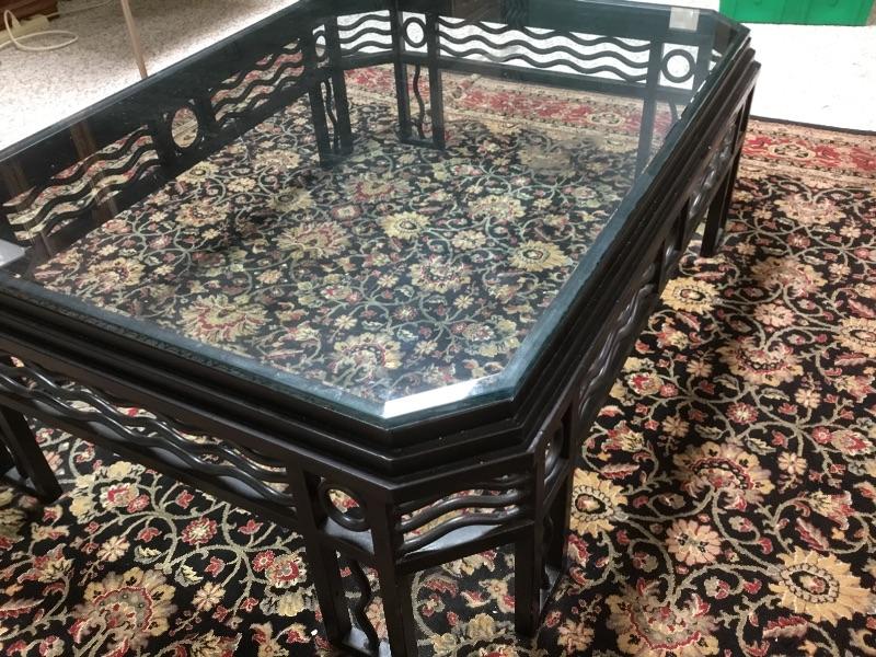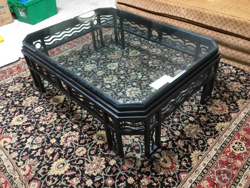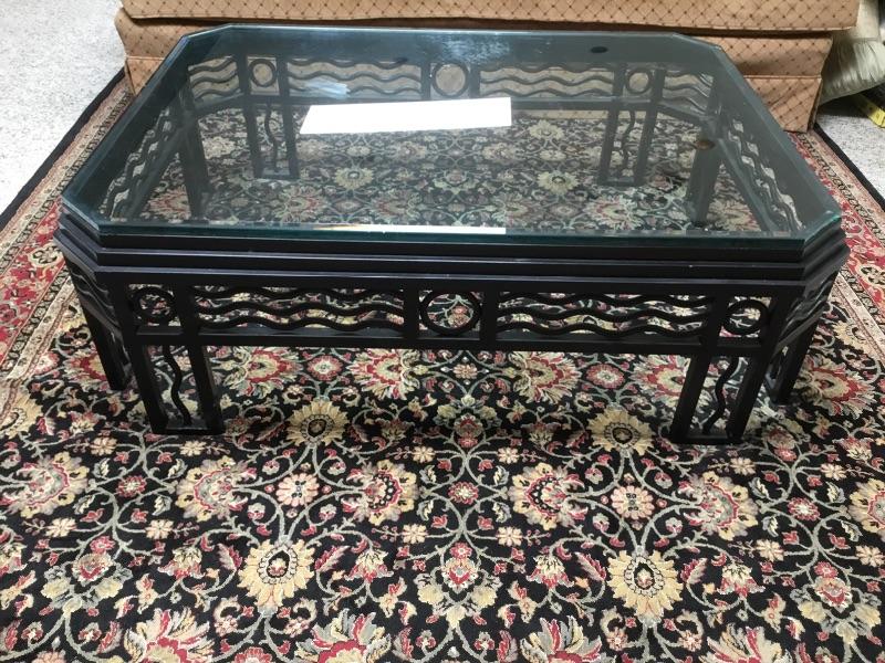 Large black wrought iron coffee table with double glass. 52”w x42”d x 17”h