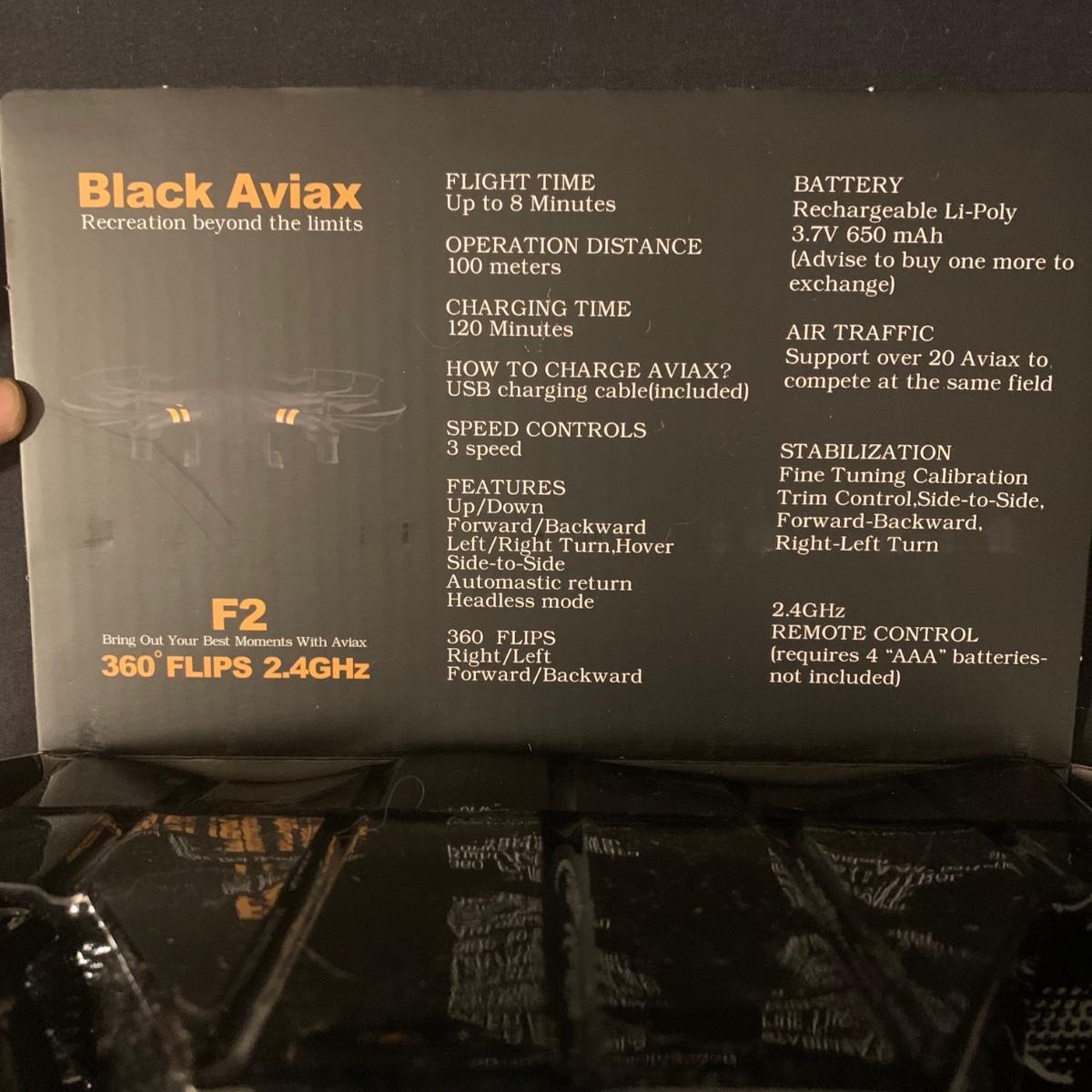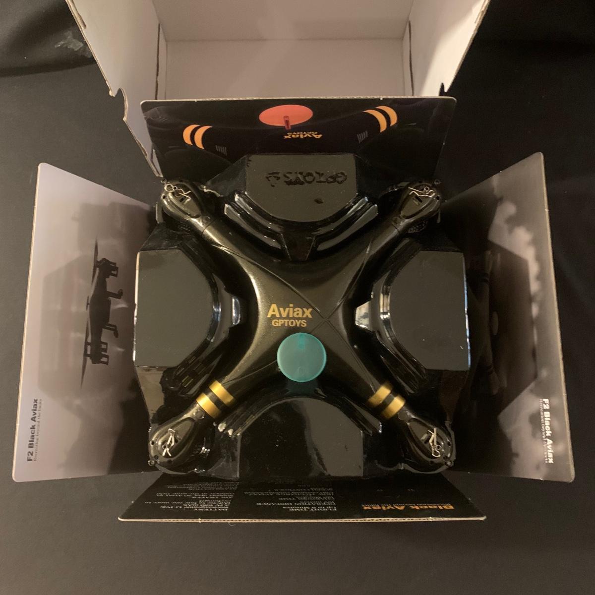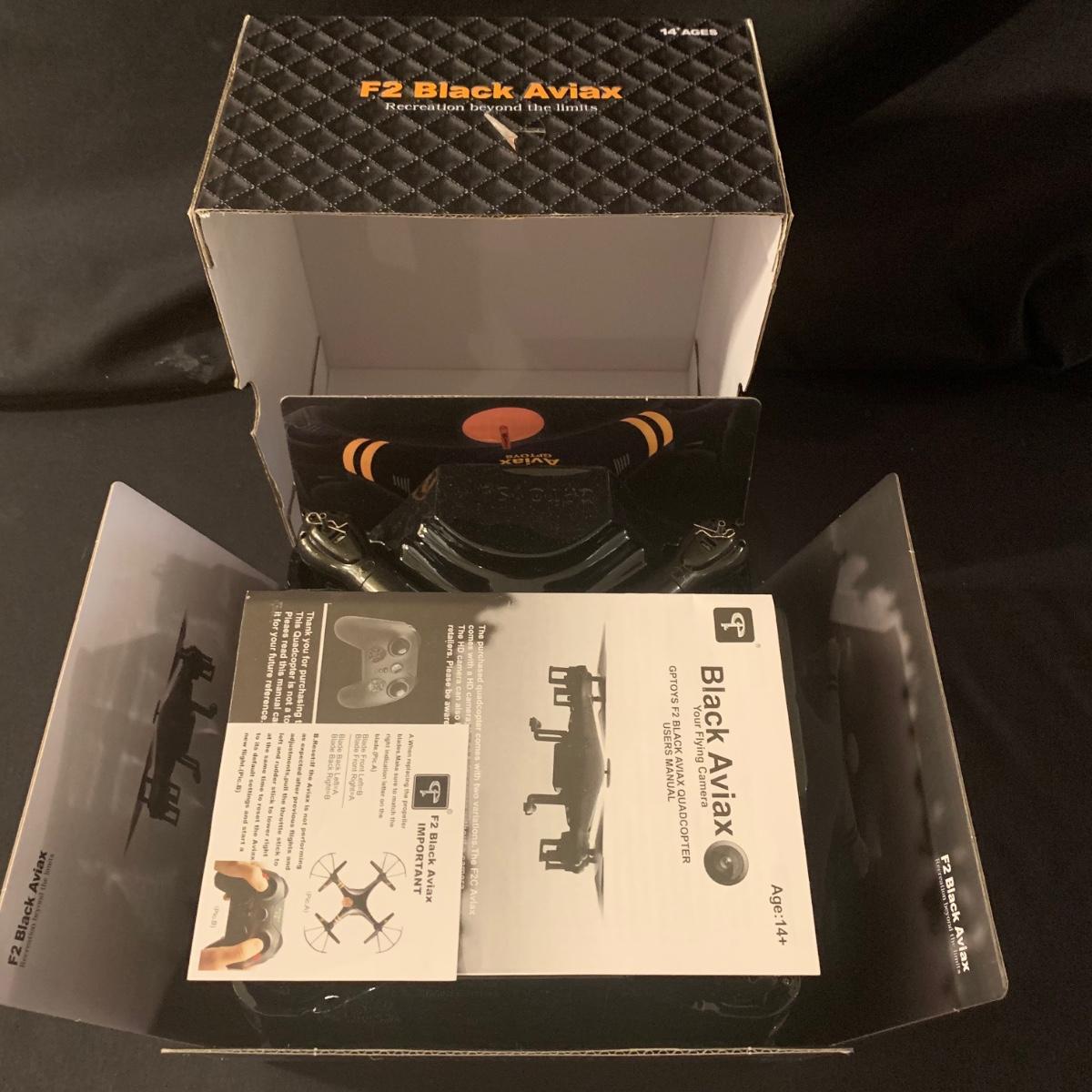 F2 Black Aviax camera drone by GPTOYS. Quadracopter is new in box with manual and appears to have never been used. It features a eight minute flight time and rechargeable Li-poly 3.7V 650 mAh battery. It is know for its ability to do 360 degree flips! Box measures 9.5”L x 6”W x 9.5”H. Suggested age is 14+.