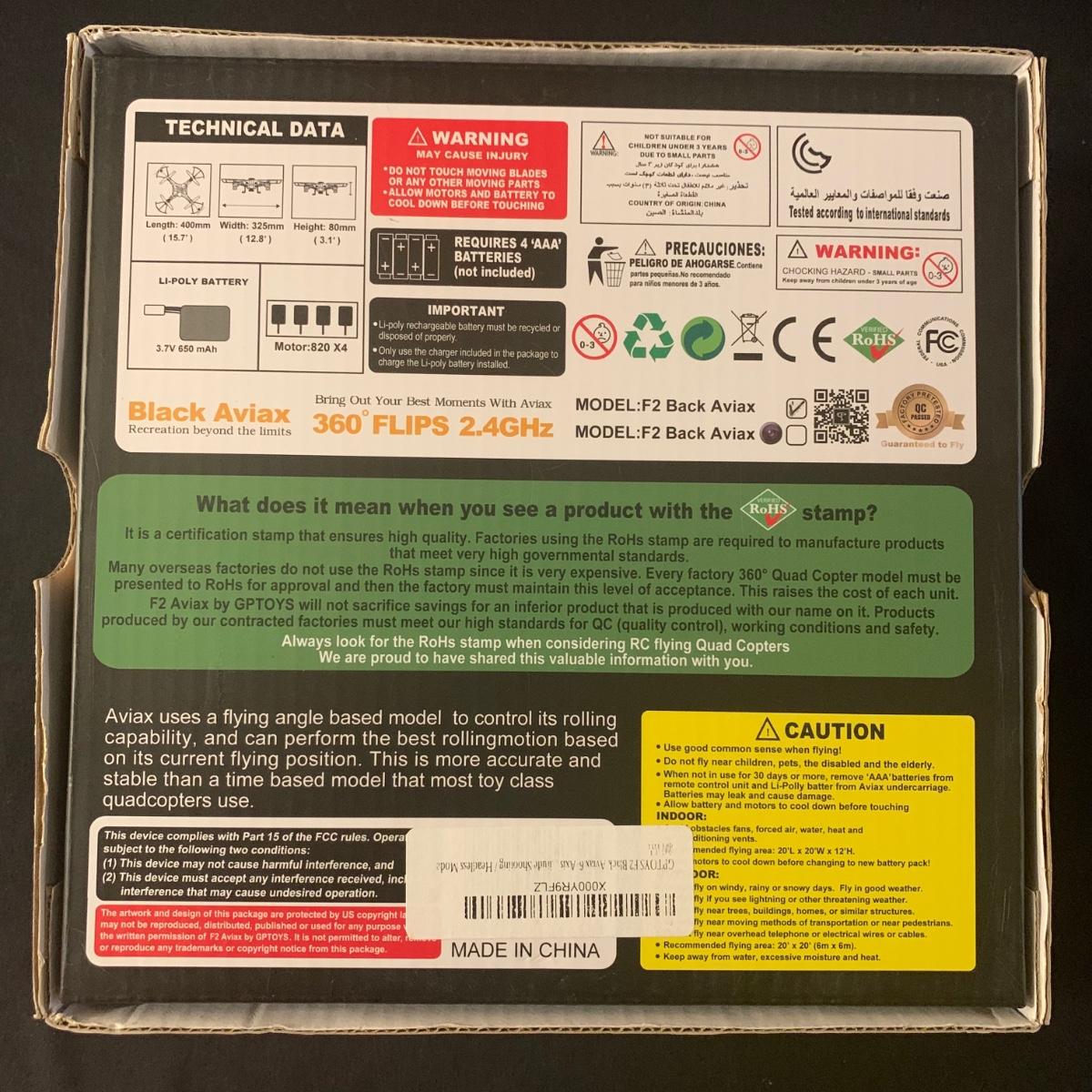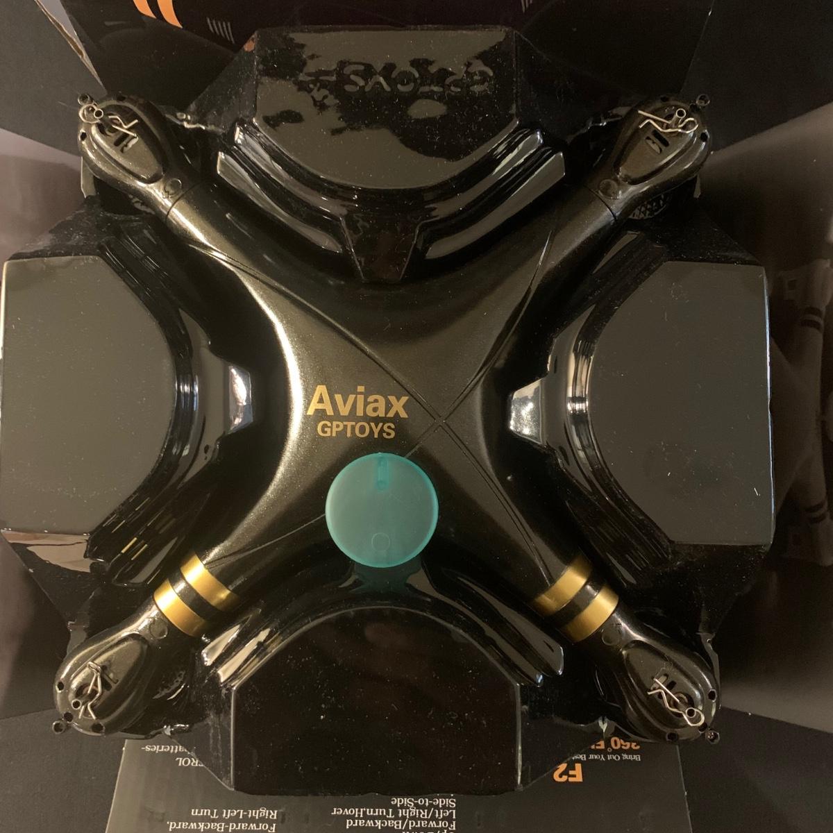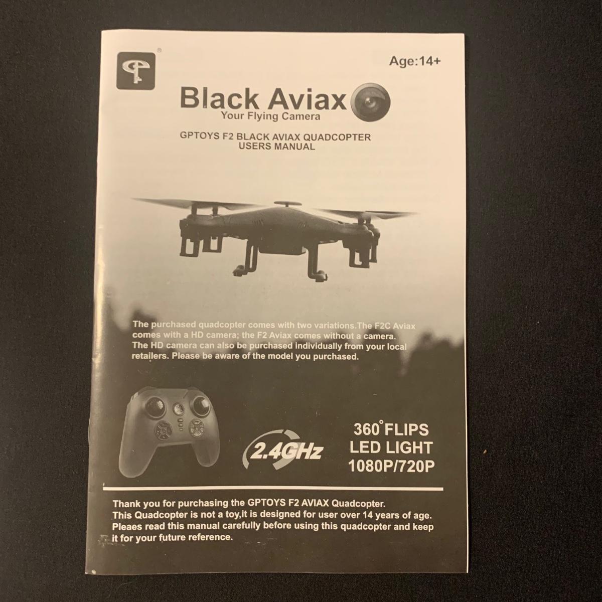 F2 Black Aviax camera drone by GPTOYS. Quadracopter is new in box with manual and appears to have never been used. It features a eight minute flight time and rechargeable Li-poly 3.7V 650 mAh battery. It is know for its ability to do 360 degree flips! Box measures 9.5”L x 6”W x 9.5”H. Suggested age is 14+.