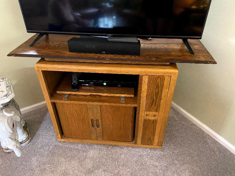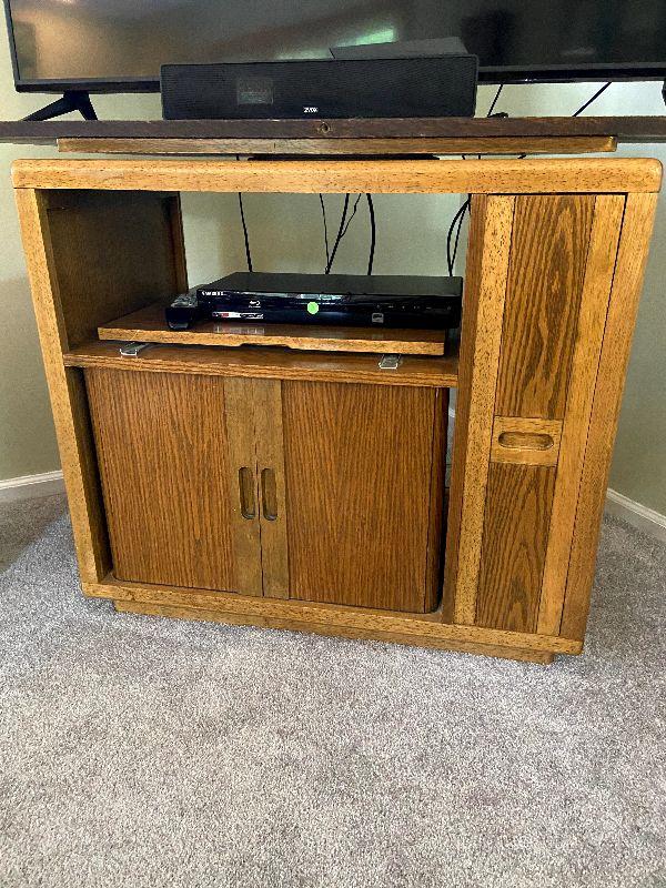 Has been modified to hold a larger TV on top with lazy susan and table leaves.