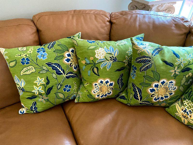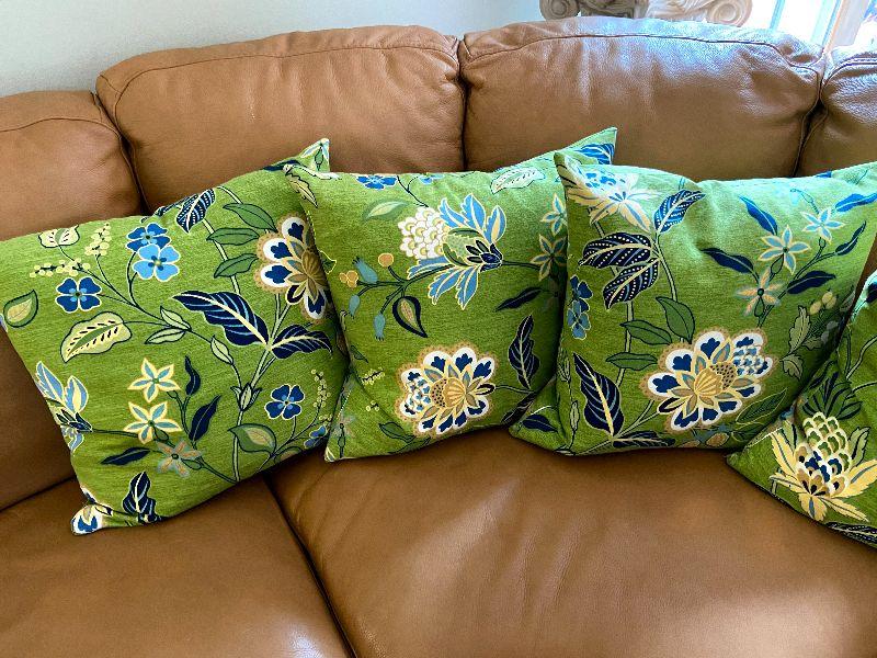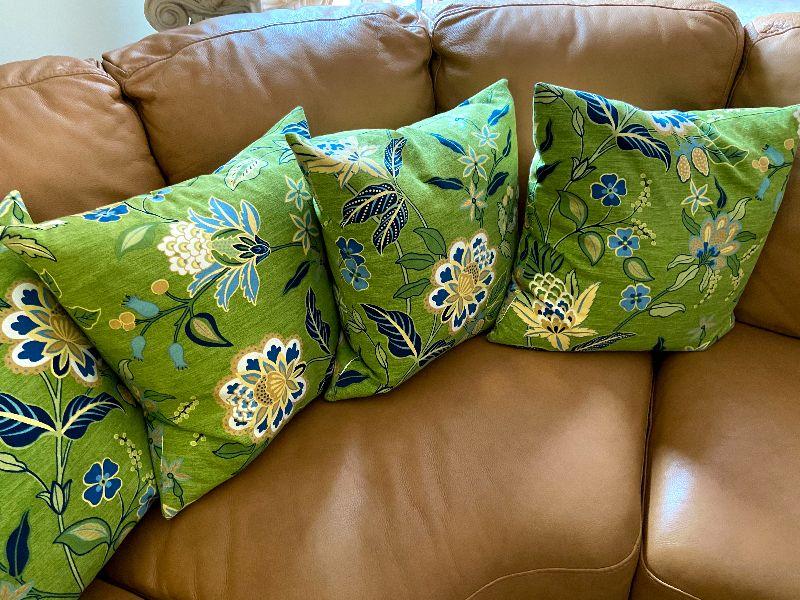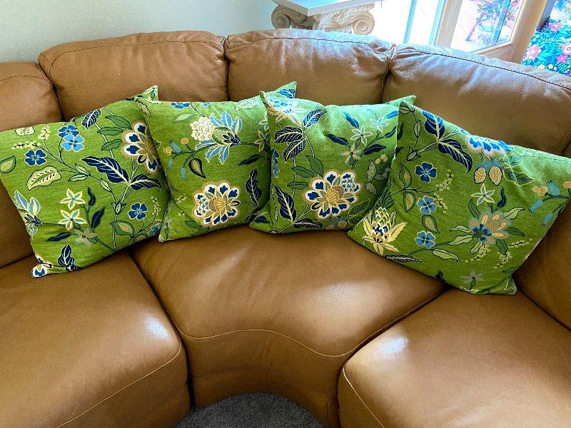 Four throw pillows. Please see all pictures for contents in this listing, the condition of items in the listing, and the size if measurements were taken. Thank you for looking and have fun bidding.
