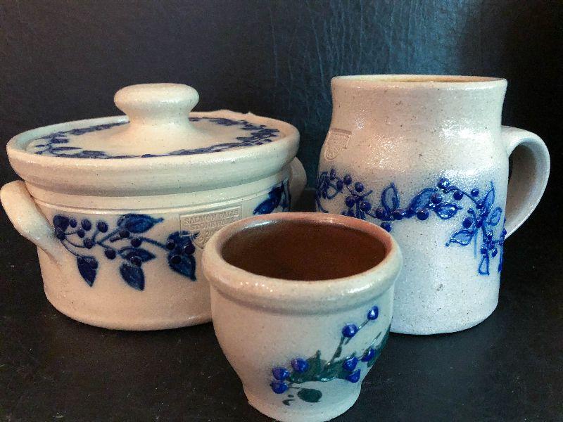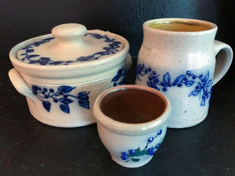 This beautiful stoneware is collectible and has a raised blueberry vine design around the pieces. Beautiful decor or functioning crocks! Please see pictures for contents of the lot, condition of the lot, and measurements if needed. Thank you for looking and have fun bidding!