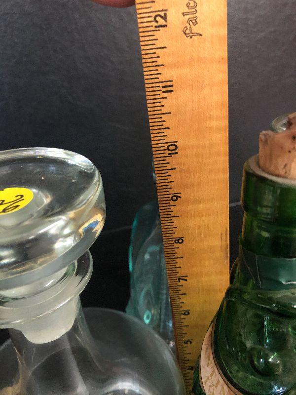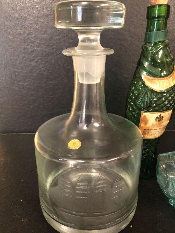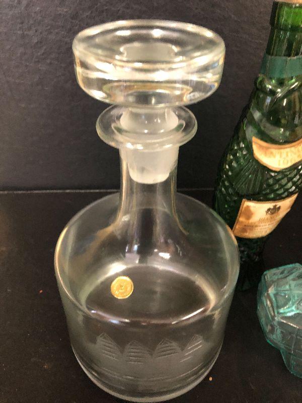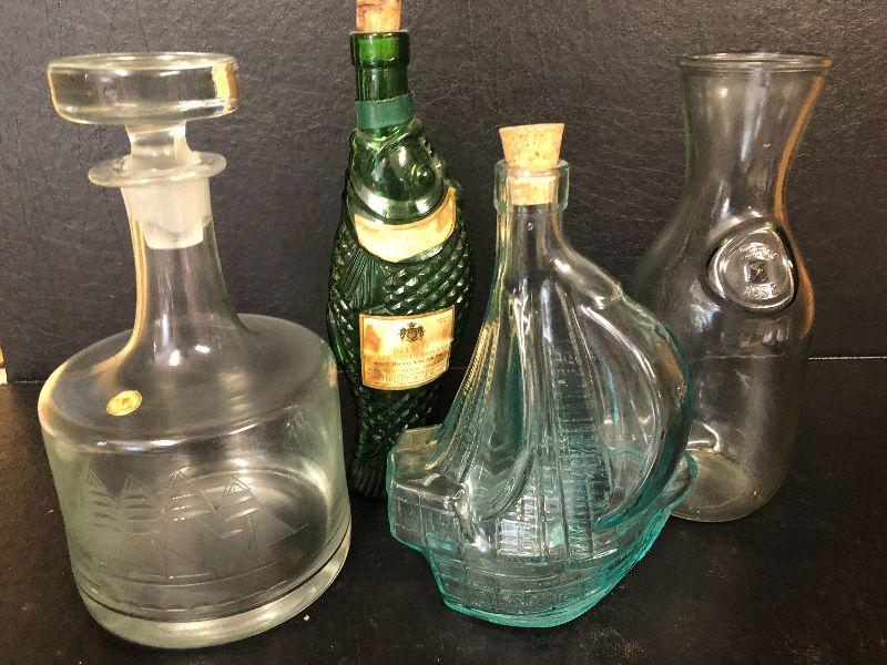 Decorative Bottles and glass decanter with etched tall ship. Please see all pictures for exact contents of the lot, condition of the items, and if measurements if taken. Thank you for looking and have fun bidding.