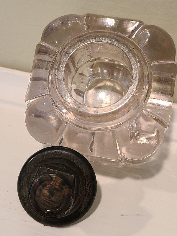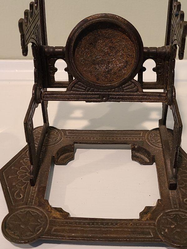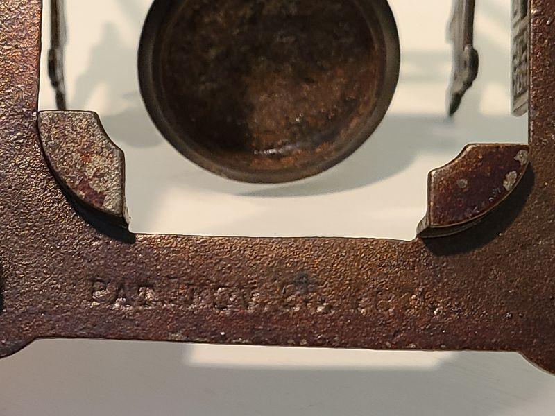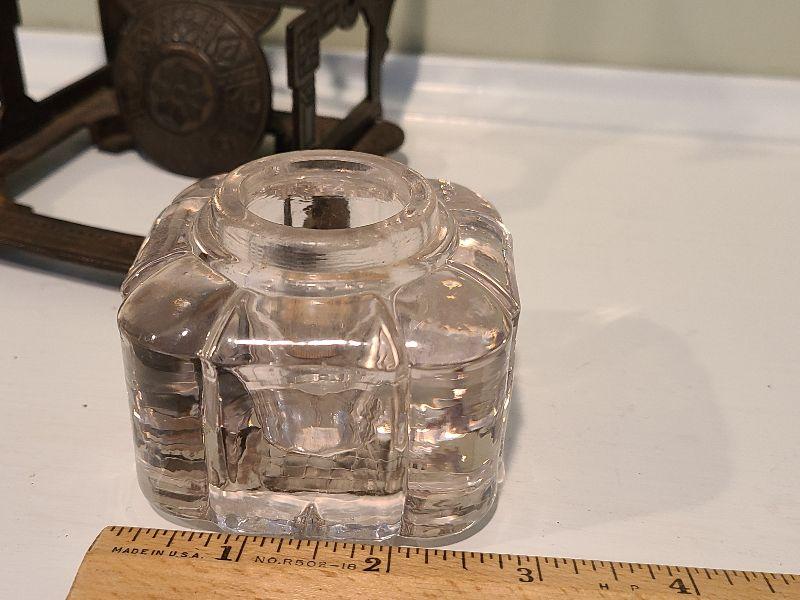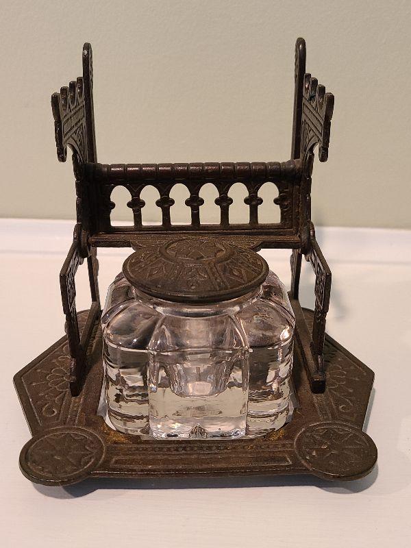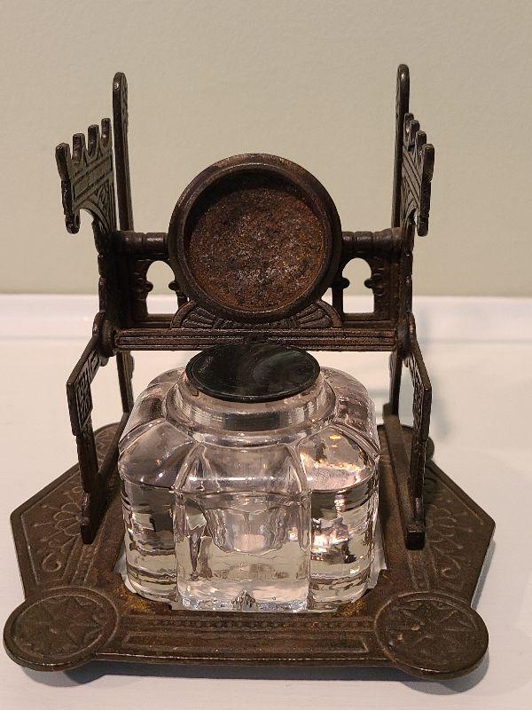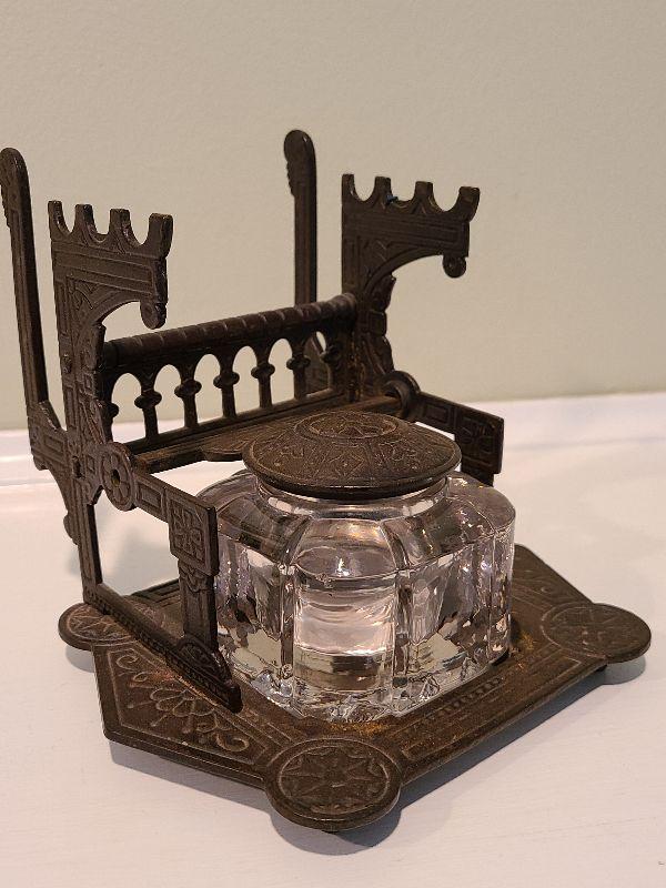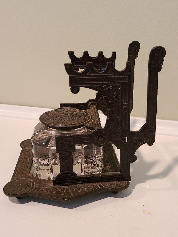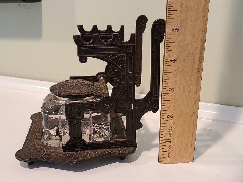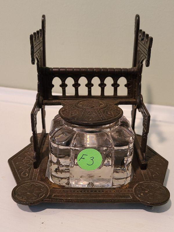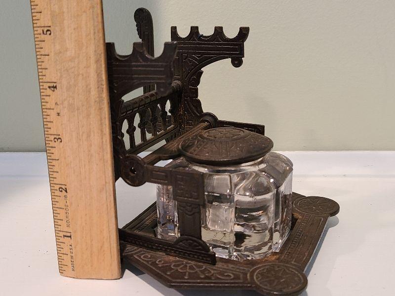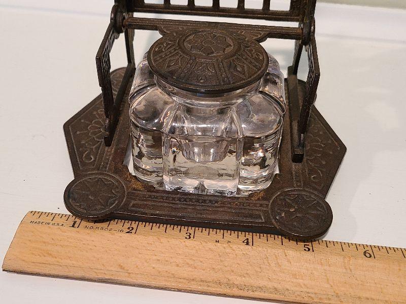 F3: Antique Cast Iron Inkwell Glass Ink Pot w Pen Holder Eastlake