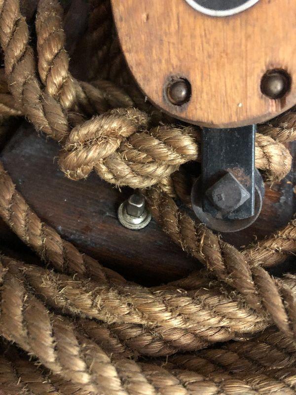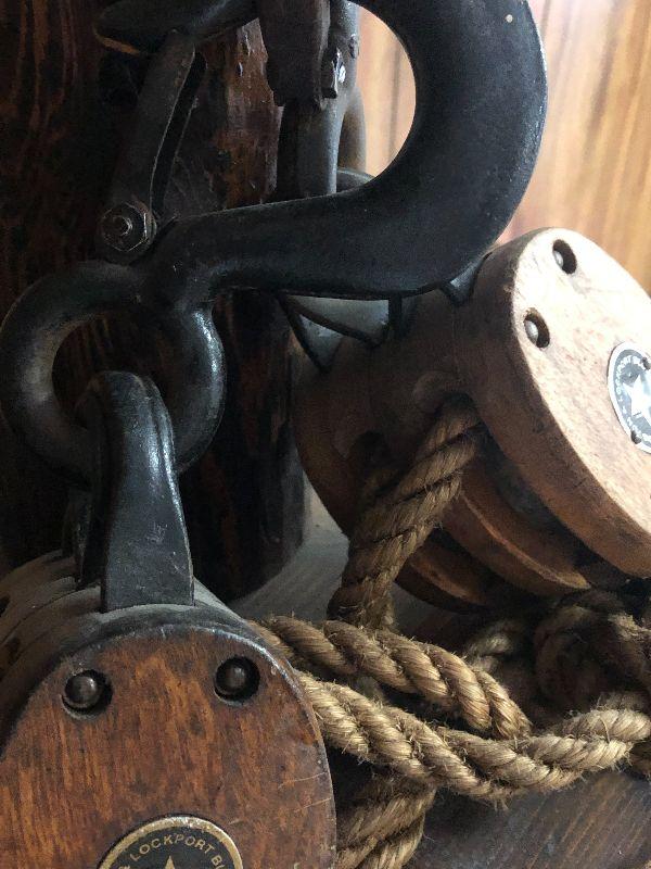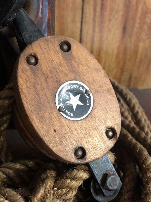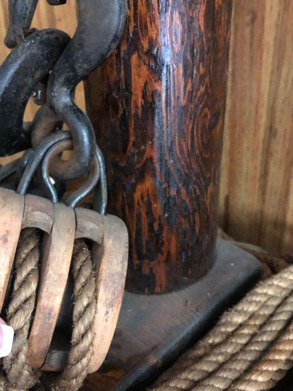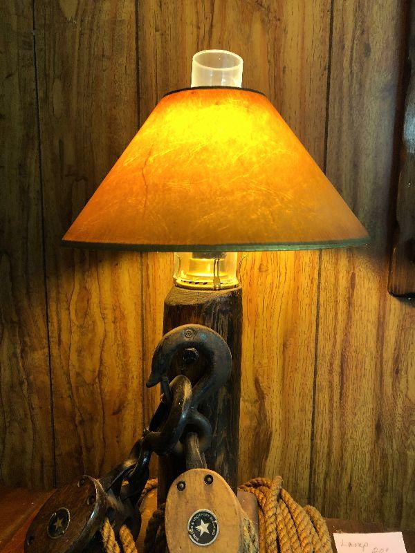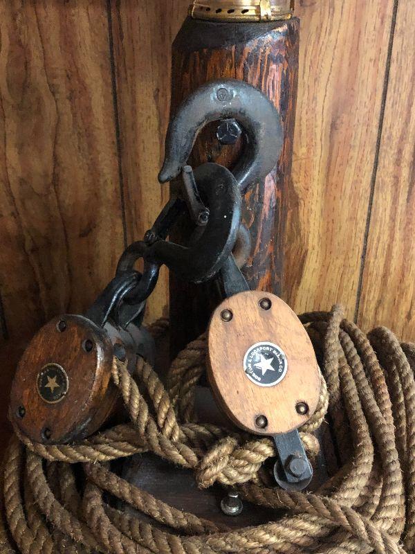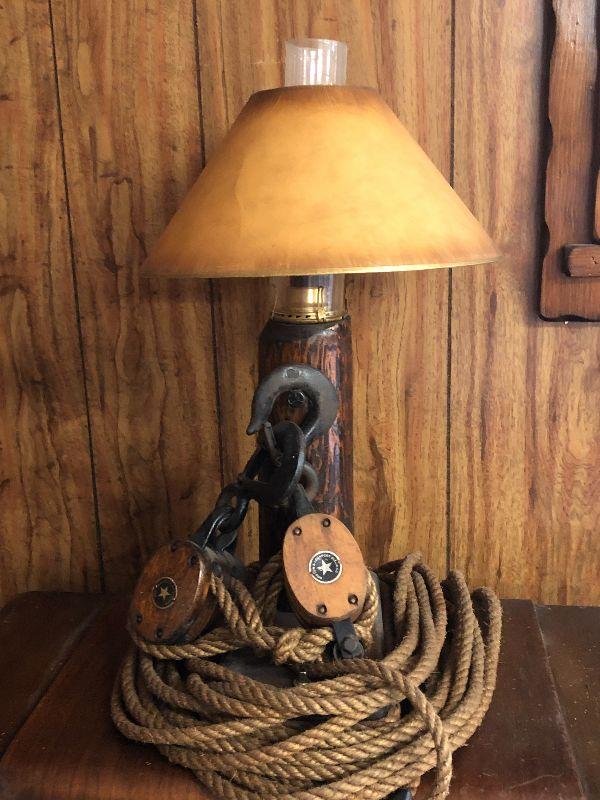 This is an up cycled project that is very unique. Highly collectible Boston and Lockport pulleys wrapped around log lamp for a Nautical Inspired lamp. Please see all pictures for exact contents of the lot, condition of the items, and measurements if taken. Thank you for looking and have fun bidding.
