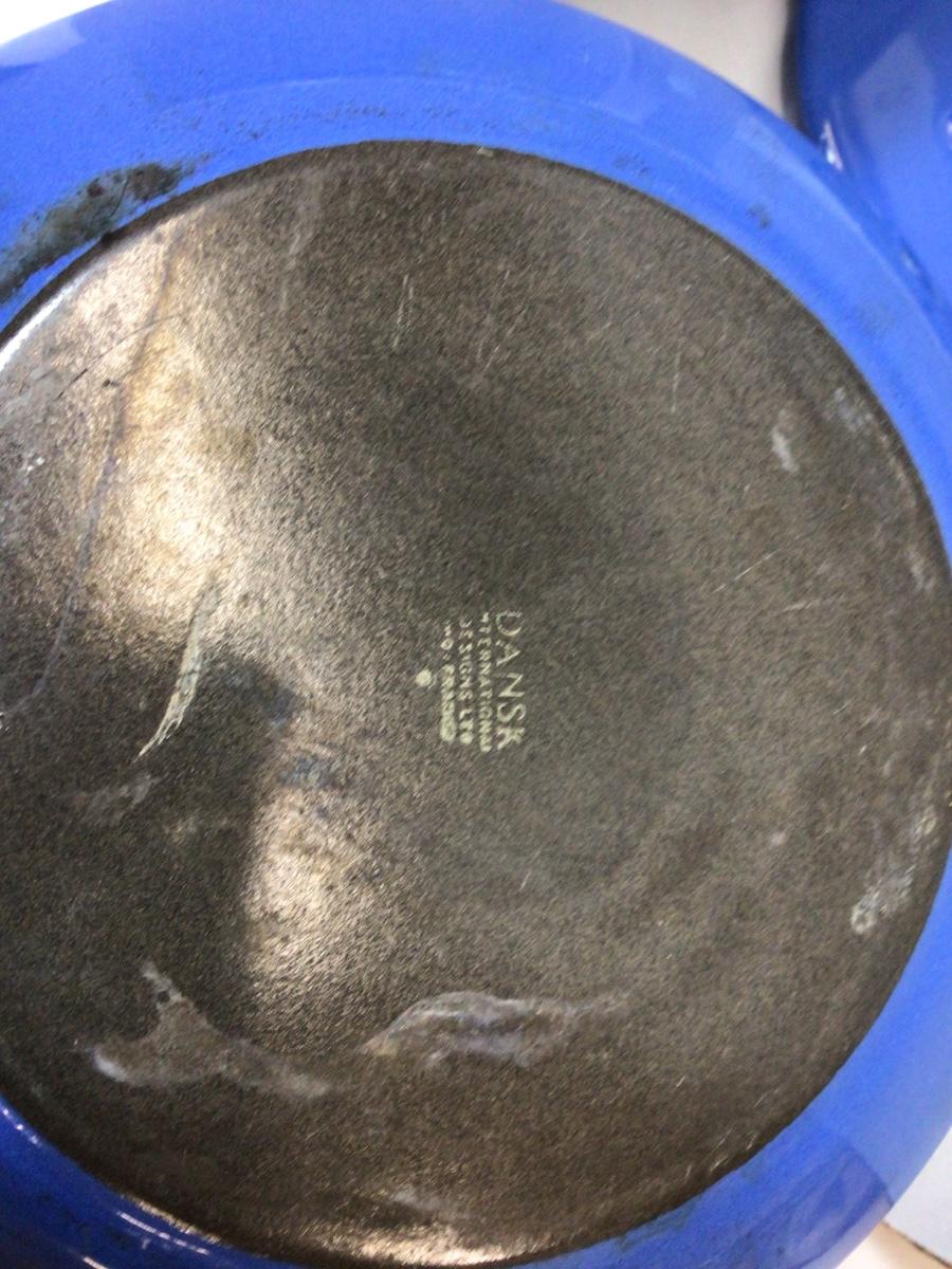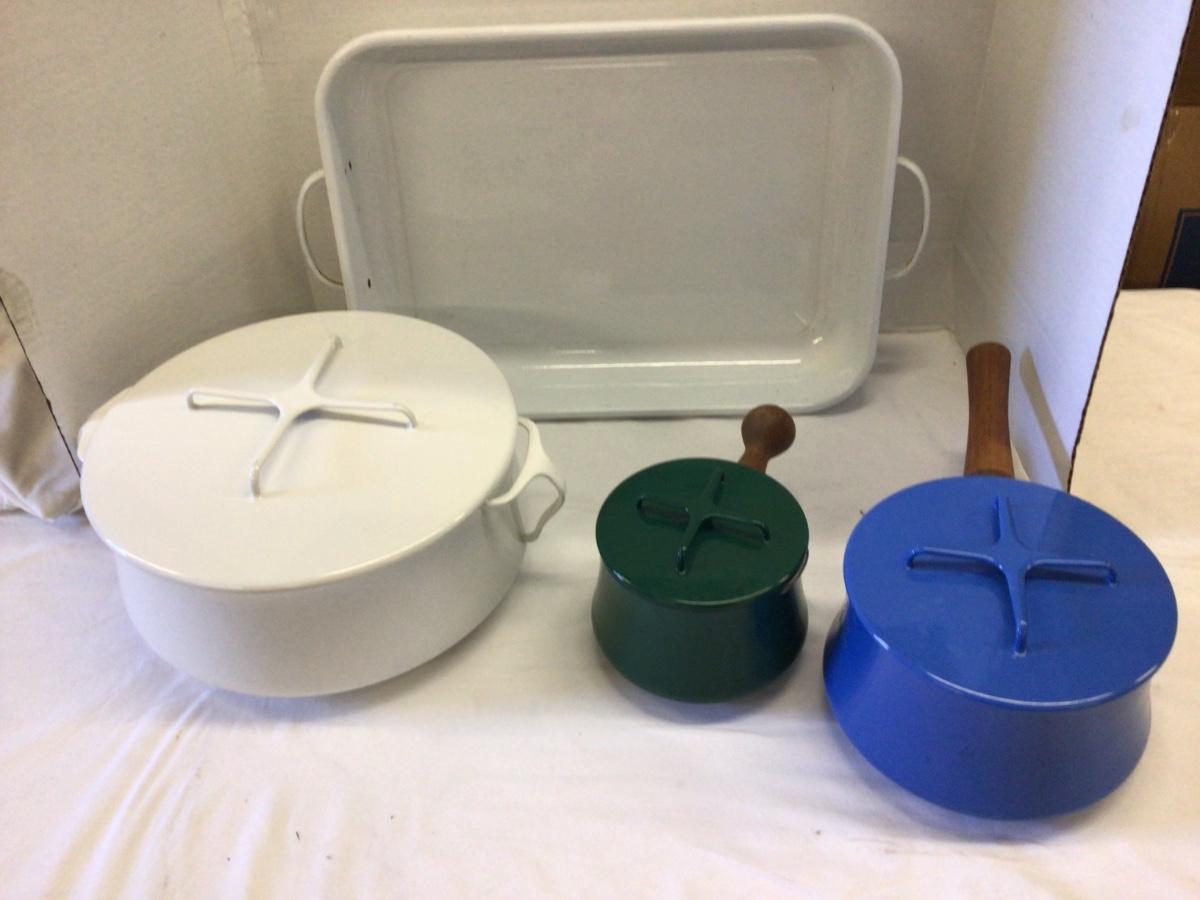 Comes with two Dansk Pots and one large porcelin oven dish. Also comes with one white and one blue dansk pots. Both have different stamps on bottom.