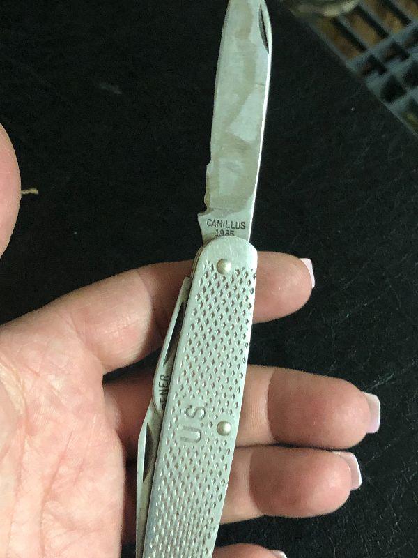 This lot consists of numerous pocket knives and sterling silver pilot wings that are broken on back, it doesn't have a pin back. The pocket knives are a US Military Camillus 1985, a Forest Master Colonial that was usually for Boyscouts, and a Buck 110 hunting knife. Please see all pictures for exact contents of the lot, condition of the items, and if measurements if taken. Thank you for looking and have fun bidding