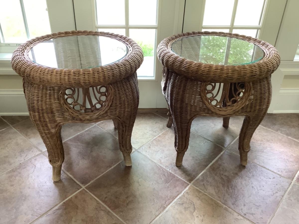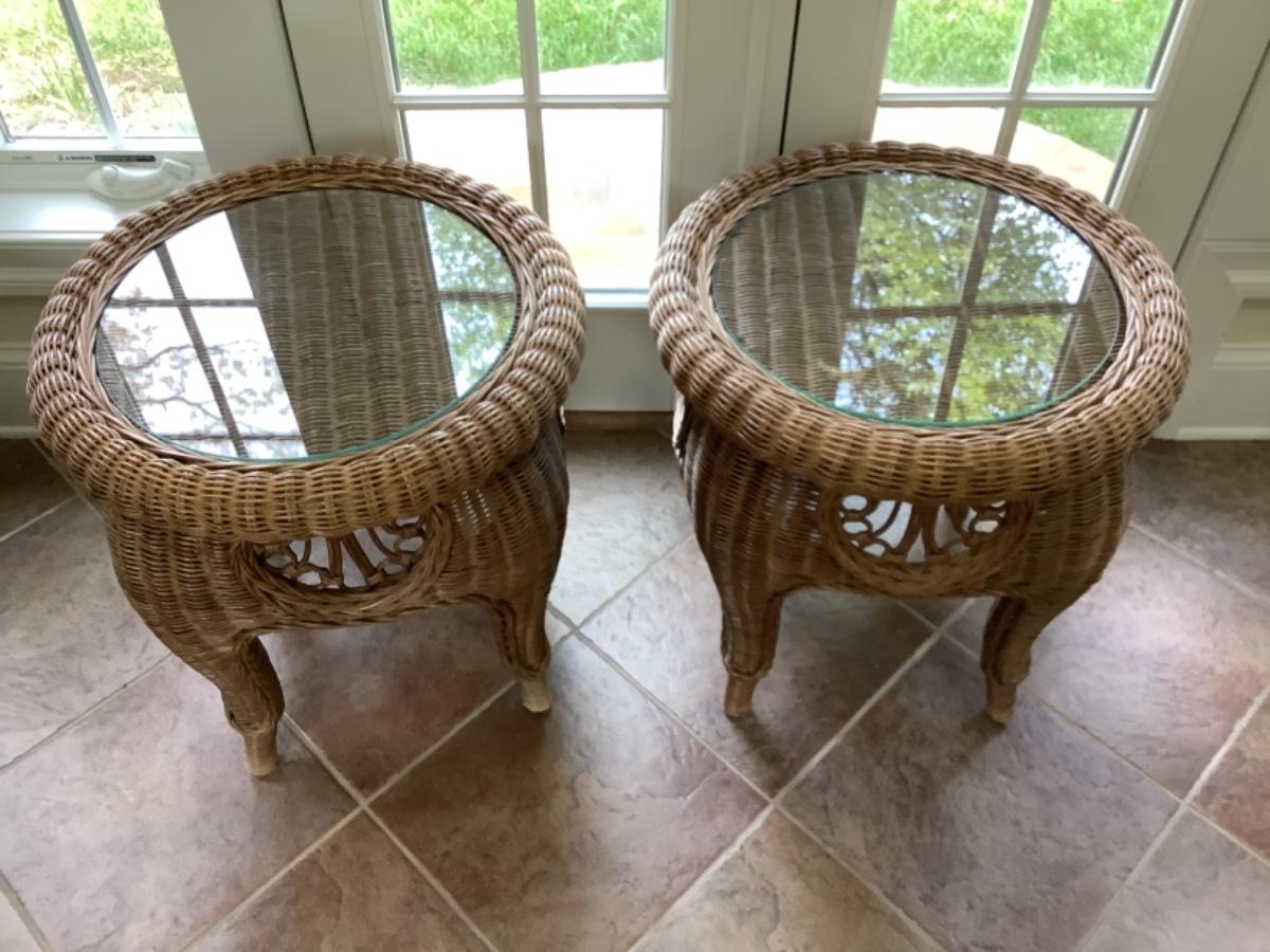 F618 Pair of Ethan Allen Round Wicker Glass-top Tables