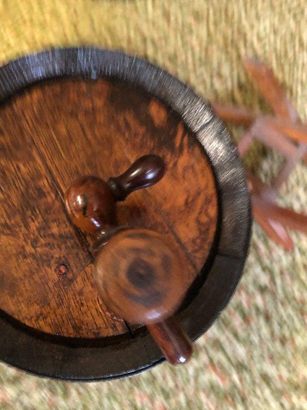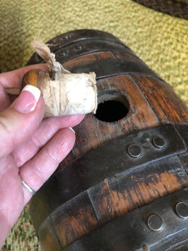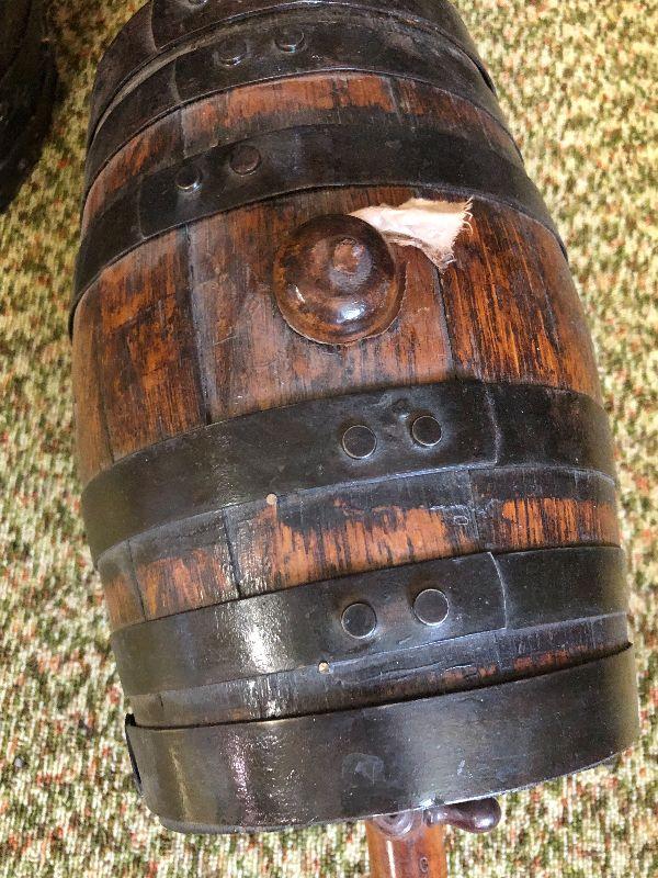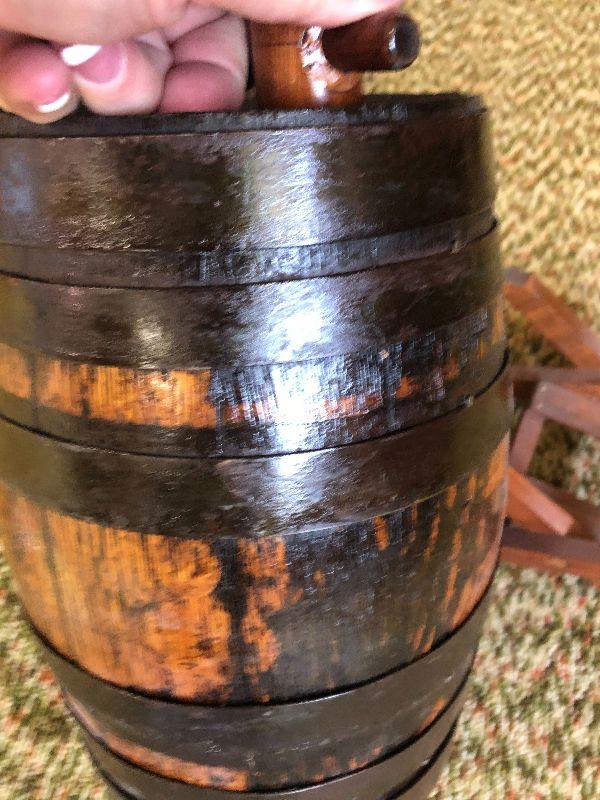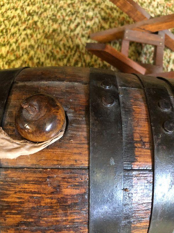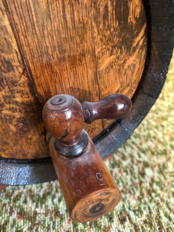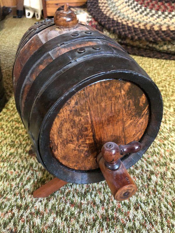 This was used indoors as Nautical Decor. Wood, Iron banded with tap and stand. It is smaller in size and measures 16 x 23 inches. Please see all pictures for exact contents of the lot, condition of the items, and if measurements if taken. Thank you for looking and have fun bidding