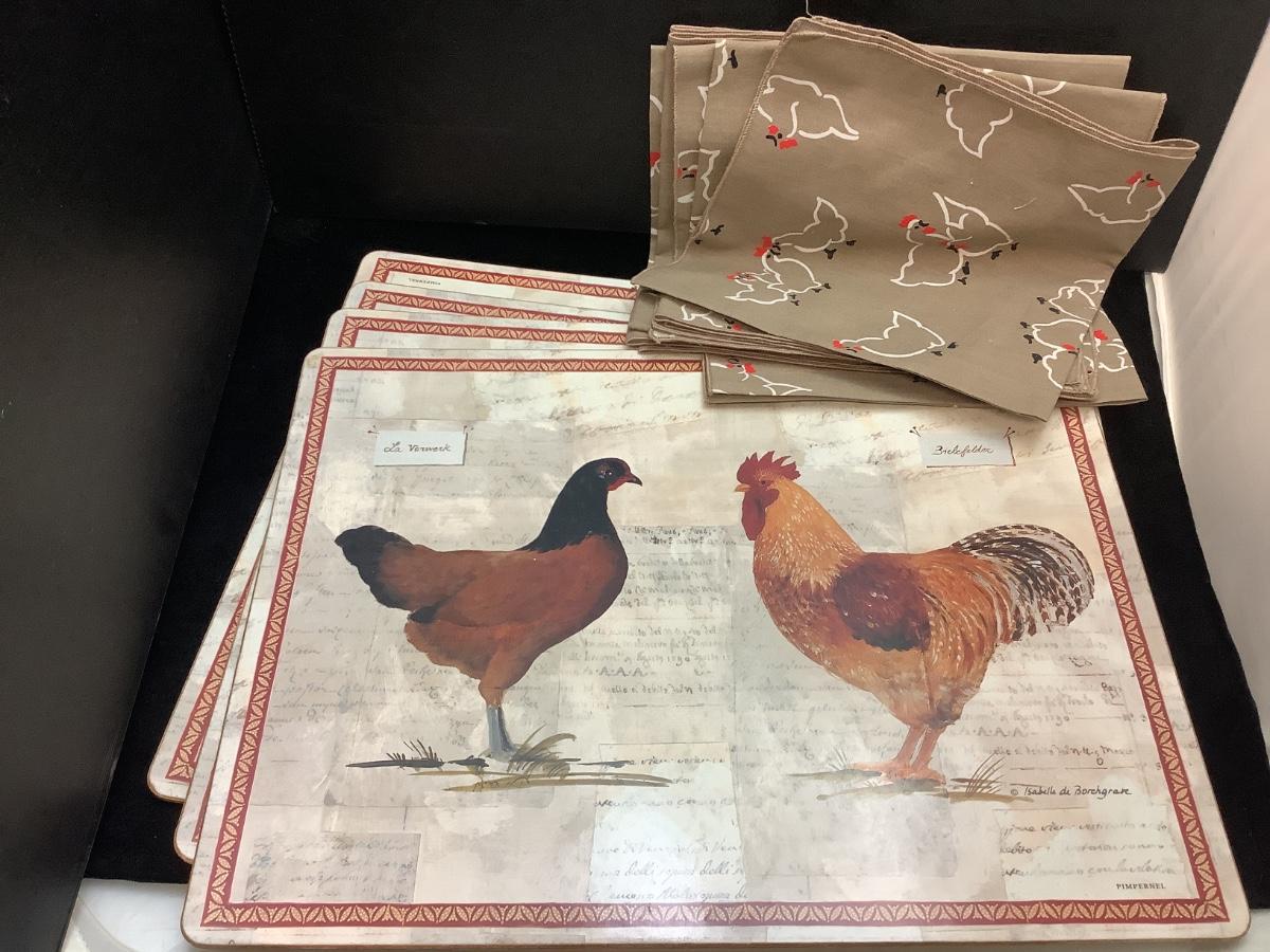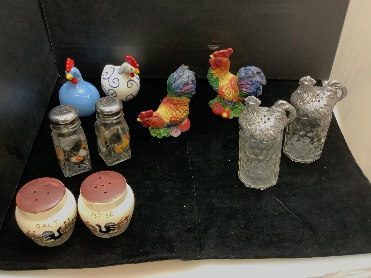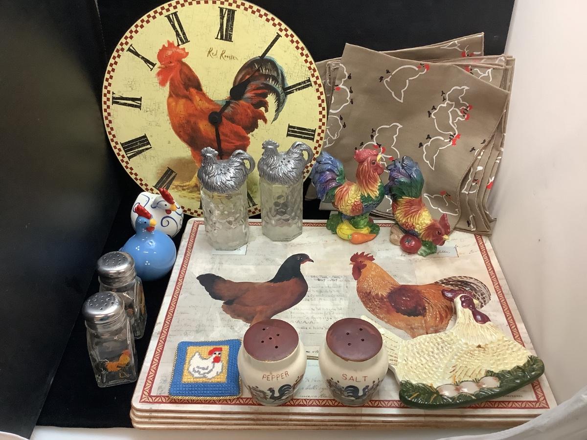 rooster clock, napkins, salt and peppers , spoon rest , placemats and more