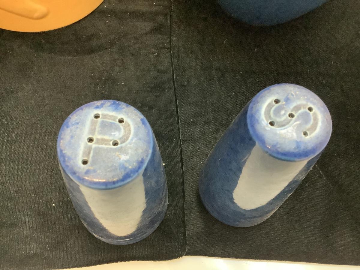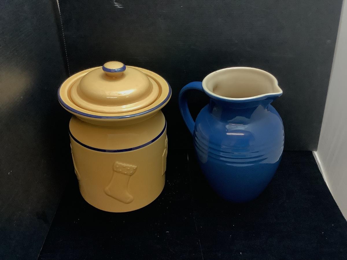 Williams Sonoma Cookie Jar with Le Creuset Blue Water Pitcher , salt and pepper,