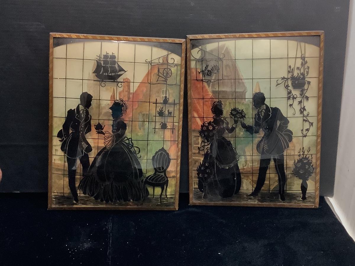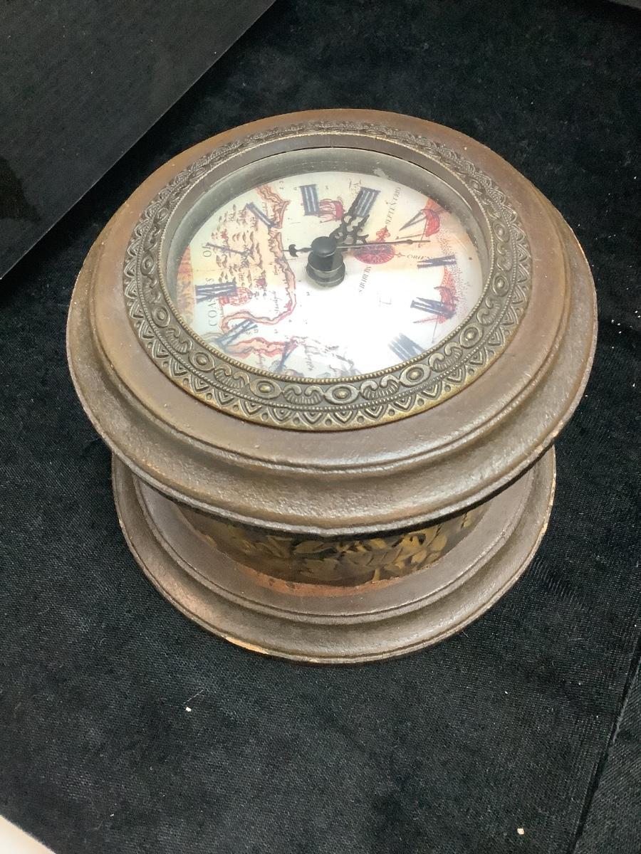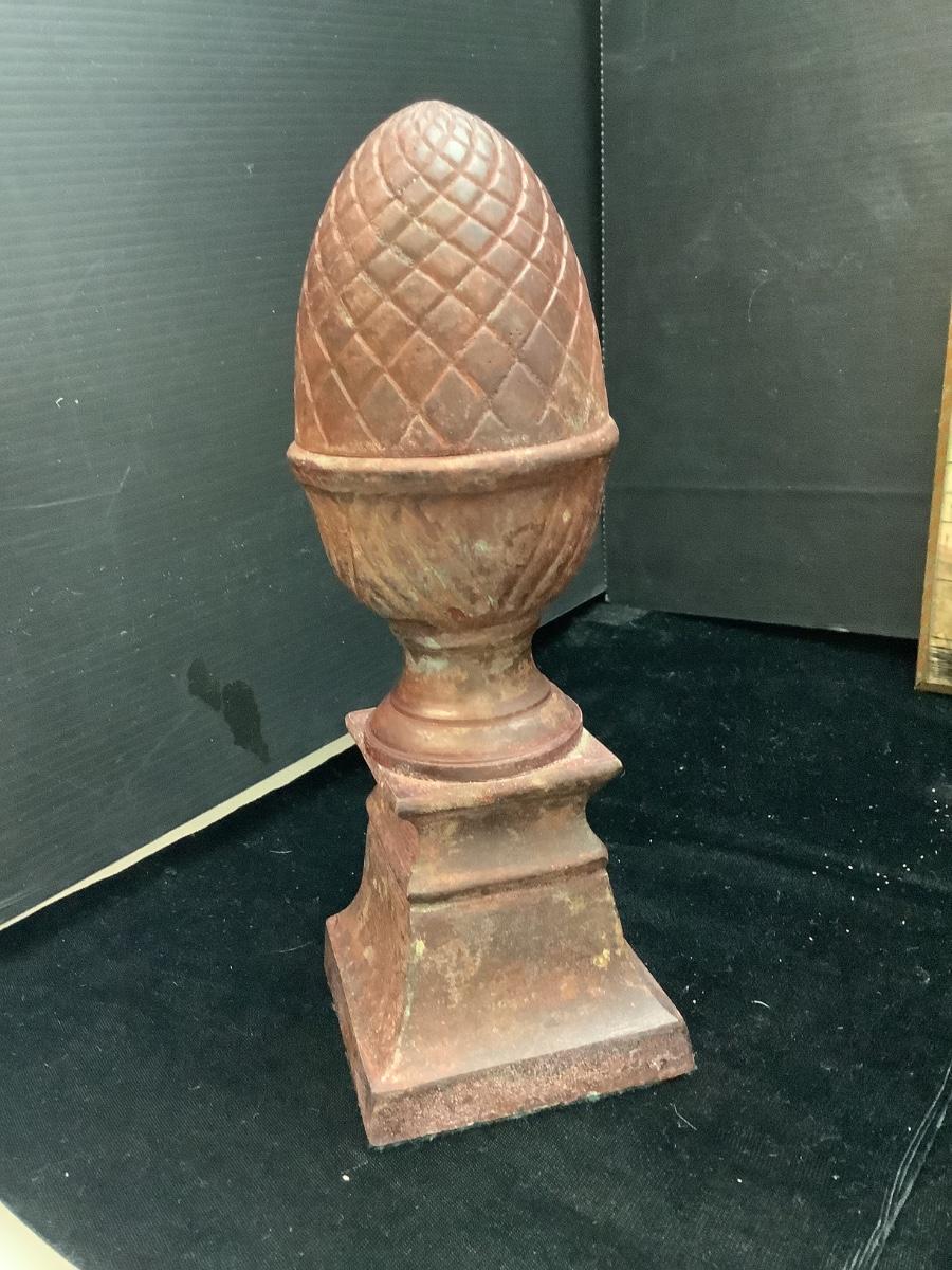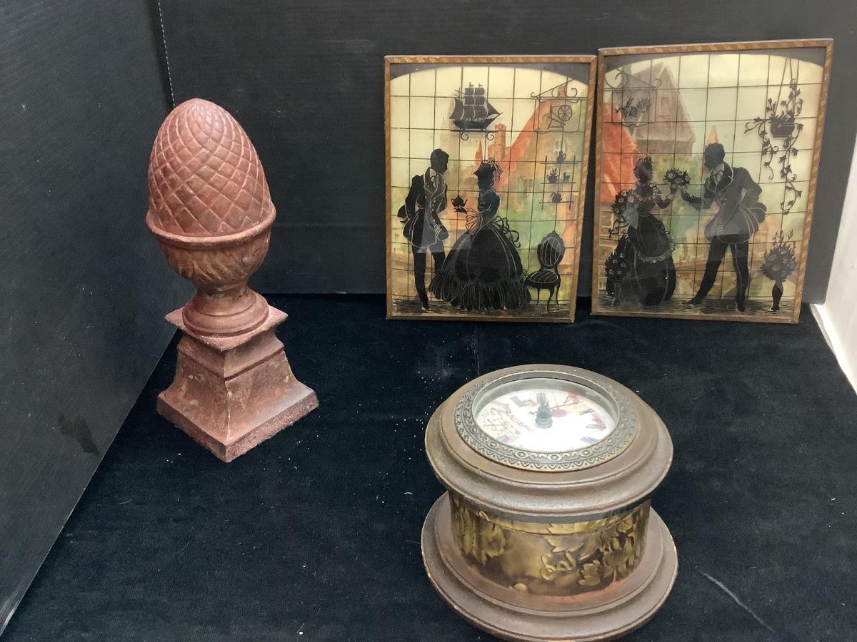 Cast Iron Pineapple Finial 9" high , victorian style framed silhouettes 8" x 6" , office desk clock box measuring 5" round