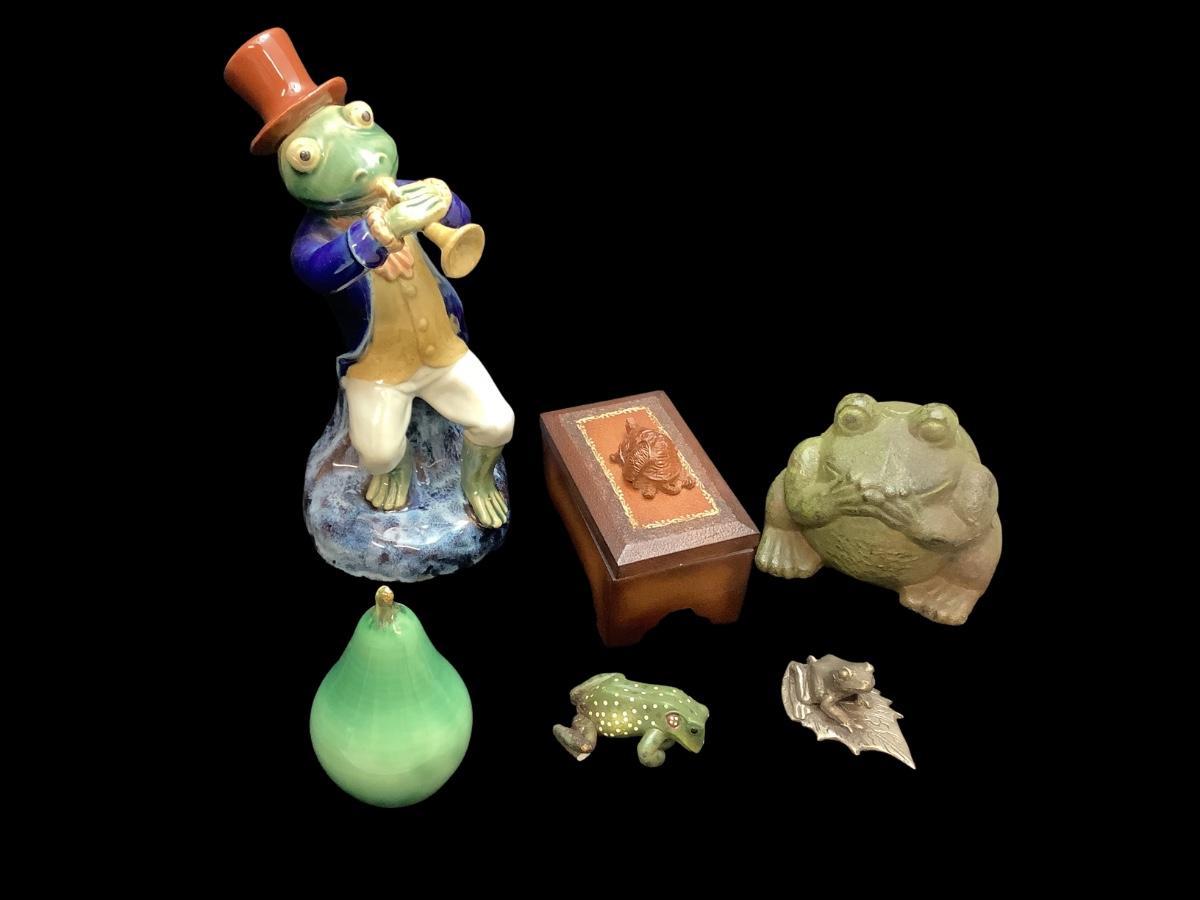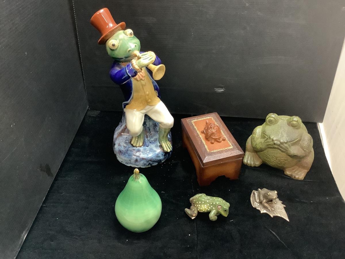 cast iron frog, metal frog paper weight, box with turtles, plastic frog decor, ceramic pear, pottery frog playing trumpet
