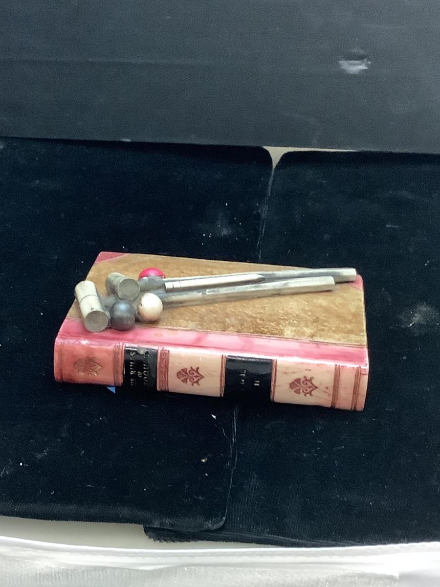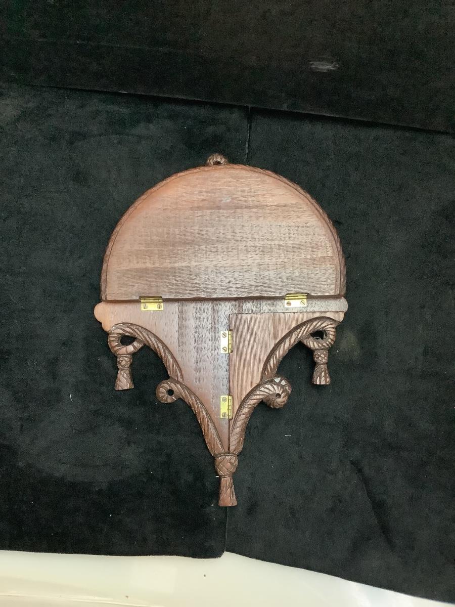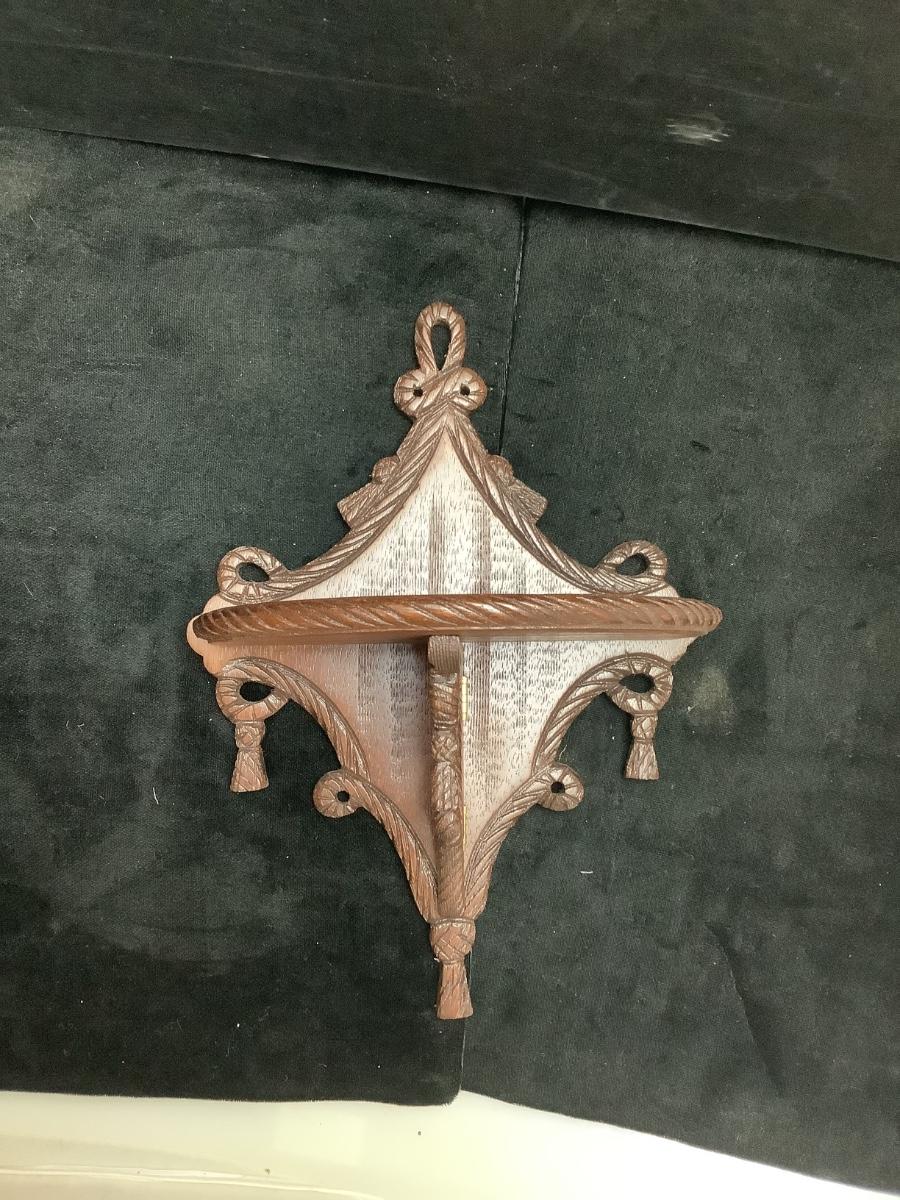 carved leaf decor, croquet book decor yard stick made into hanging shelf, wooden fish bowl , wooden tray, antique hinged wall shelf