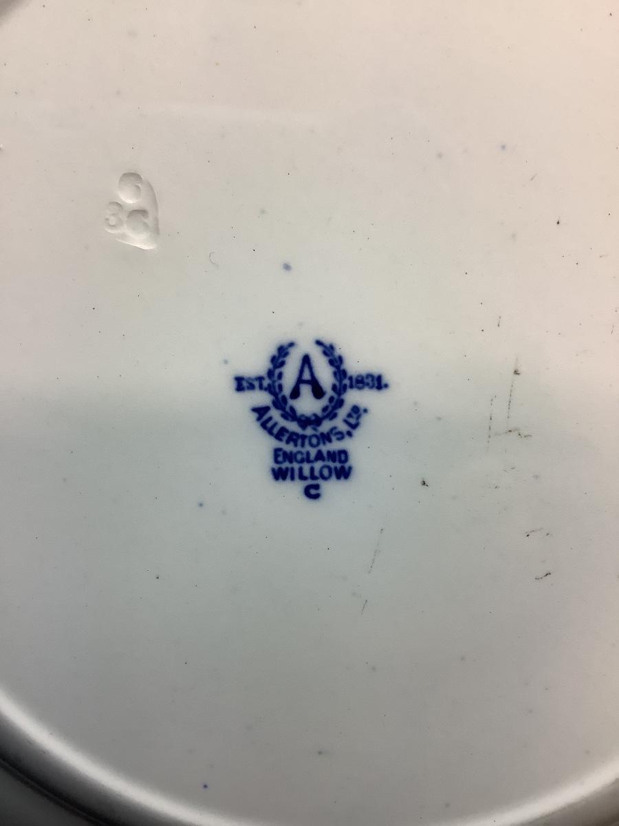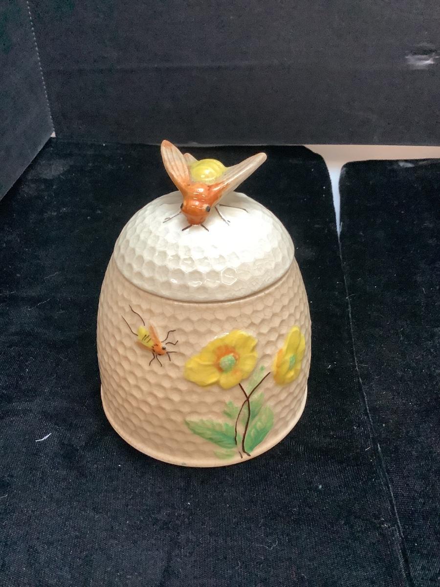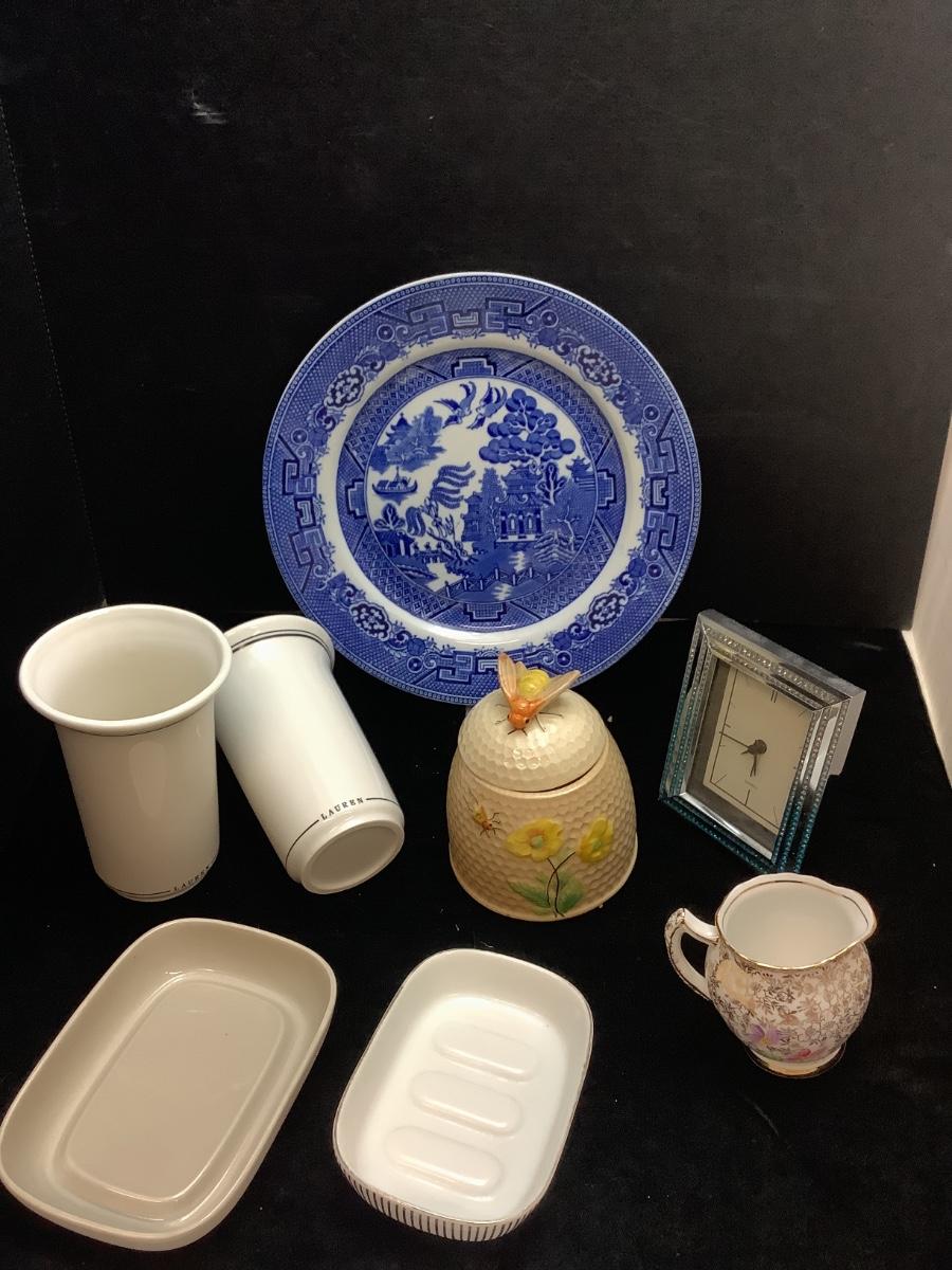 small clock , bee honey handpainted dish , phoenix bone china creamer, allertons blue china plate 2 soap dishes, two ralph lauren cups