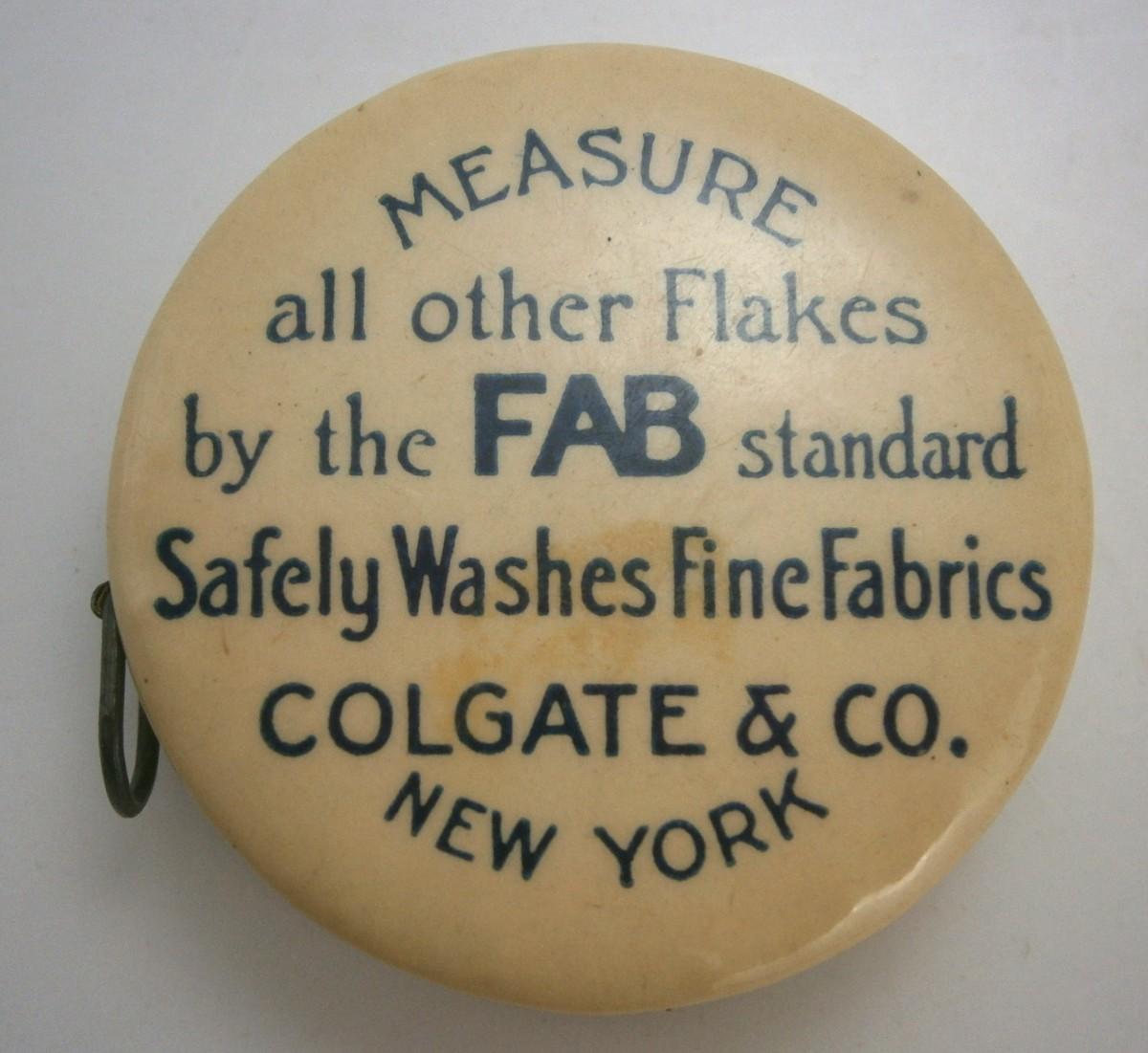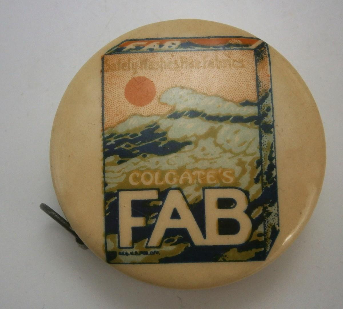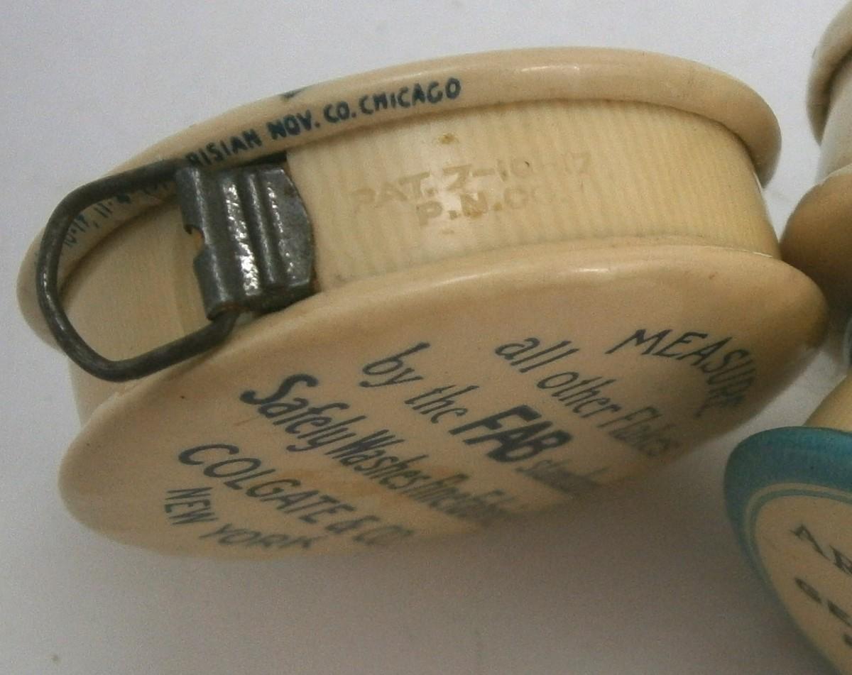FAB Early 1900's Advertising Tape Measures, celluloid over metal, 1 1/2 in. diameter, full tapes with original pull patented 1917 & 1919 by PARISIAN Novelty Co. of Chicago,