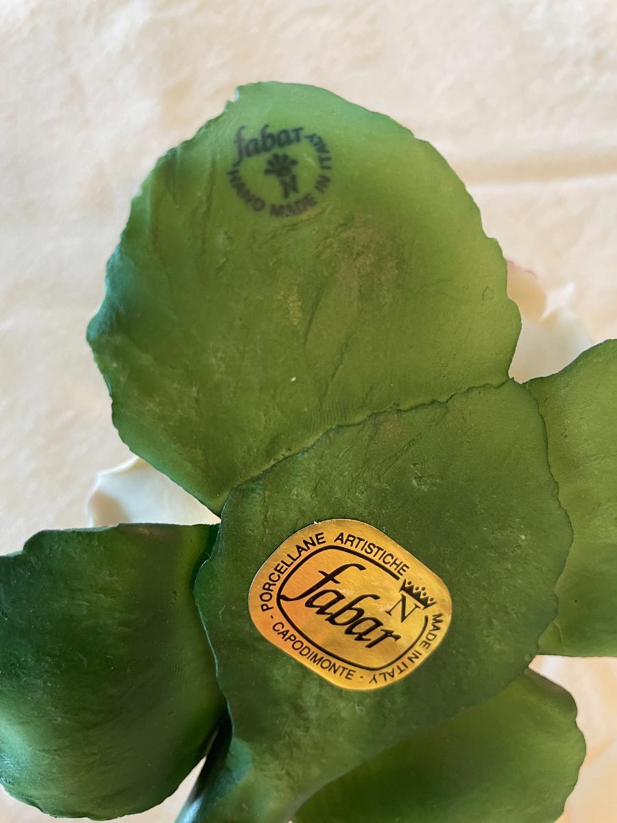 Handmade ceramic rose crafted by Fabar Italy, from the Porcellane Artistiche collection. Features a detailed design with green leaves and a stem measuring approximately 6.5 inches in length. The piece includes stamps on the back indicating the maker and origin, ensuring authenticity. The rose showcases delicate petals with tinges of purple. Overall condition appears intact and well-preserved.