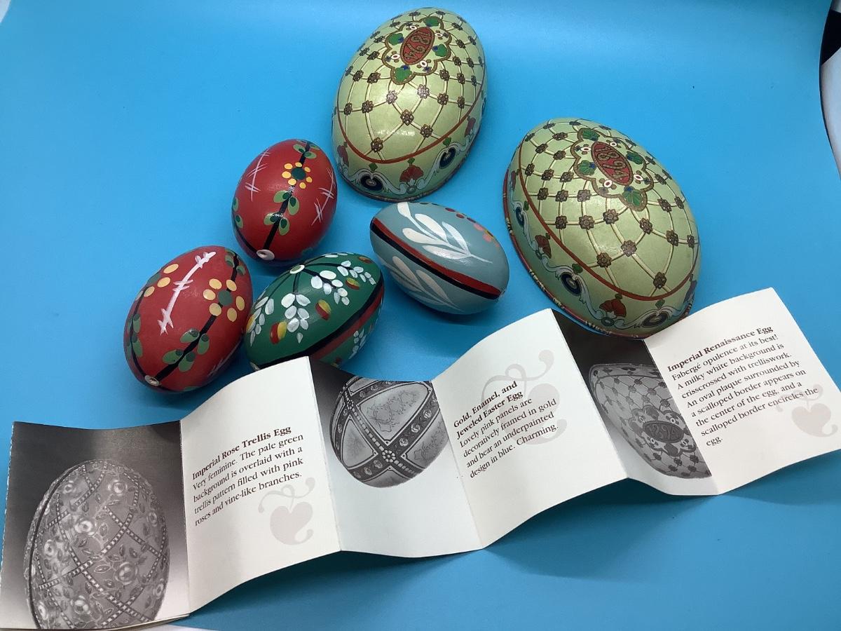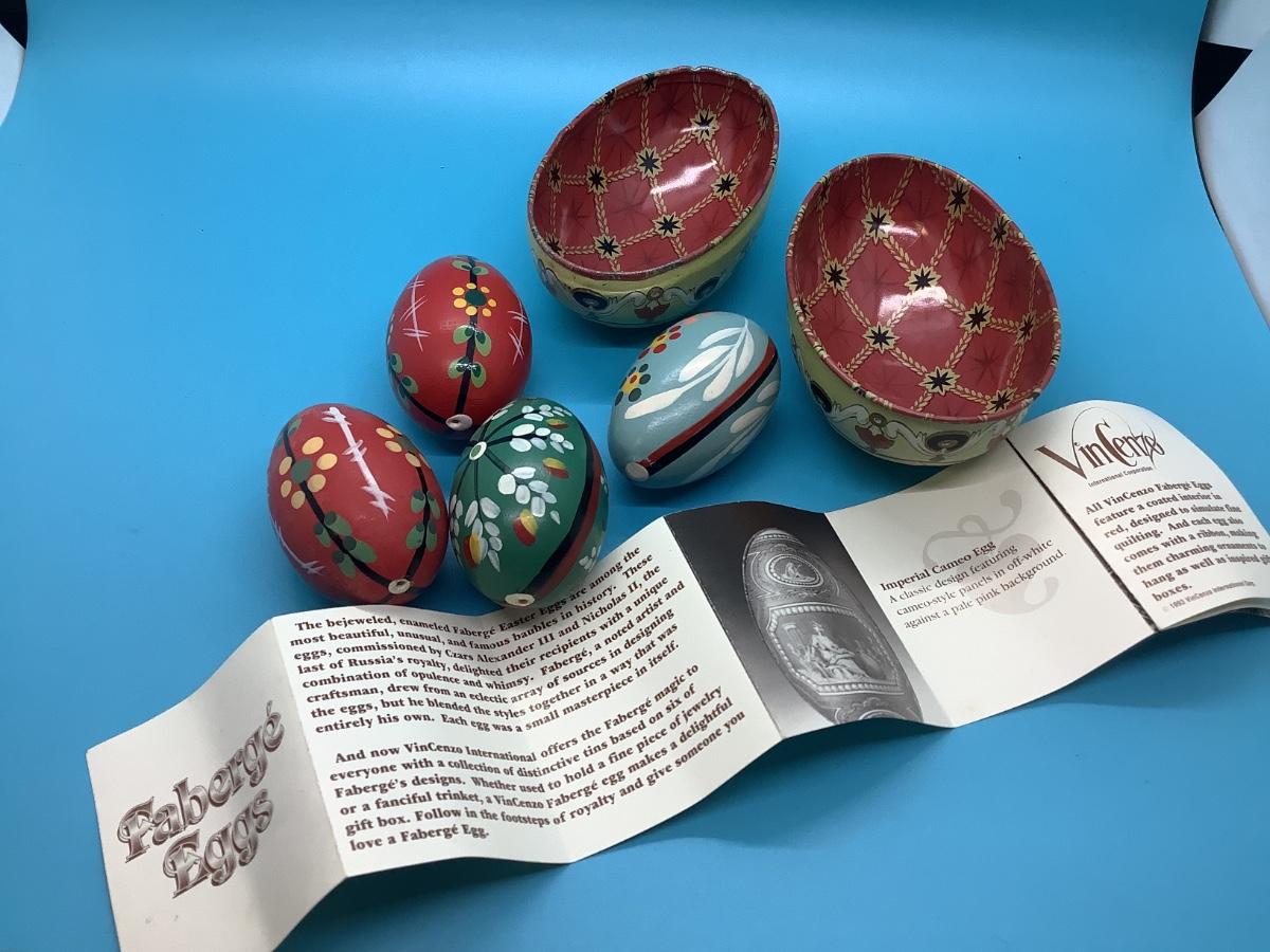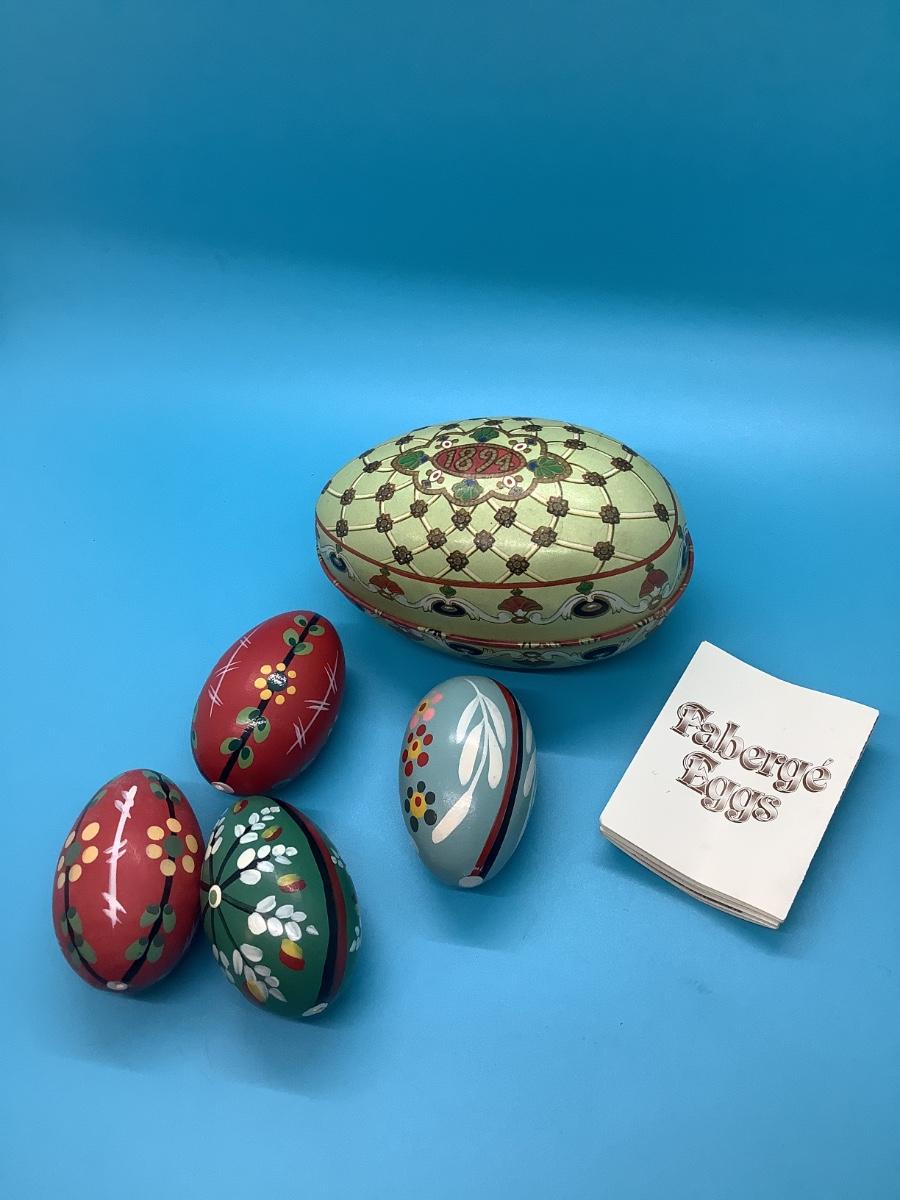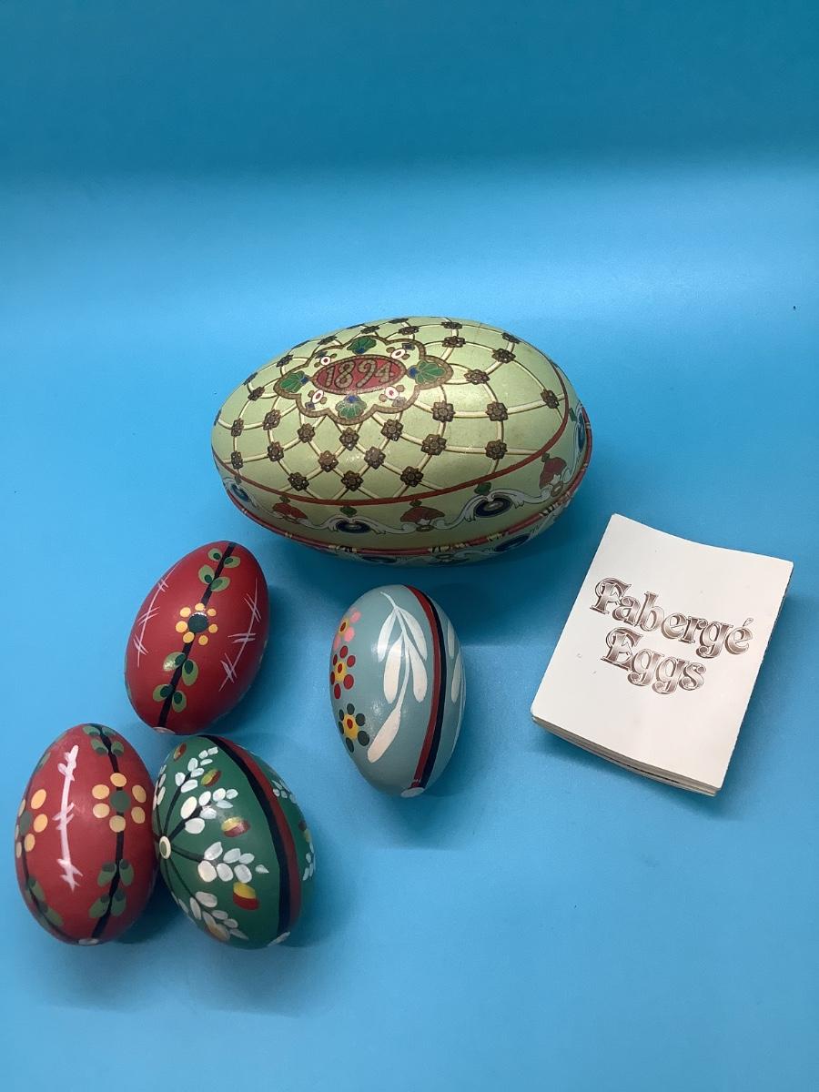 Faberge Metal Easter Egg and 4 wood painted eggs