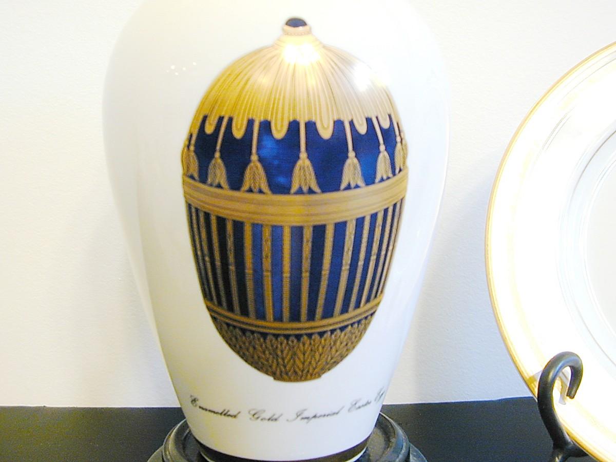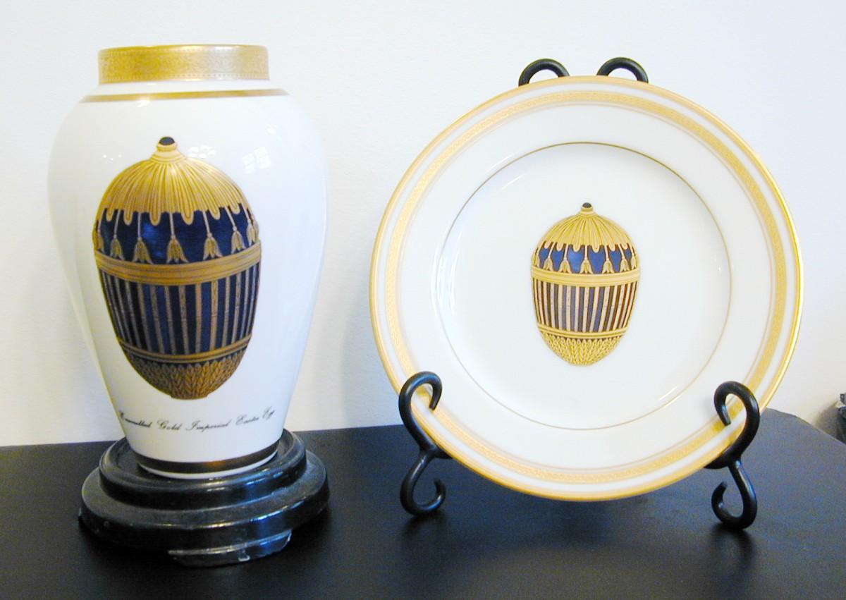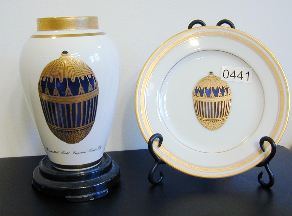 Faberge Porcelain Enameled Gilt Gold Egg Vase & Plate Lot 441