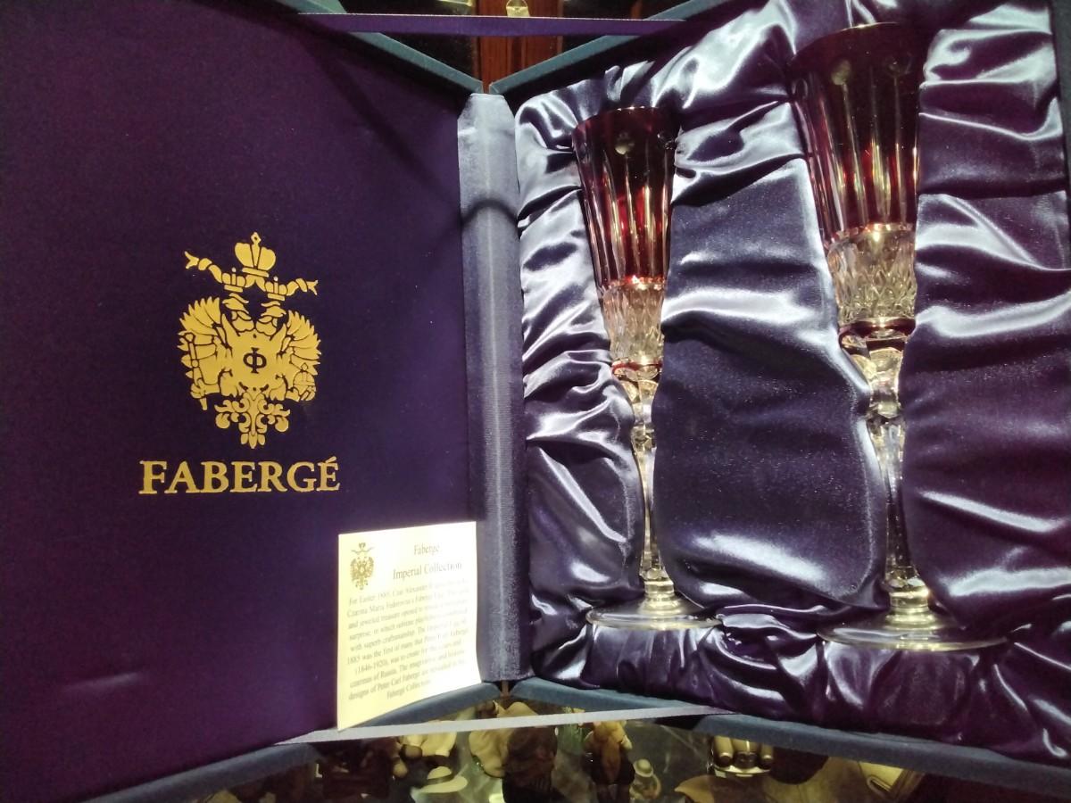 FABERGE Set of 2 XENIA Ruby Red Cut to Clear Crystal Champagne Flutes signed In presentation case
