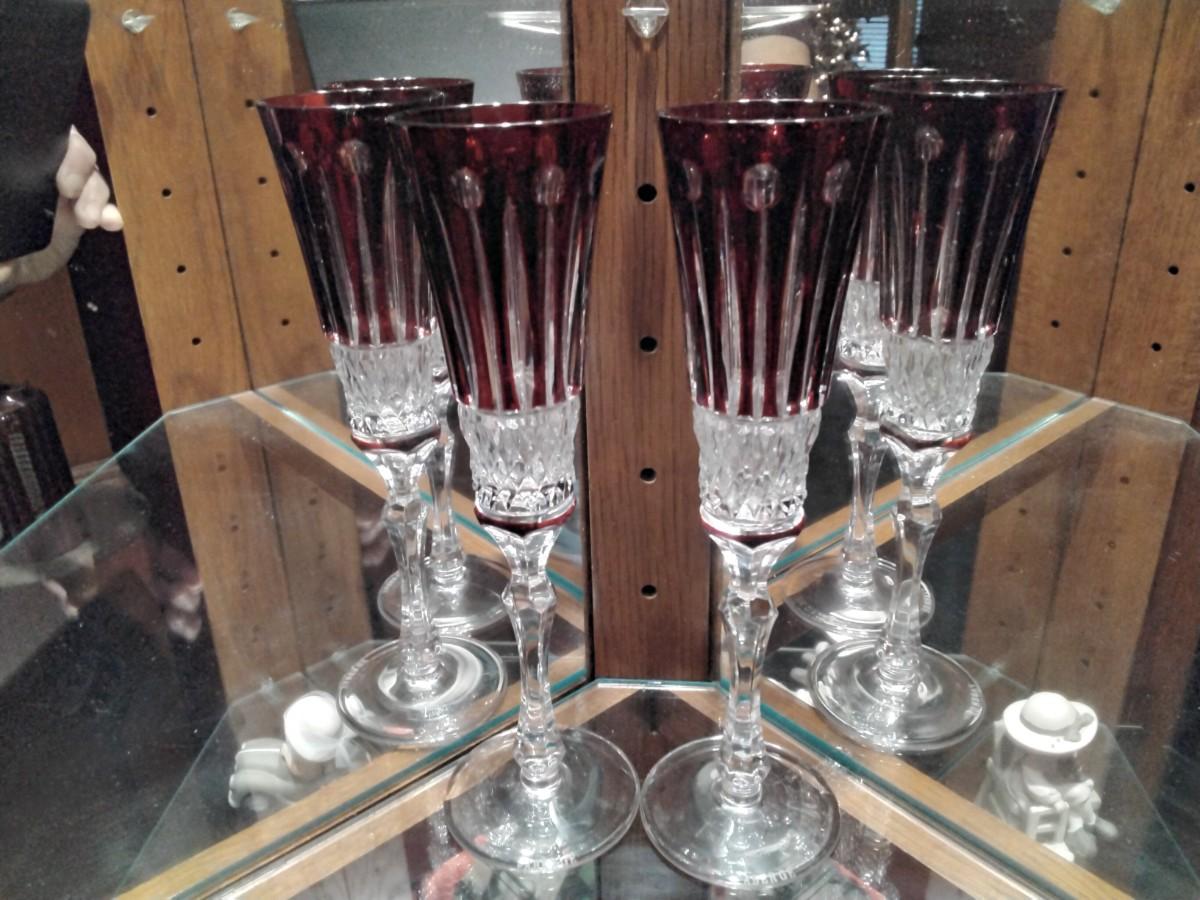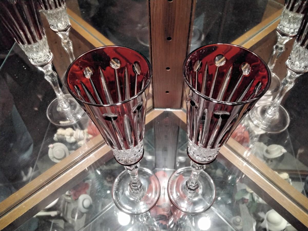 FABERGE Set of 2 XENIA Ruby Red Cut to Clear Crystal Champagne Flutes signed In presentation case