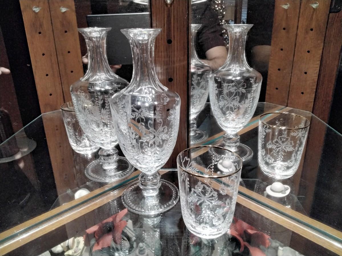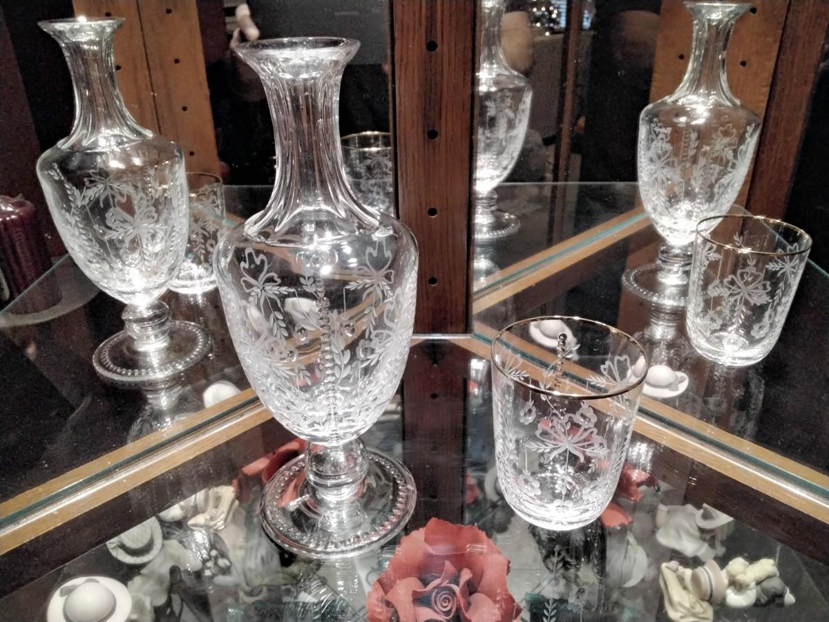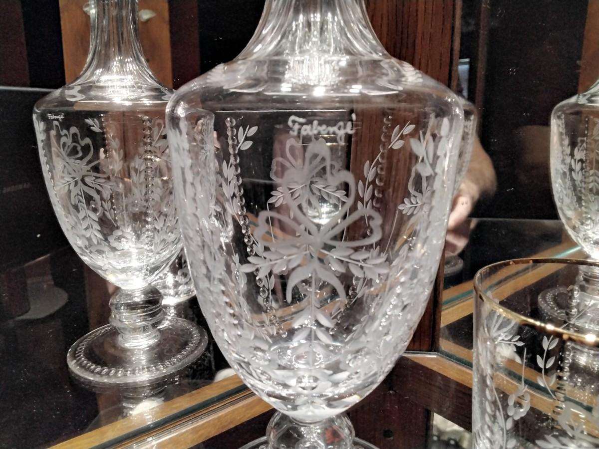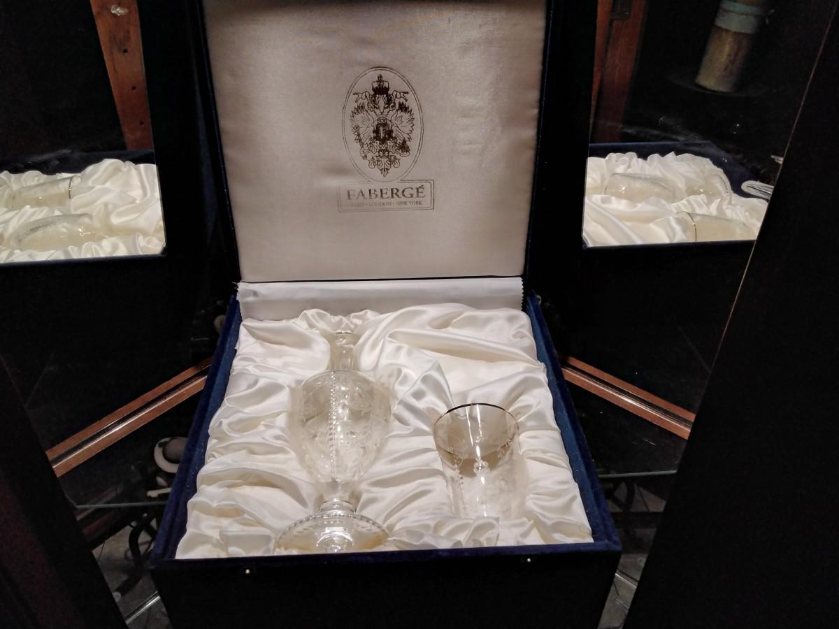 This is a new old stock Faberge Etched Crystal Decanter and Glass made in Slovenia. Comes in the original Faberge presentation silk lined blue velvet case. This beautiful Faberge Decanter has Faberge etched signature and has never been used, kept in storage.