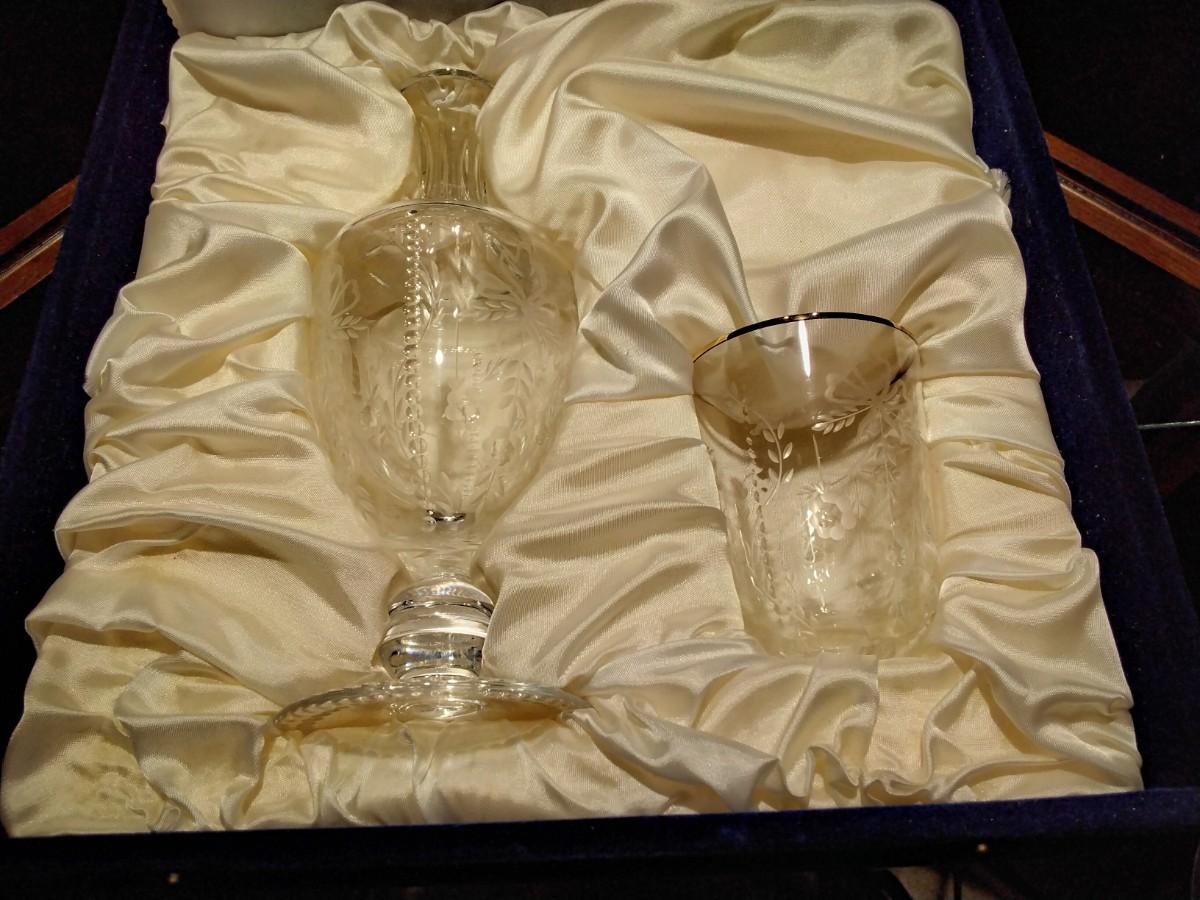 This is a new old stock Faberge Etched Crystal Decanter and Glass made in Slovenia. Comes in the original Faberge presentation silk lined blue velvet case. This beautiful Faberge Decanter has Faberge etched signature and has never been used, kept in storage.