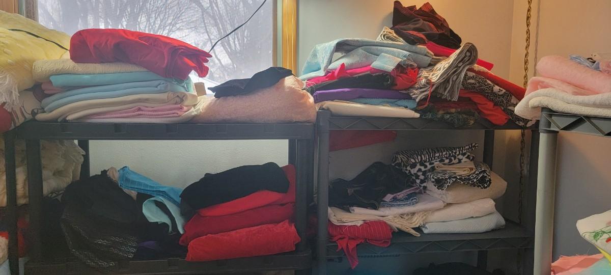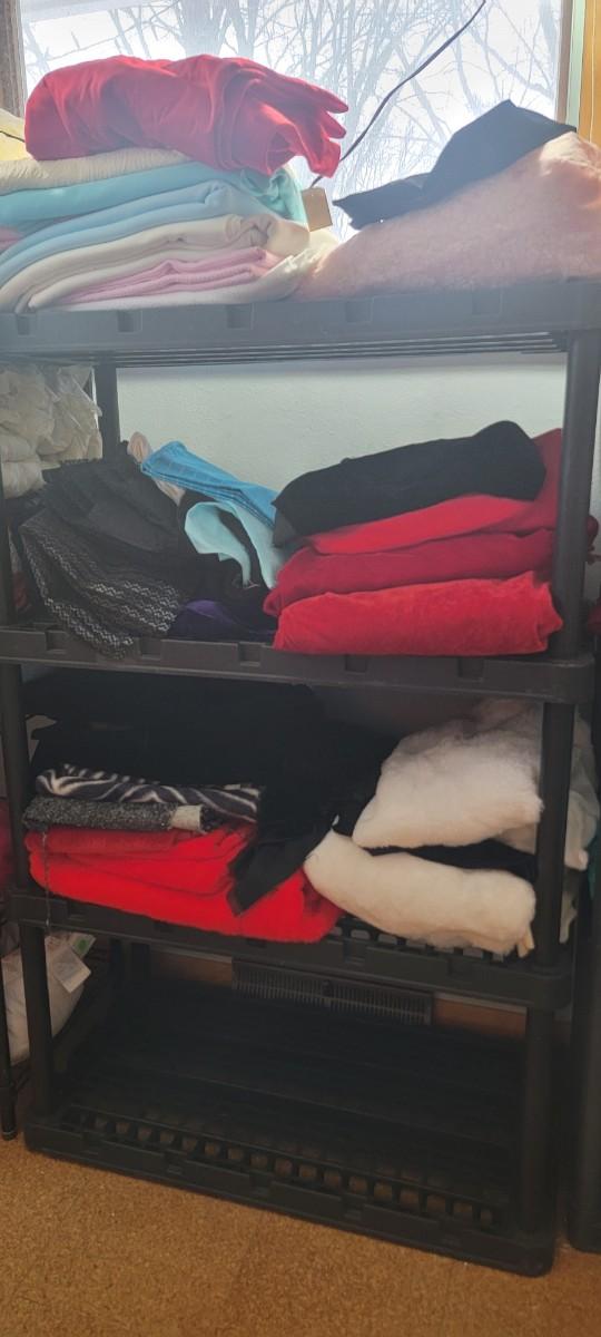 Fabric galore! Assorted colors and textures. Velvet, crushed velvet, polyester . Shelving units excluded.
