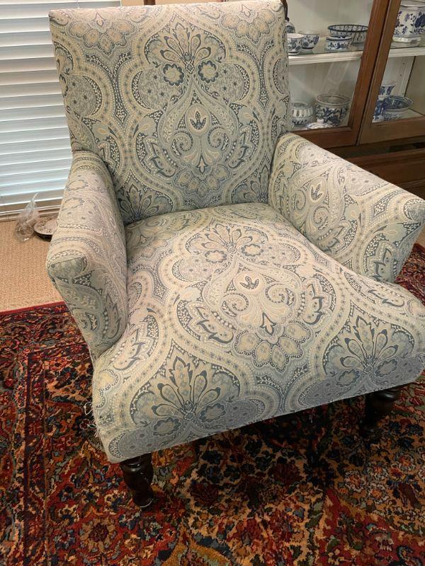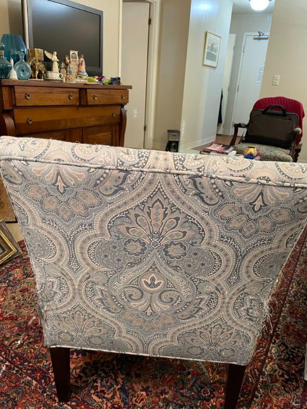 Vintage Fabric covered sitting chair- the back has several pull material pull marks on lower left leg
