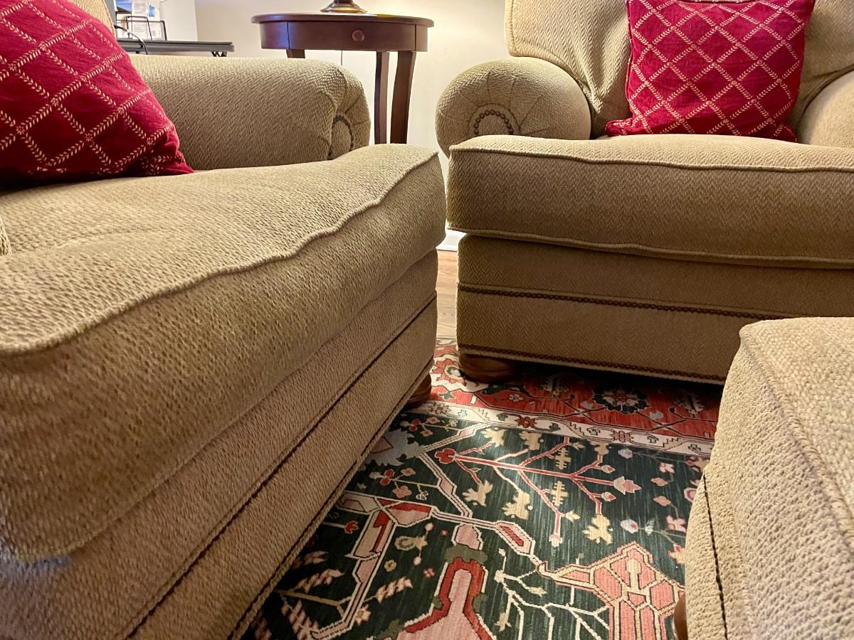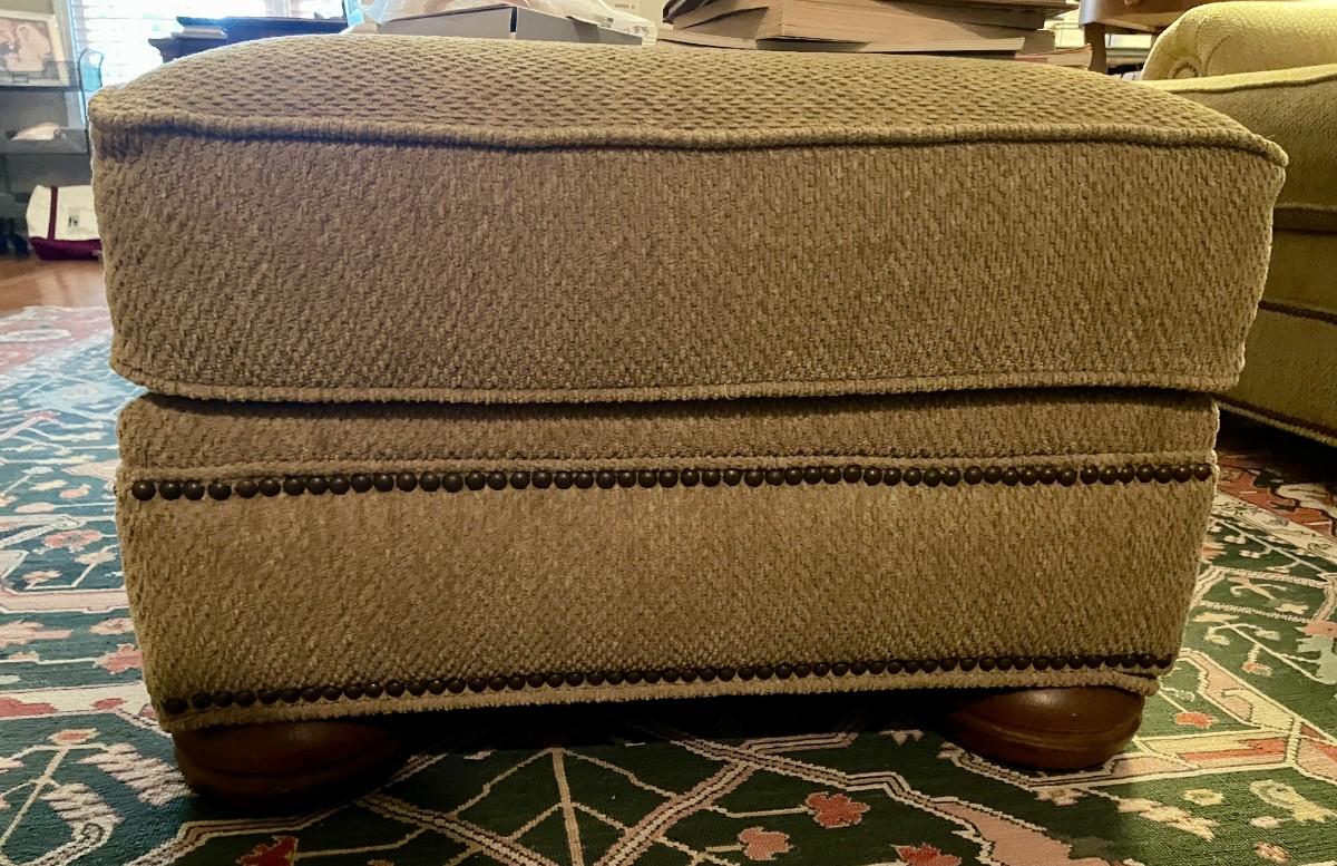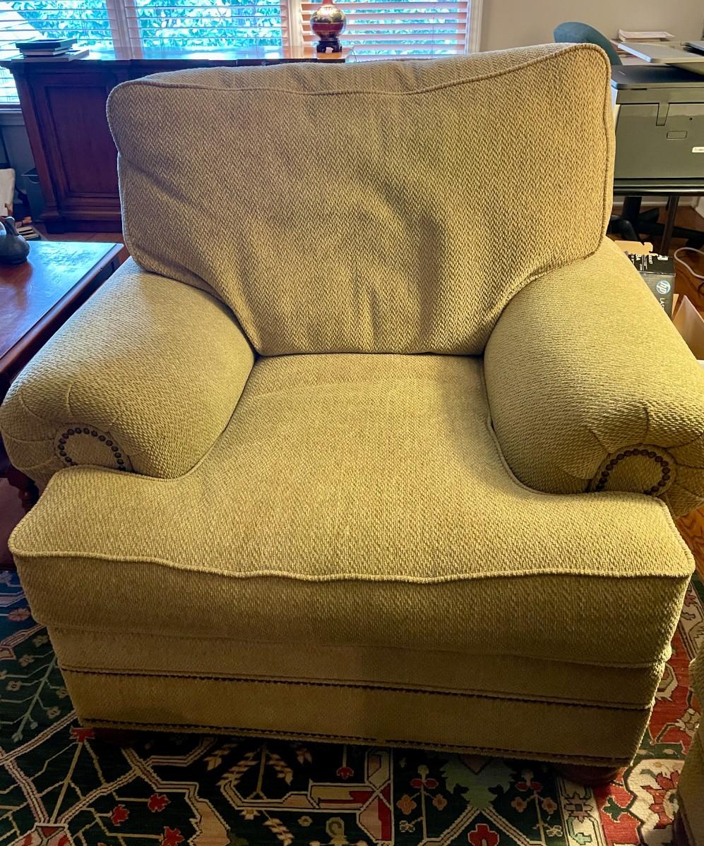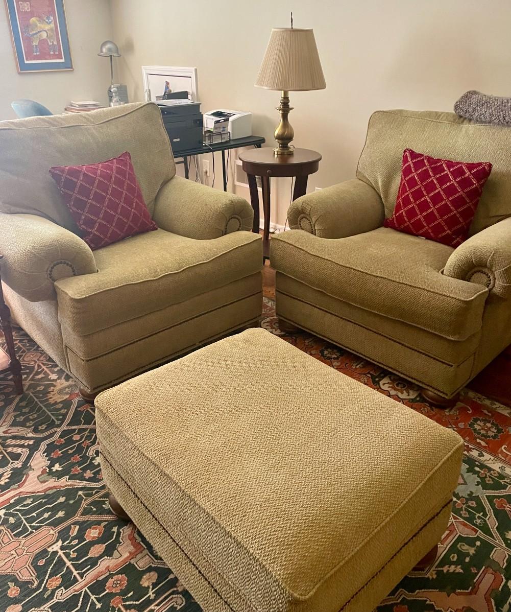 2 Comfortable Chairs and Ottoman, Fabric is Gold. Great Condition! Chairs are $175 each and Ottoman is $100. Will sell separately.