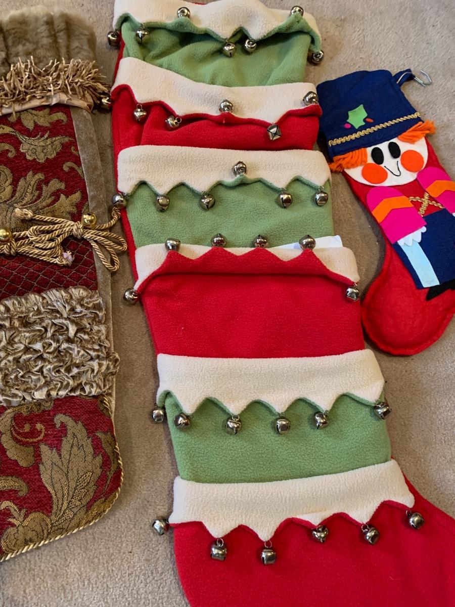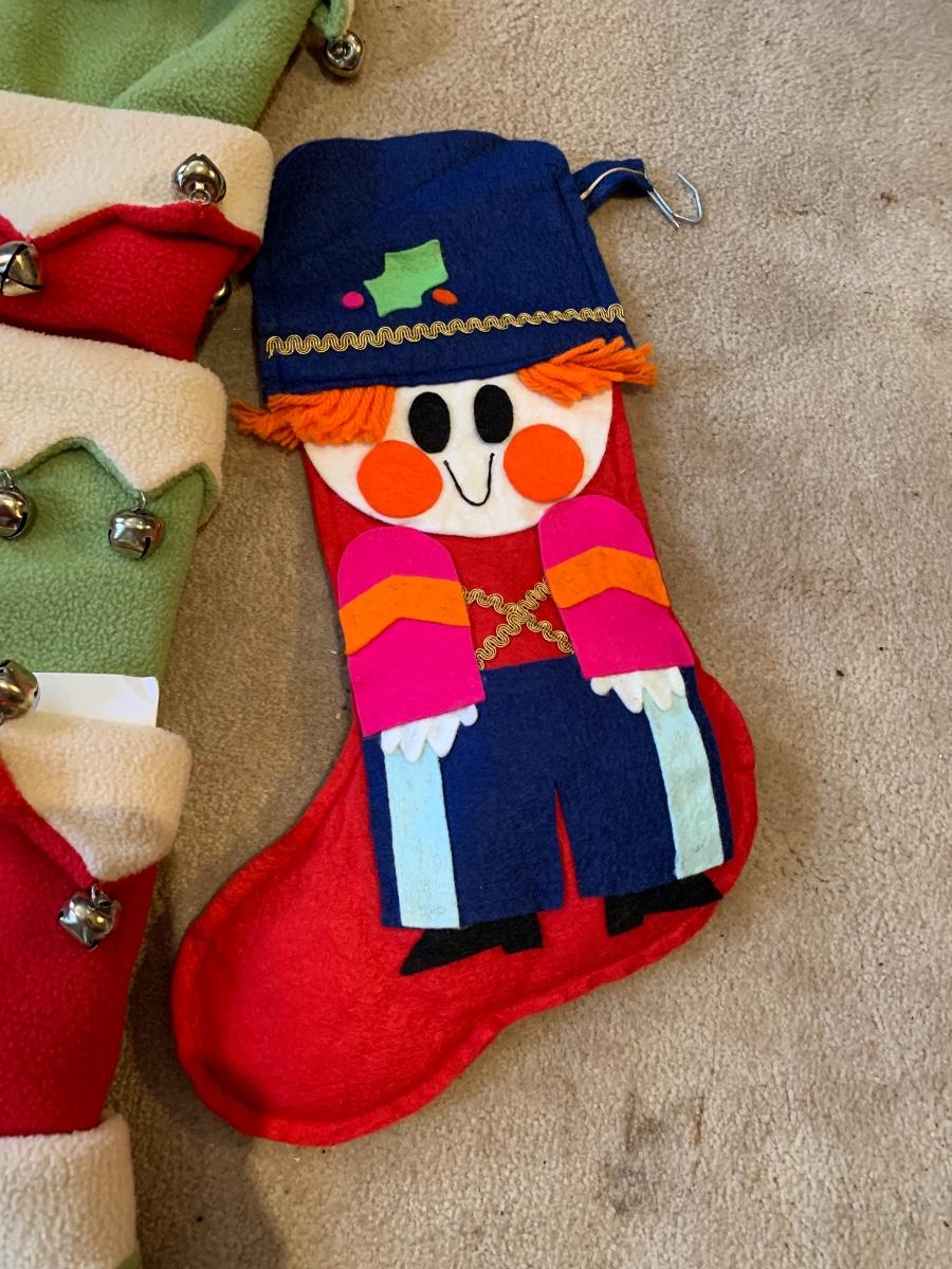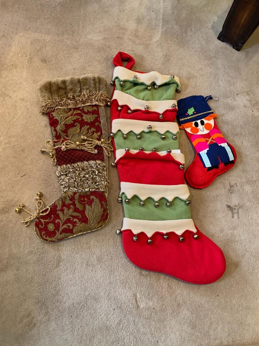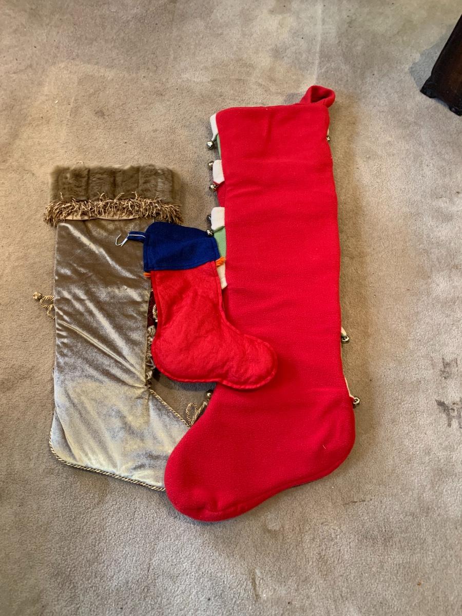 CHristmas stocking collection: one smaller felt soldier,. one larger stocking made of brocade and thick braid trim, one very large with bells for trim.