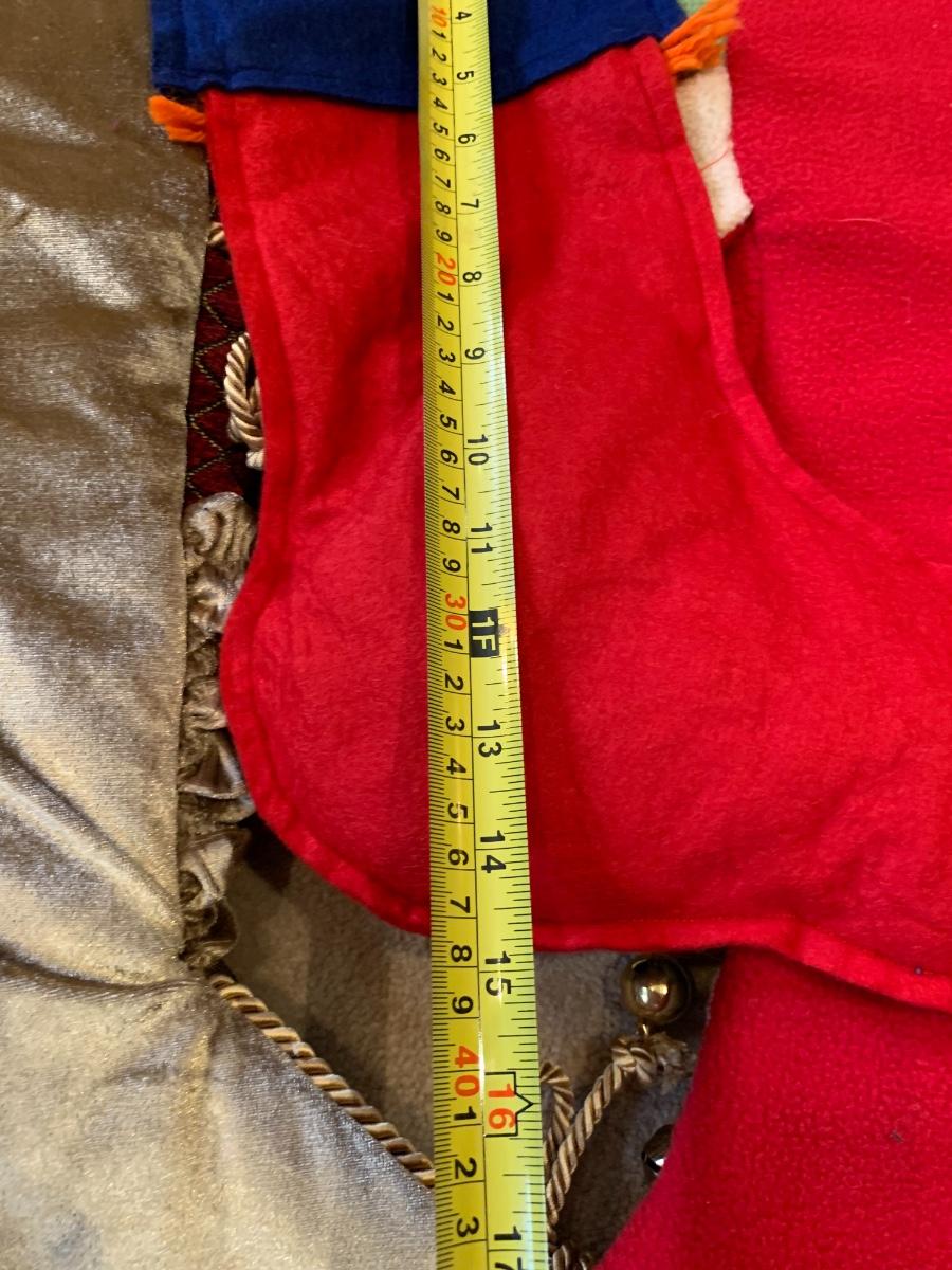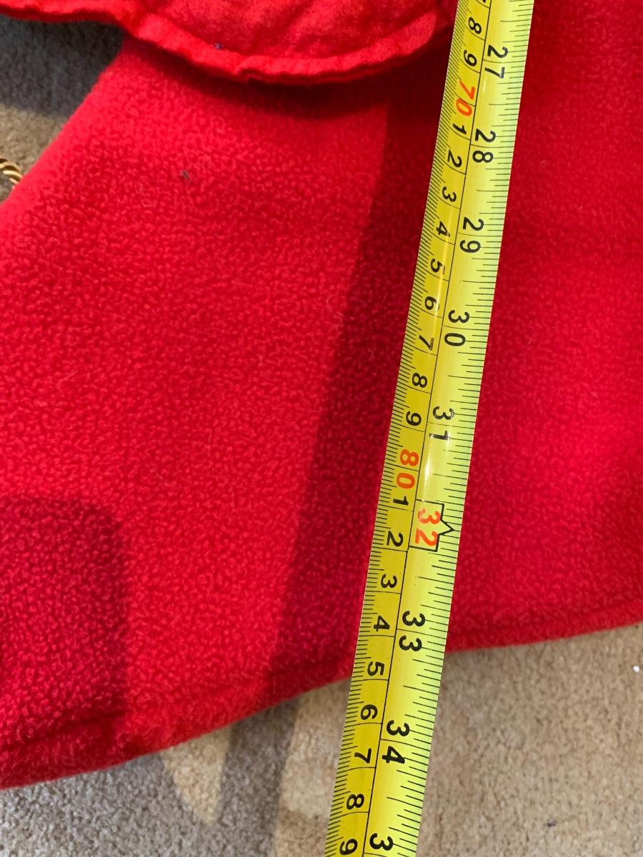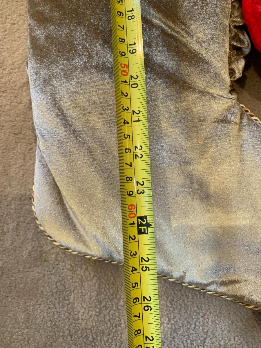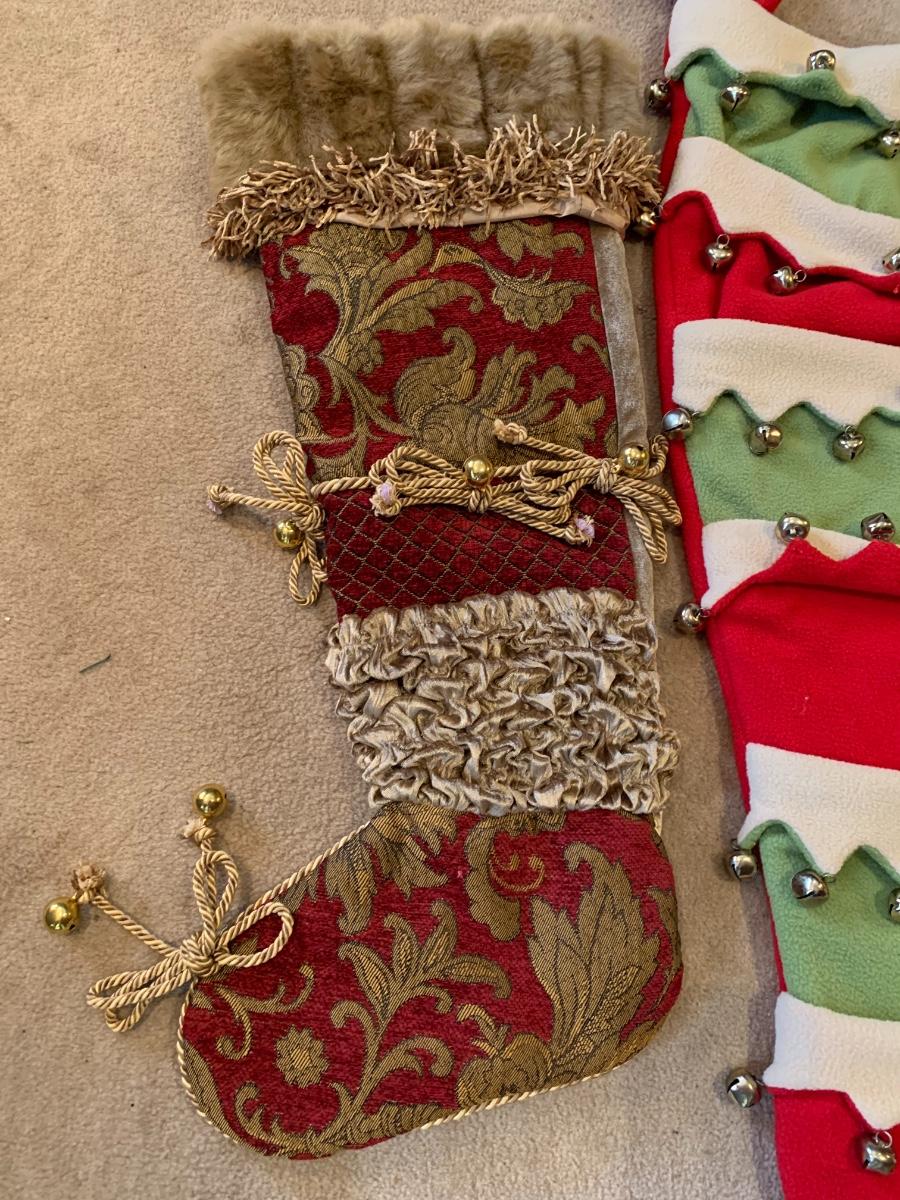 CHristmas stocking collection: one smaller felt soldier,. one larger stocking made of brocade and thick braid trim, one very large with bells for trim.