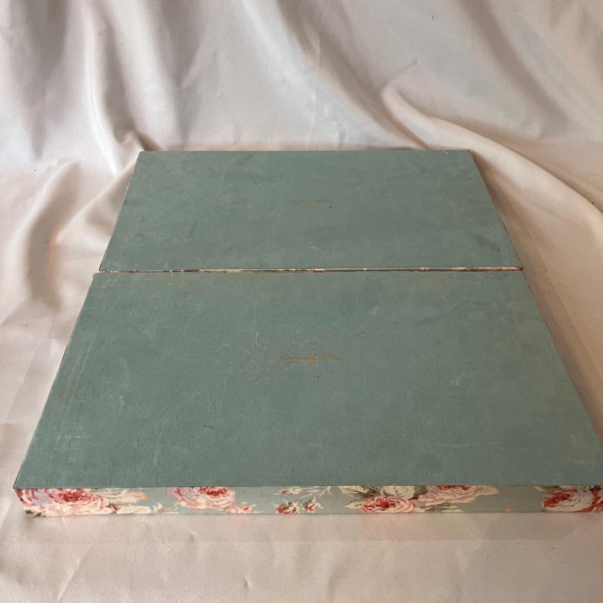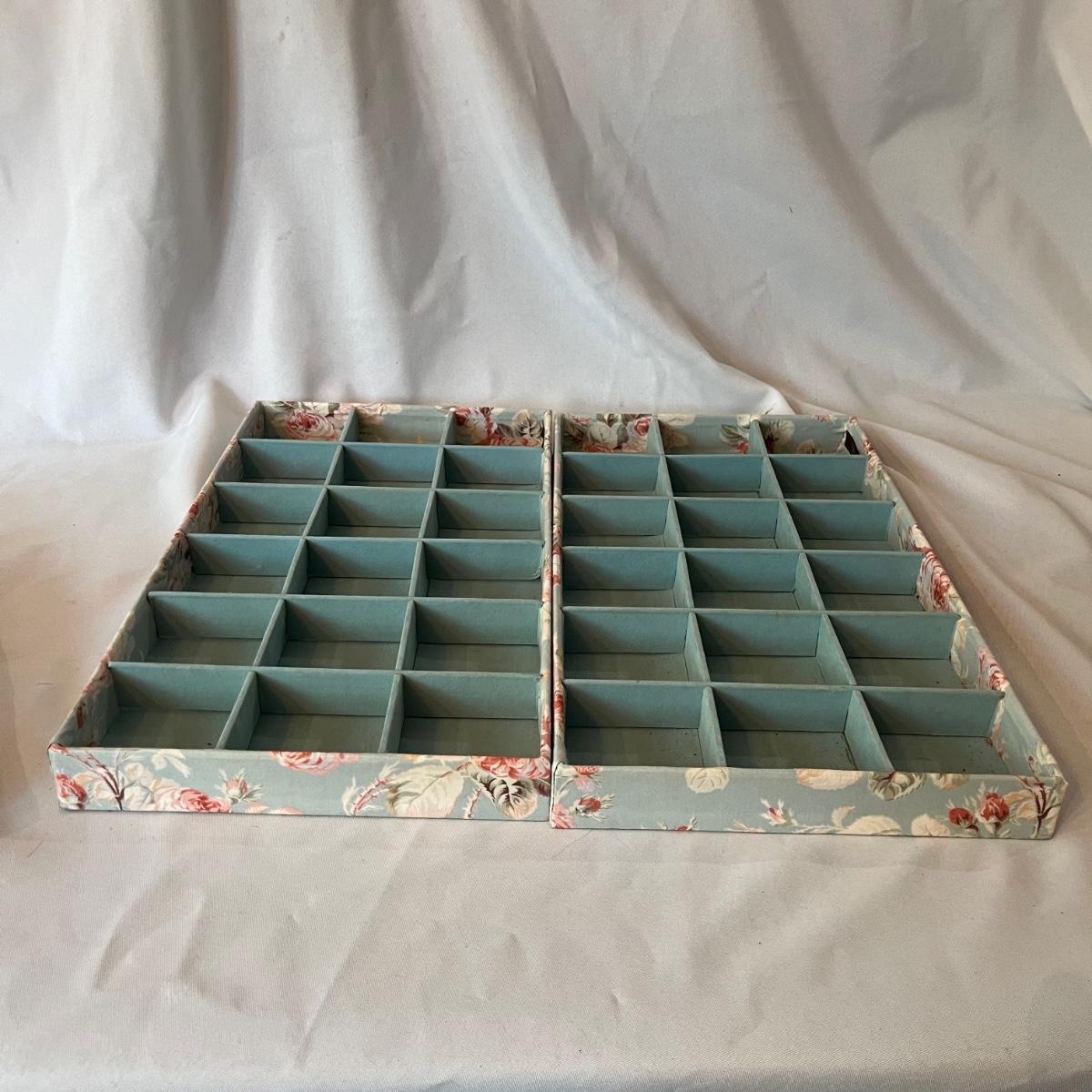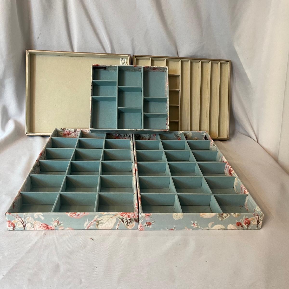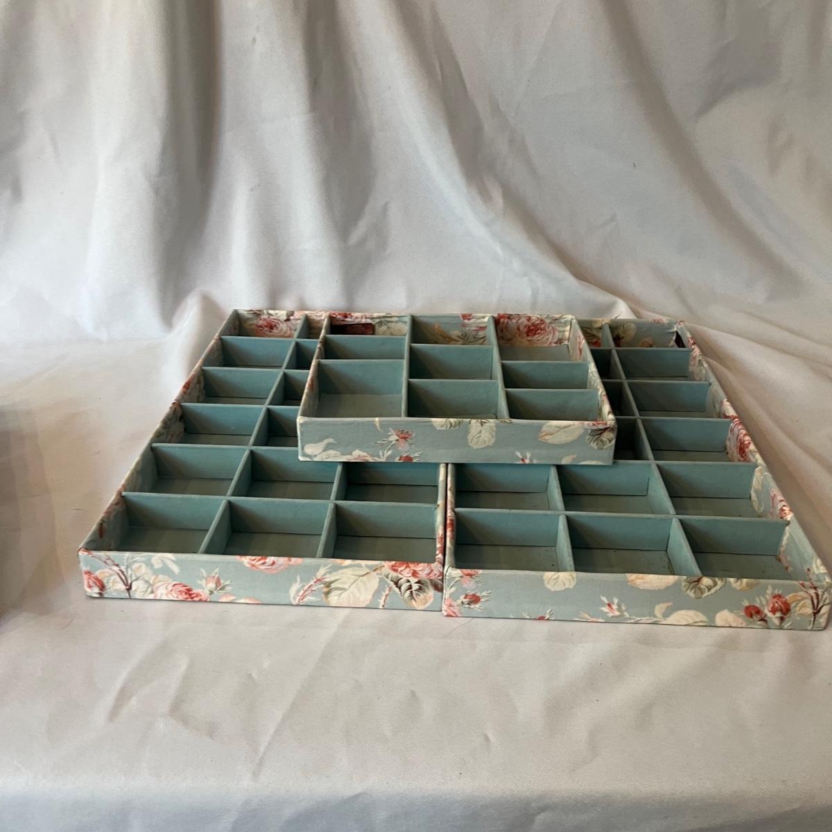 Lot includes three floral design fabric covered organizing trays and two matching fabric covered organizing trays. Largest trays measure 9” x 16” 1.75”H.