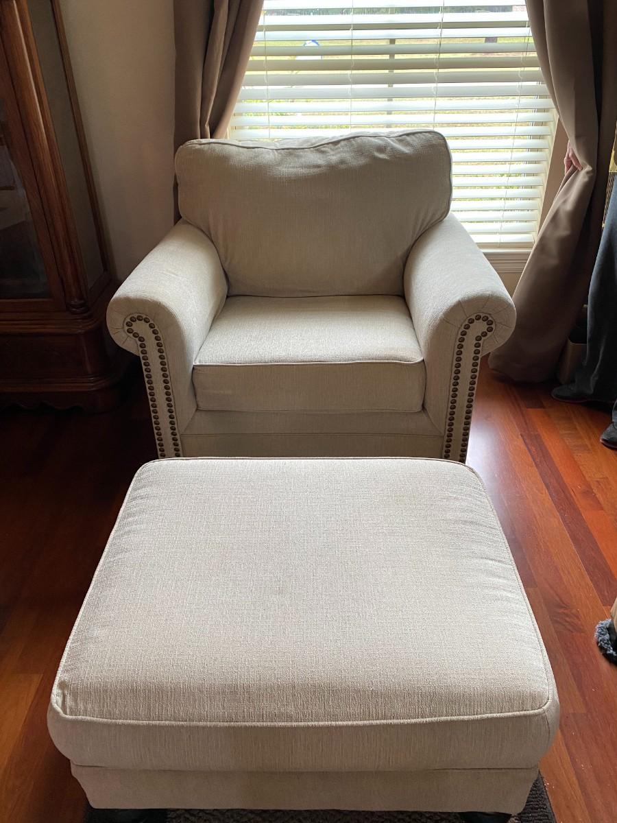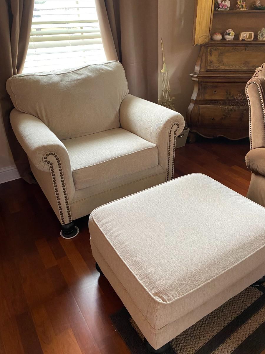 Fabric cream-colored upholstered chair with ottoman. Ashley Furniture. Brass nail head trim. Very good condition. Approx. 40" W x 38" H x 38" D. Ottoman is approx. 29-1/2" W x 24" D x 17-1/2" H