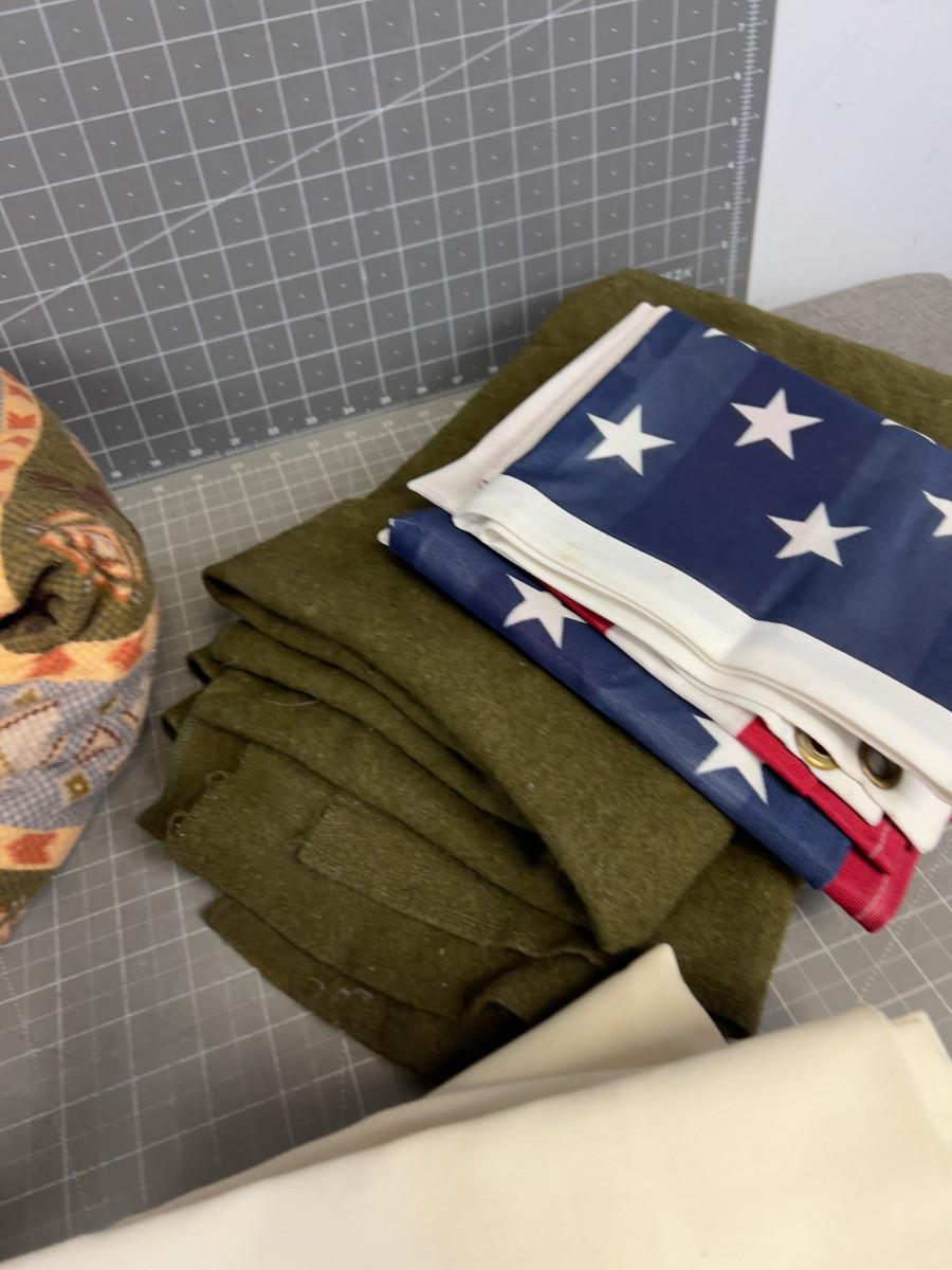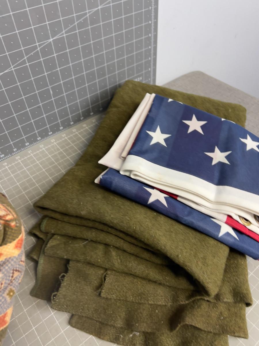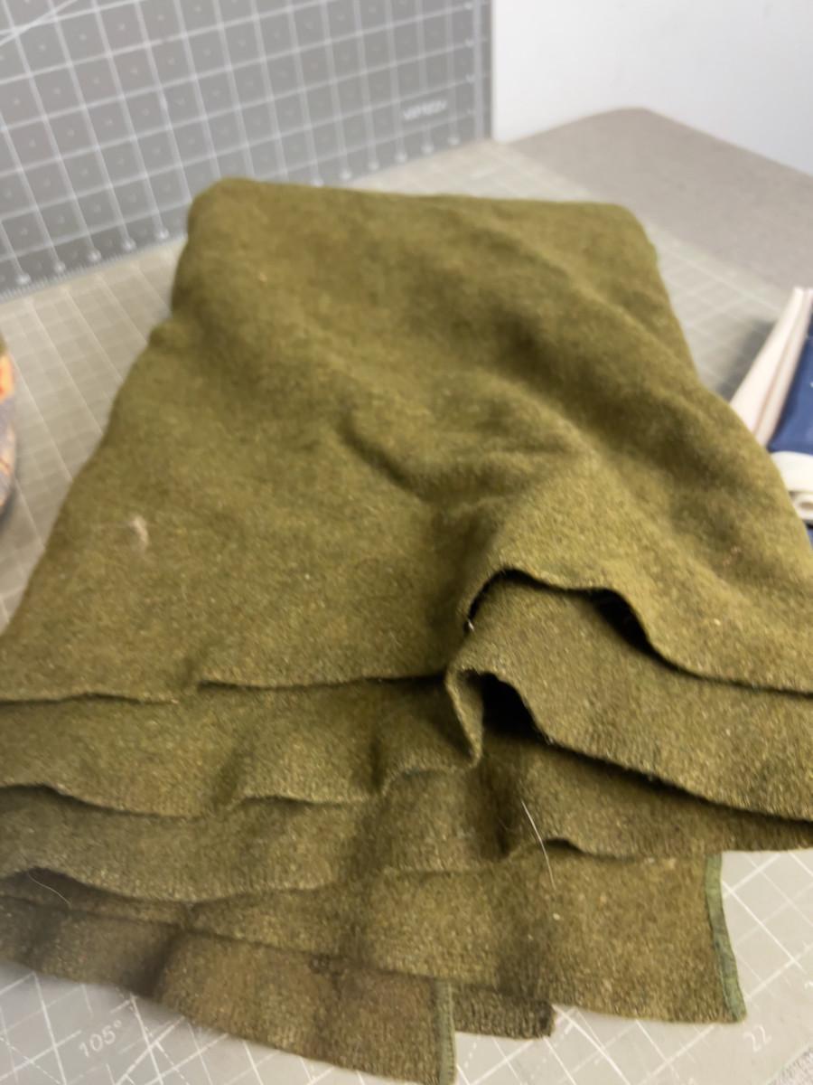 Used Usable. New. The Army Blanket has been cut in half. Upcycle. Fabric is precious now that JoAnn's is gone.