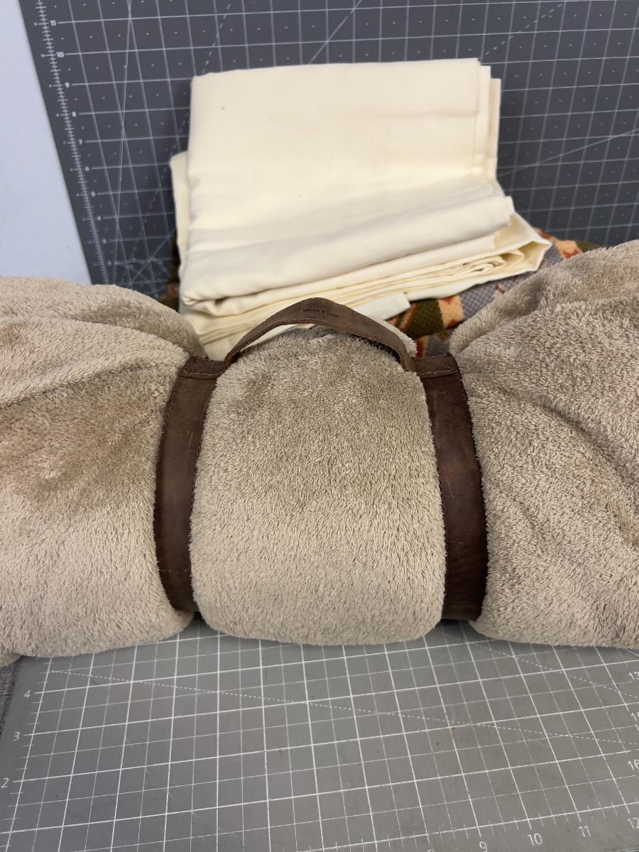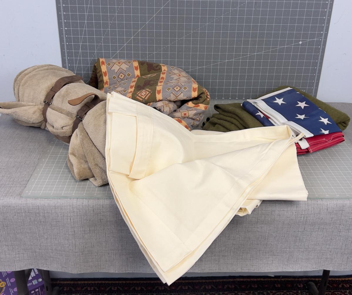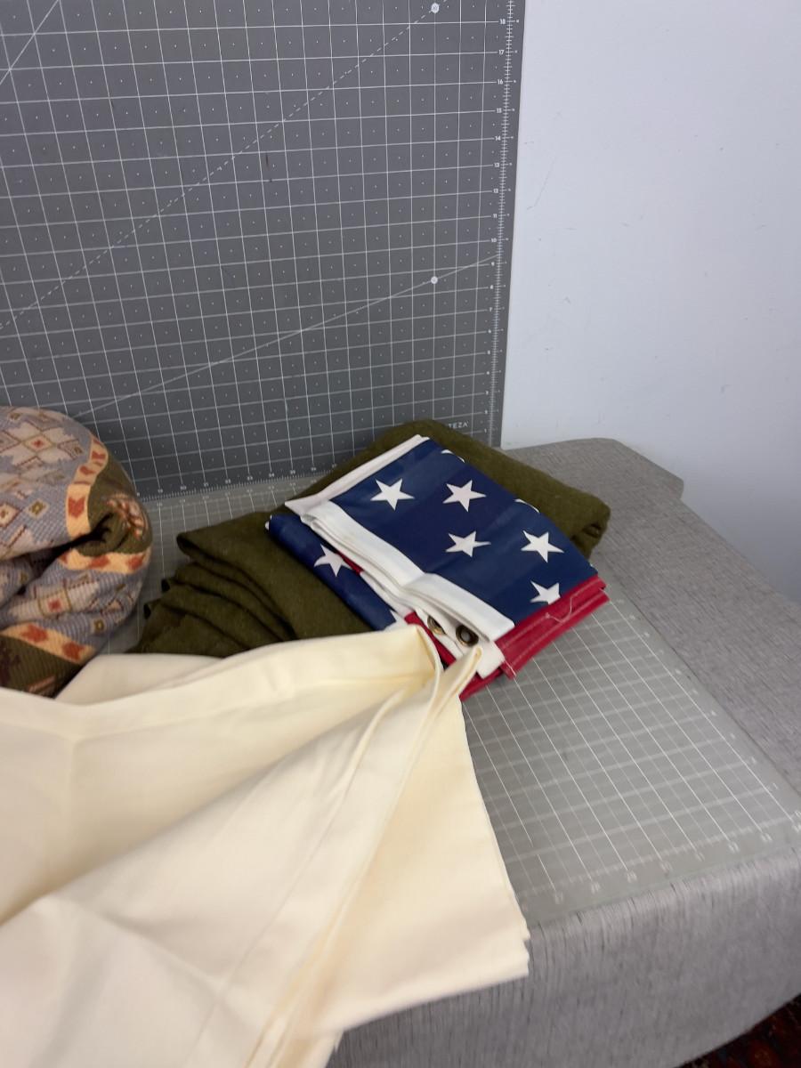 Used Usable. New. The Army Blanket has been cut in half. Upcycle. Fabric is precious now that JoAnn's is gone.