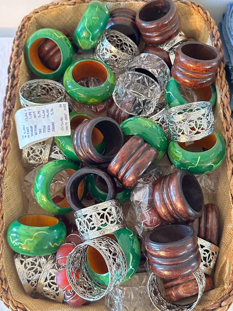 Fabric Napkin Sets and Loads of Napkin Rings in Basket