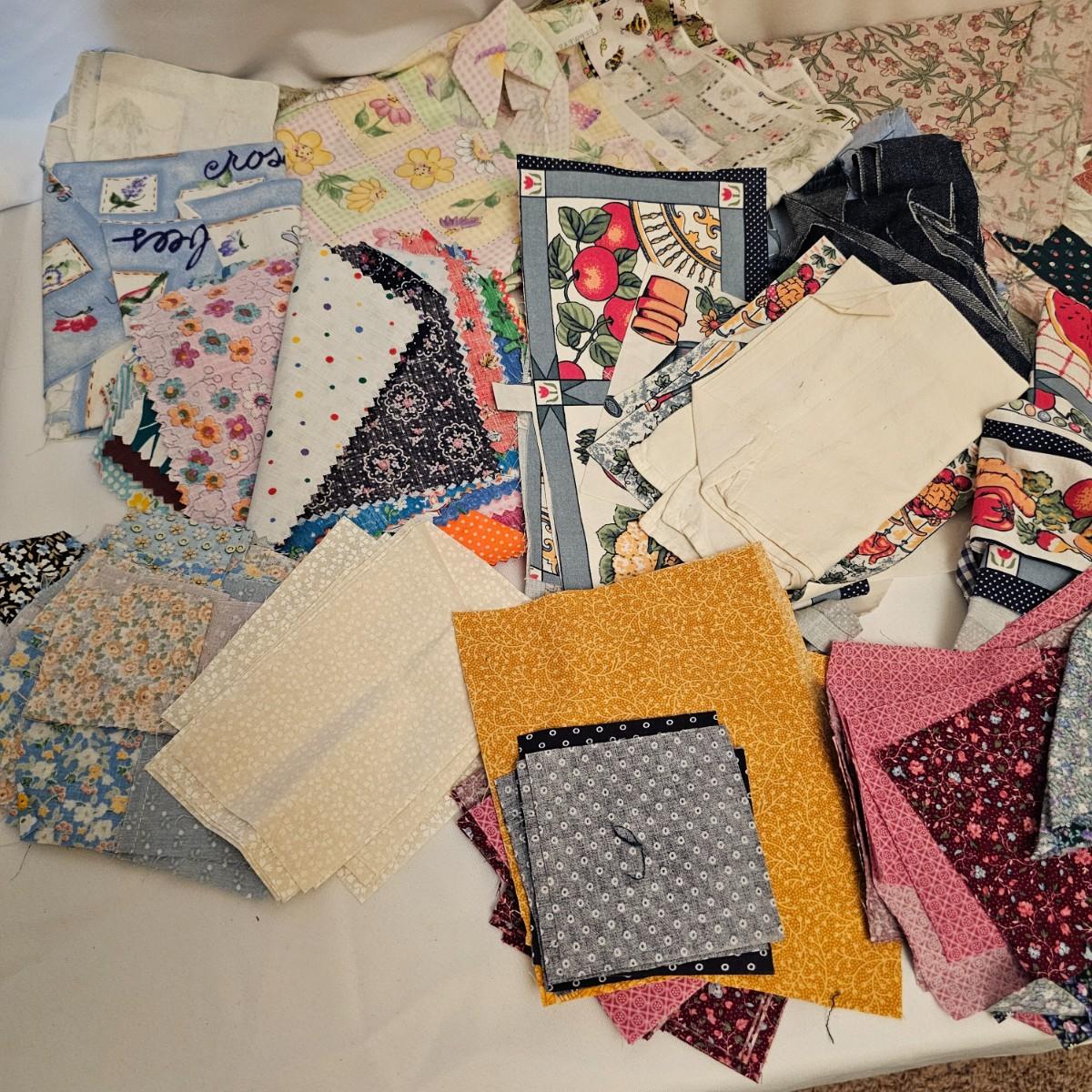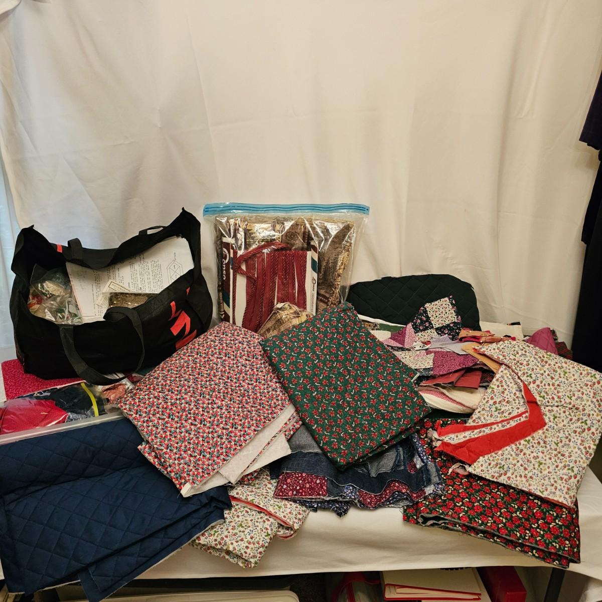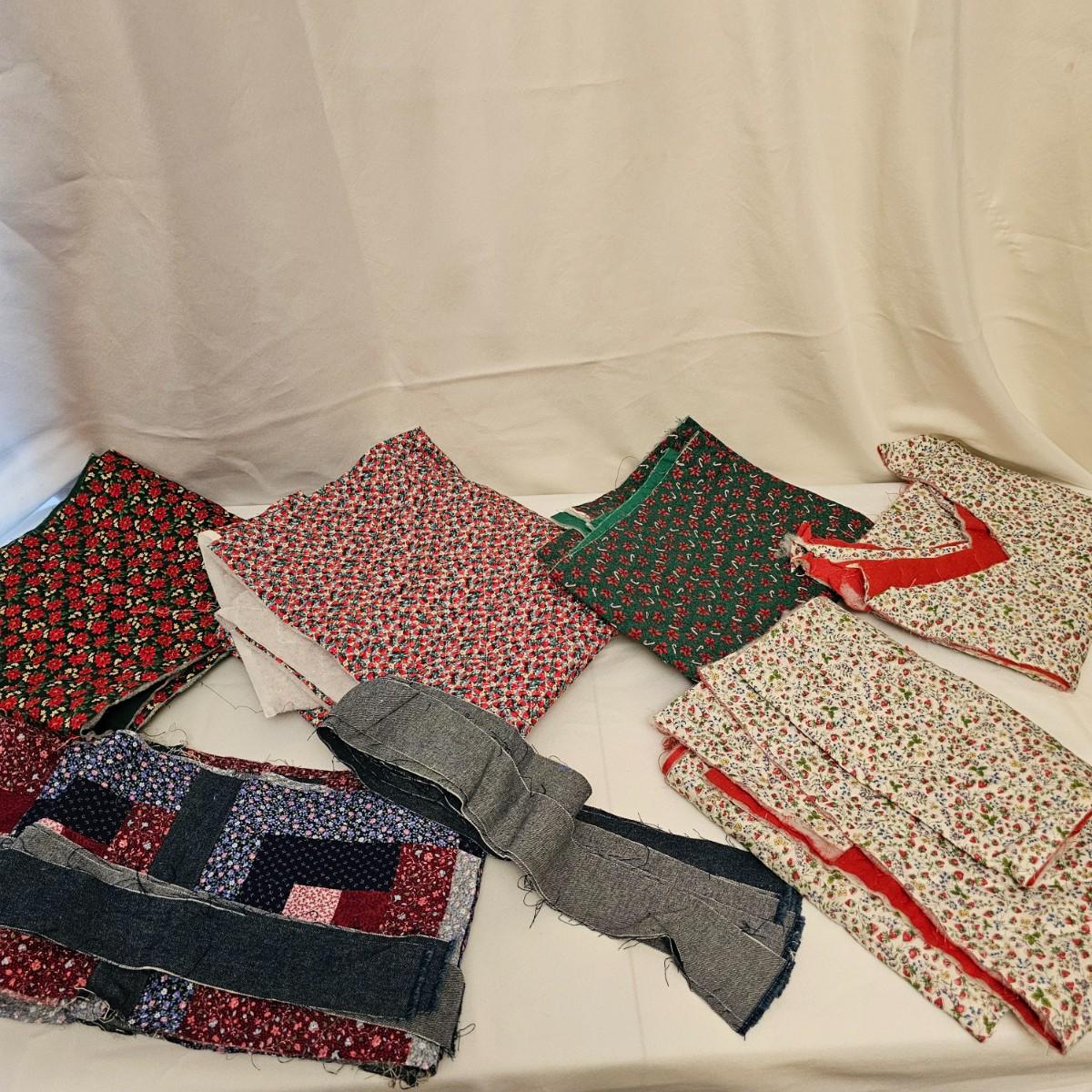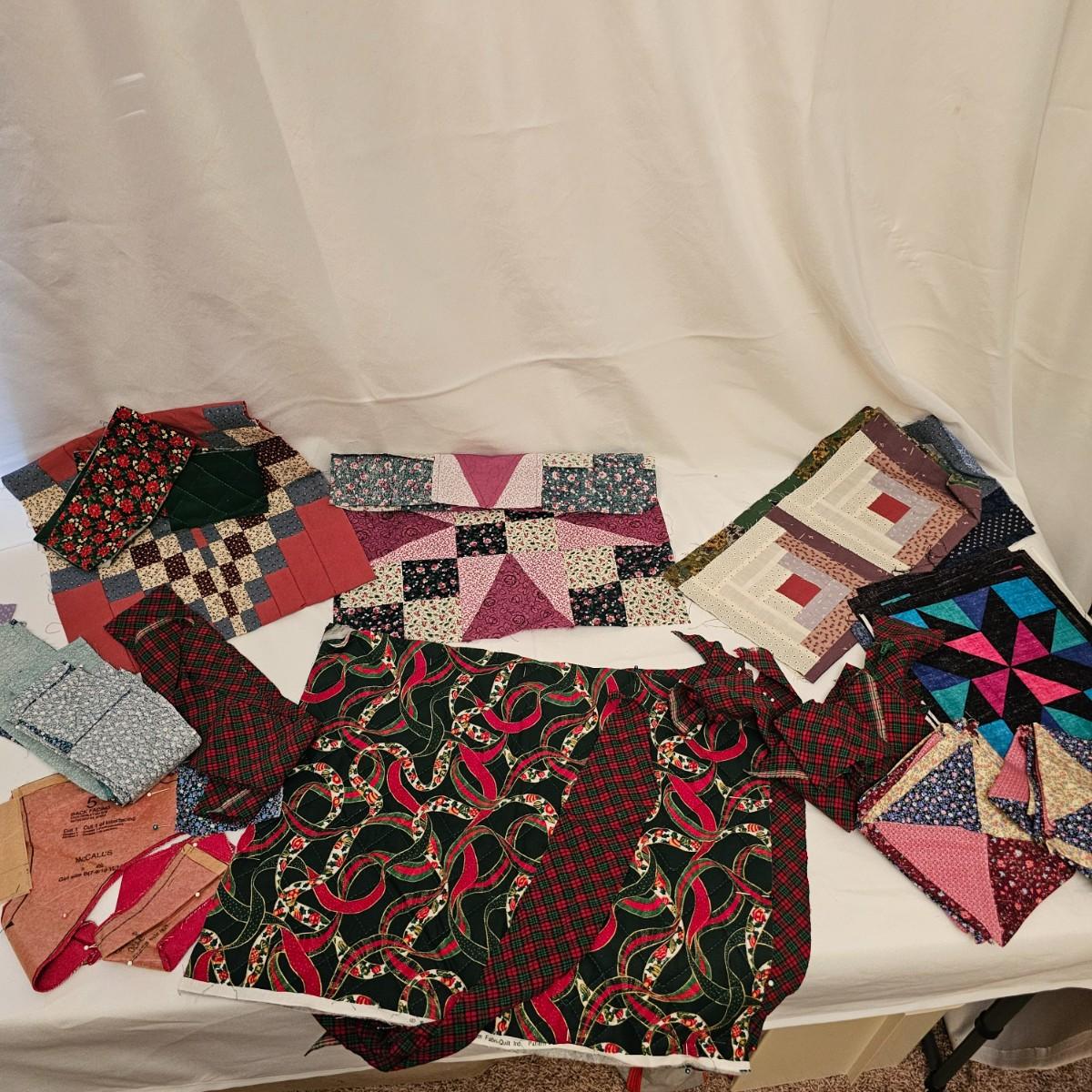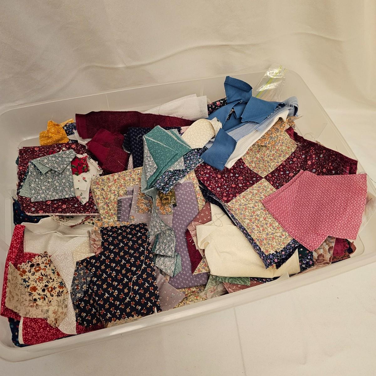 Precut pieces, loose strips and projects in progress make up this fabric offering. Many different styles and colors. Many pieces already have batting and pre quilting done, just need finished. Lot includes two flat storage bins and some bags. See photos for details. Local pickup only.