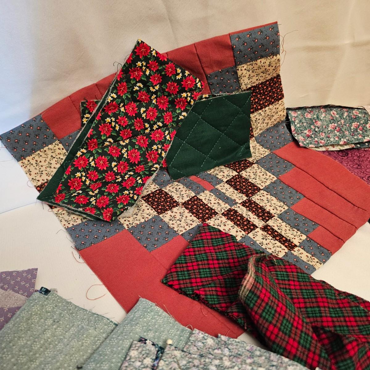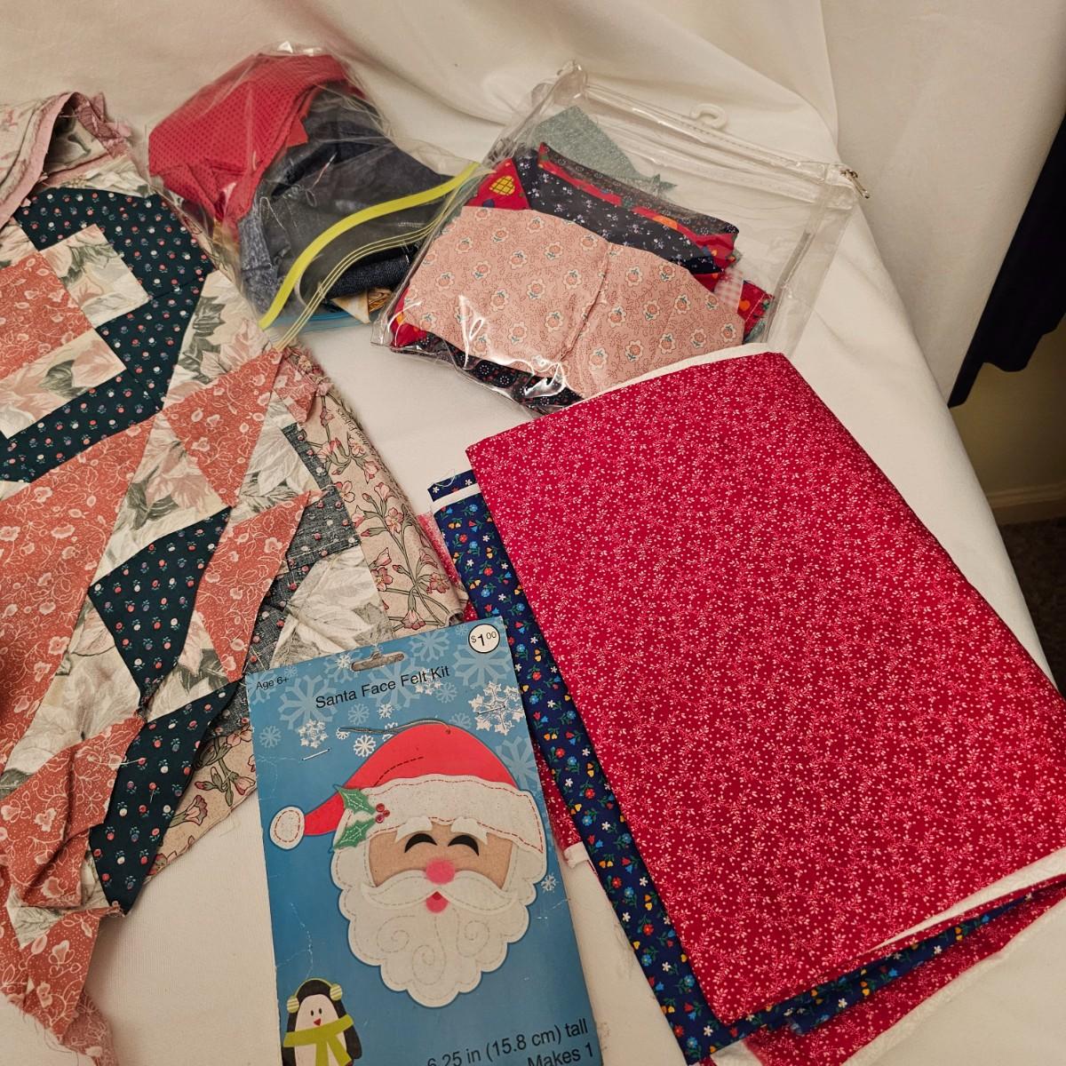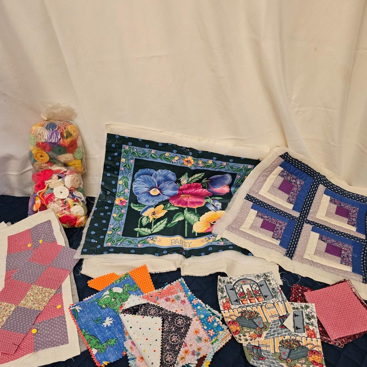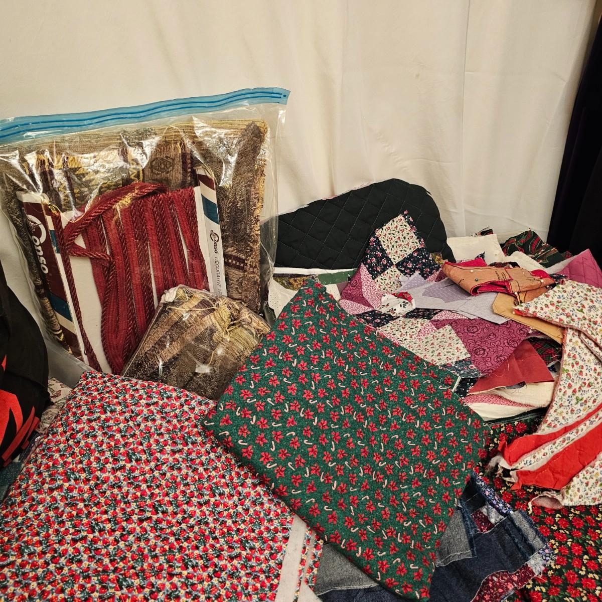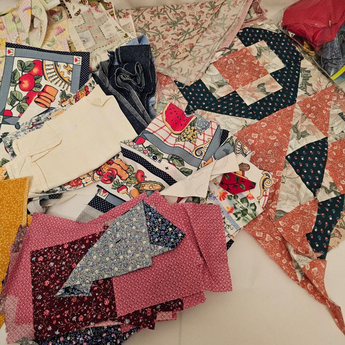 Precut pieces, loose strips and projects in progress make up this fabric offering. Many different styles and colors. Many pieces already have batting and pre quilting done, just need finished. Lot includes two flat storage bins and some bags. See photos for details. Local pickup only.