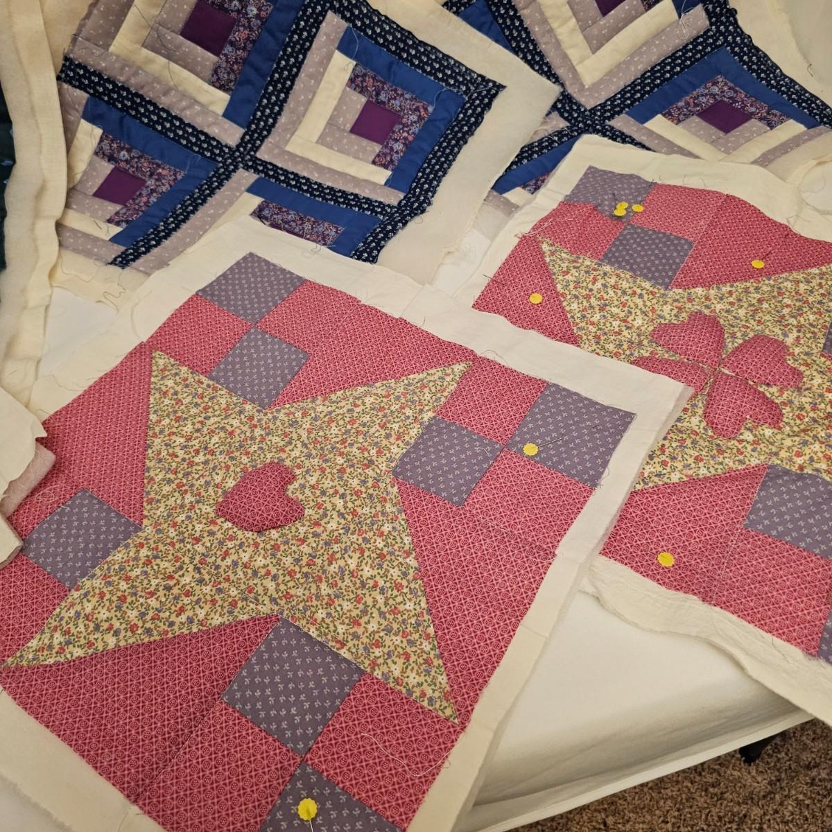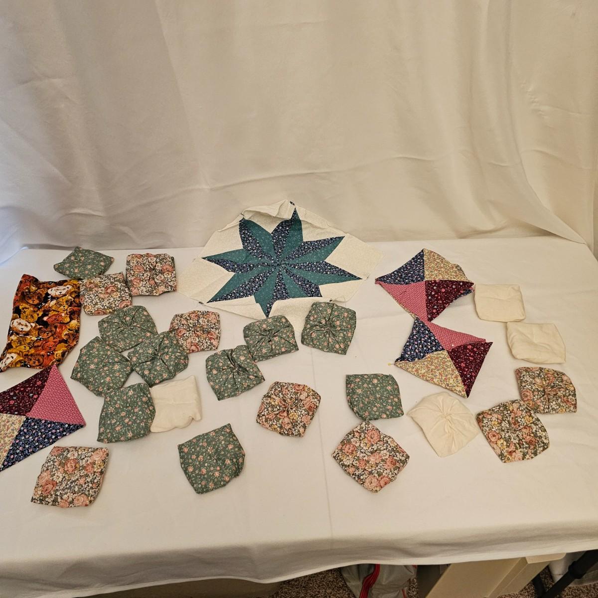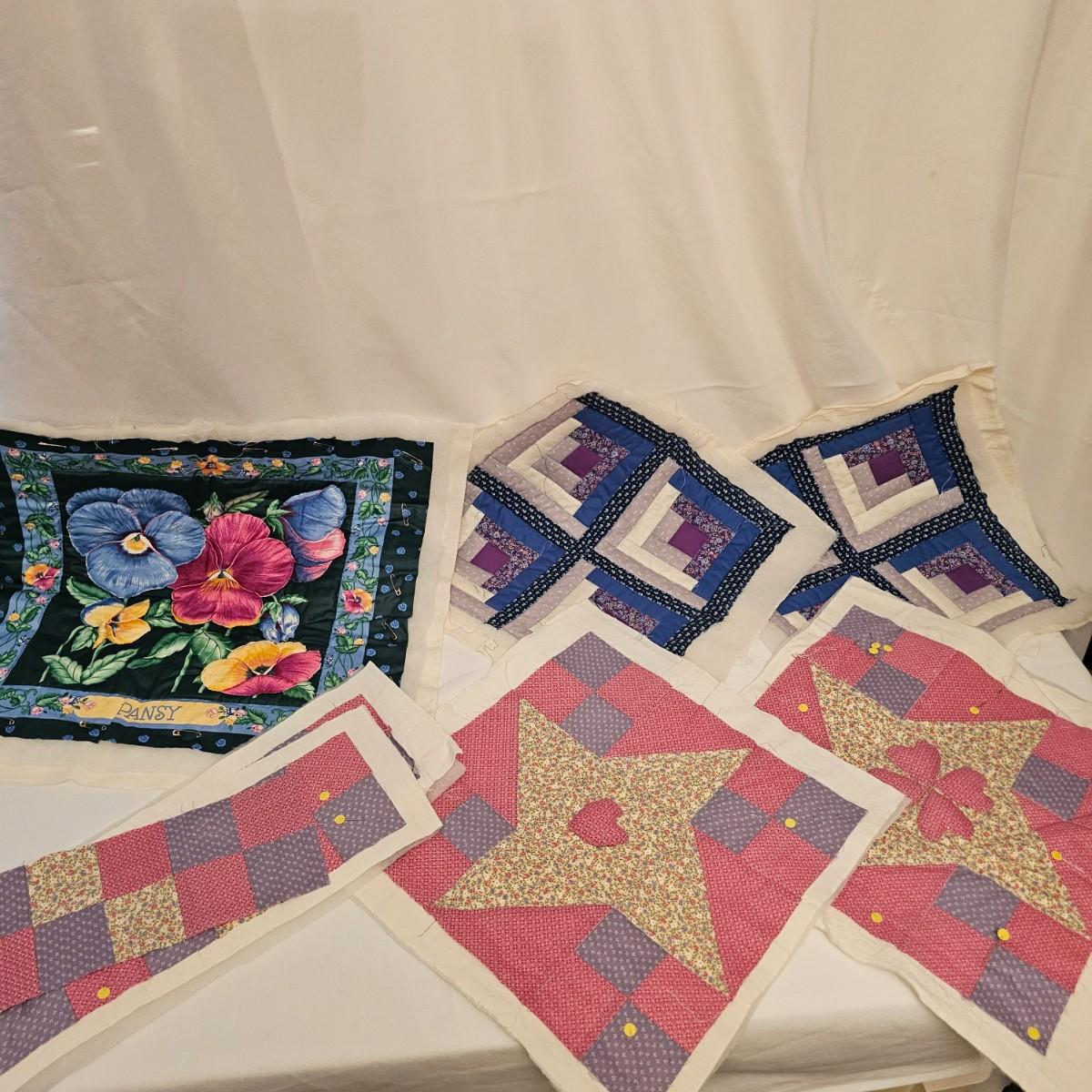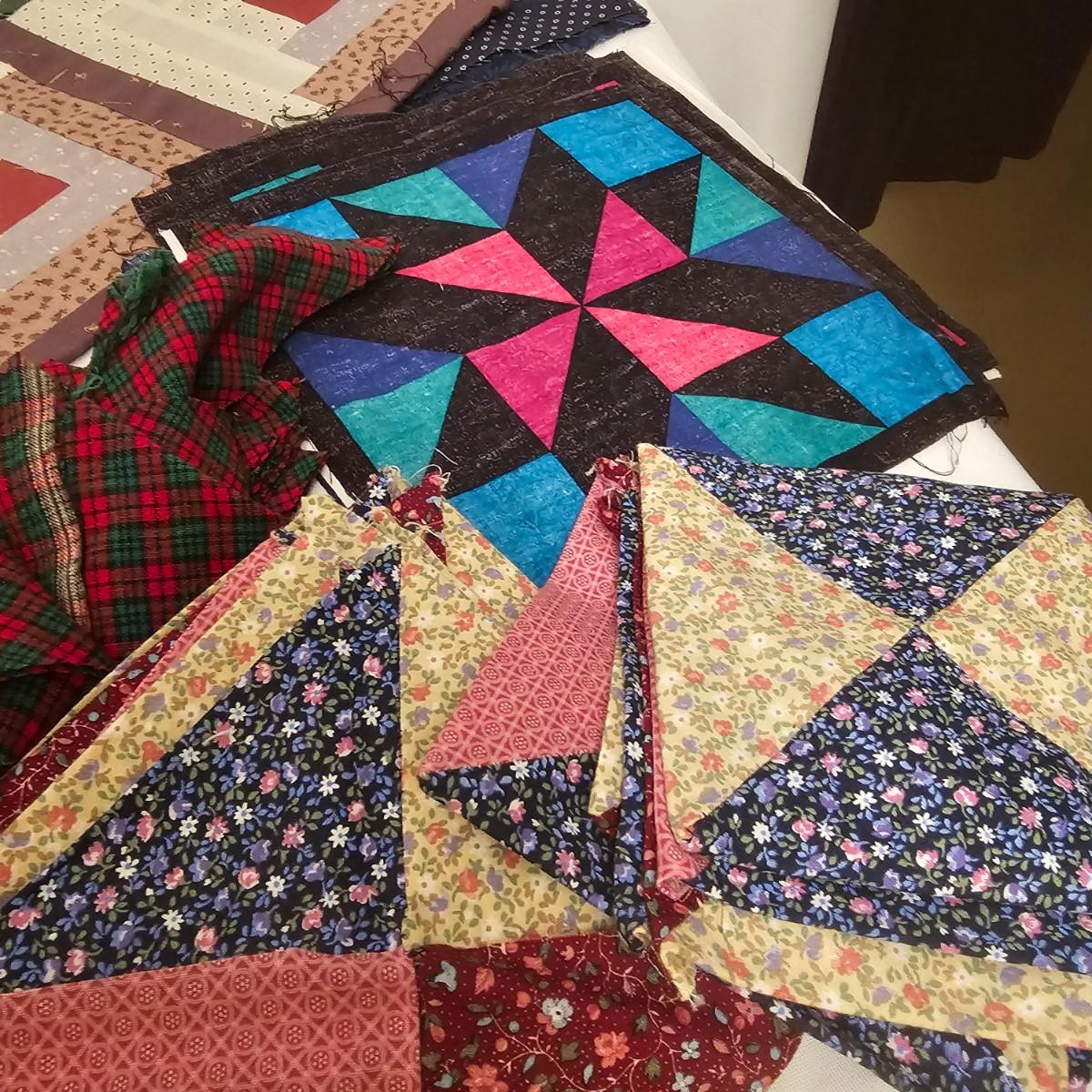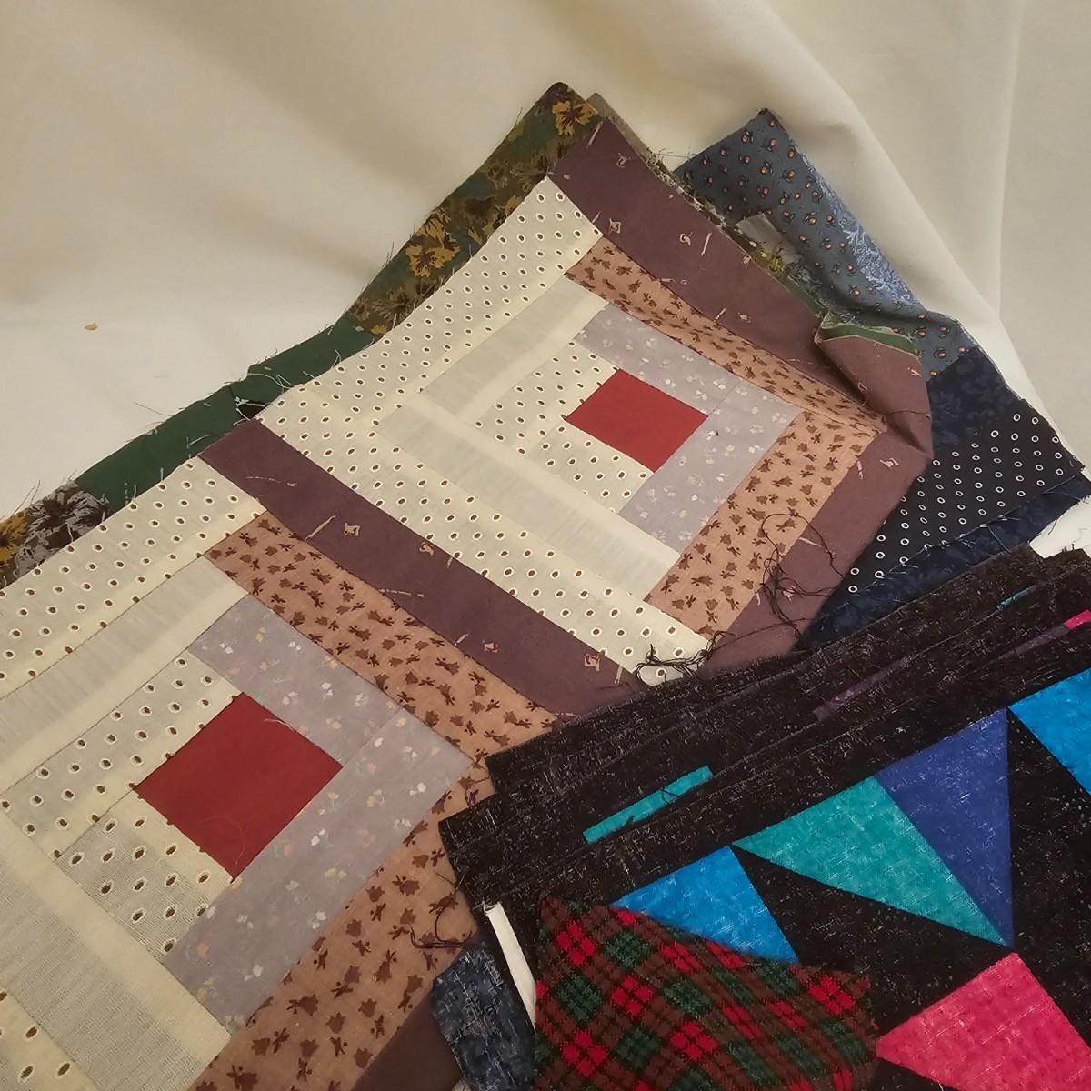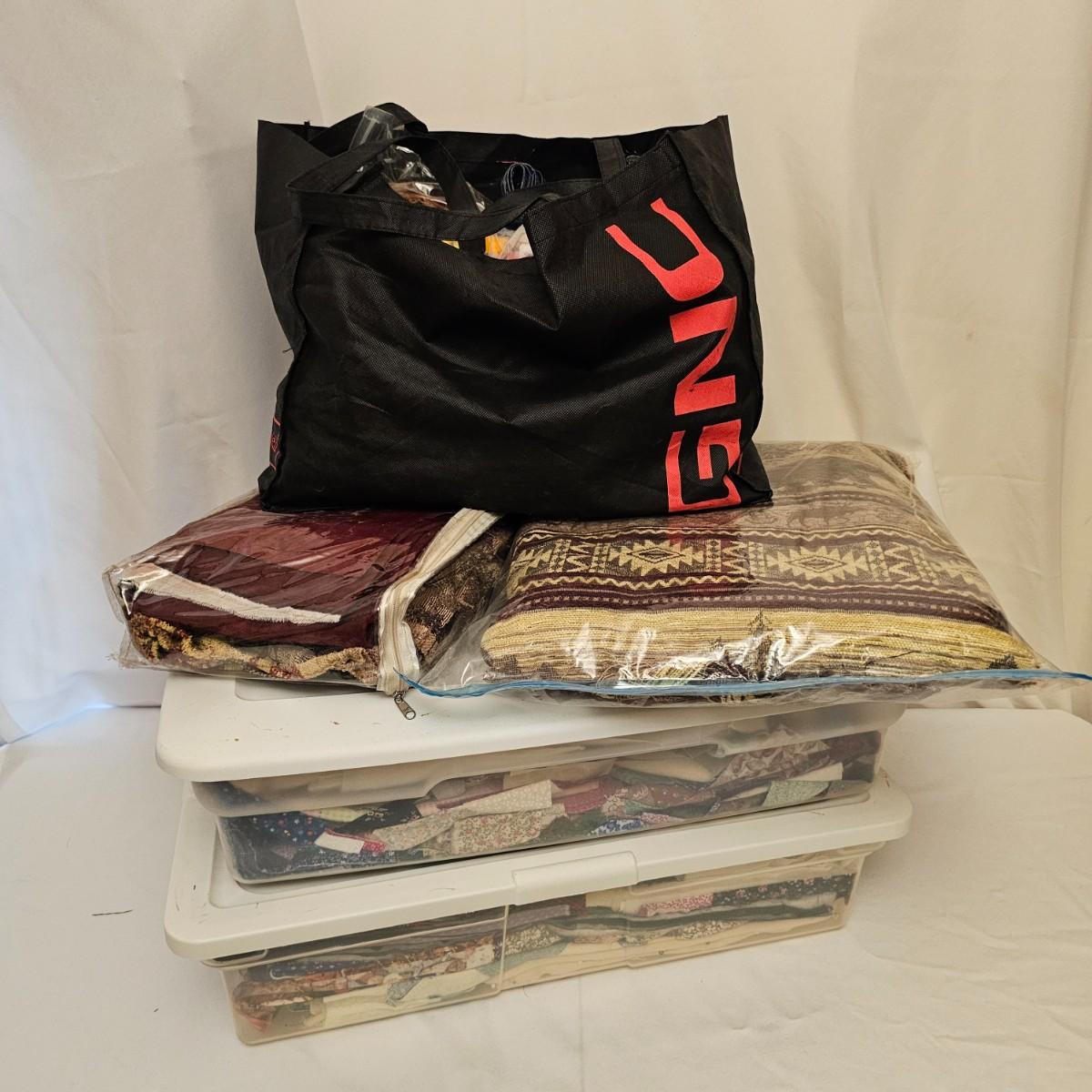 Precut pieces, loose strips and projects in progress make up this fabric offering. Many different styles and colors. Many pieces already have batting and pre quilting done, just need finished. Lot includes two flat storage bins and some bags. See photos for details. Local pickup only.