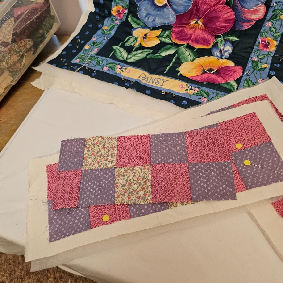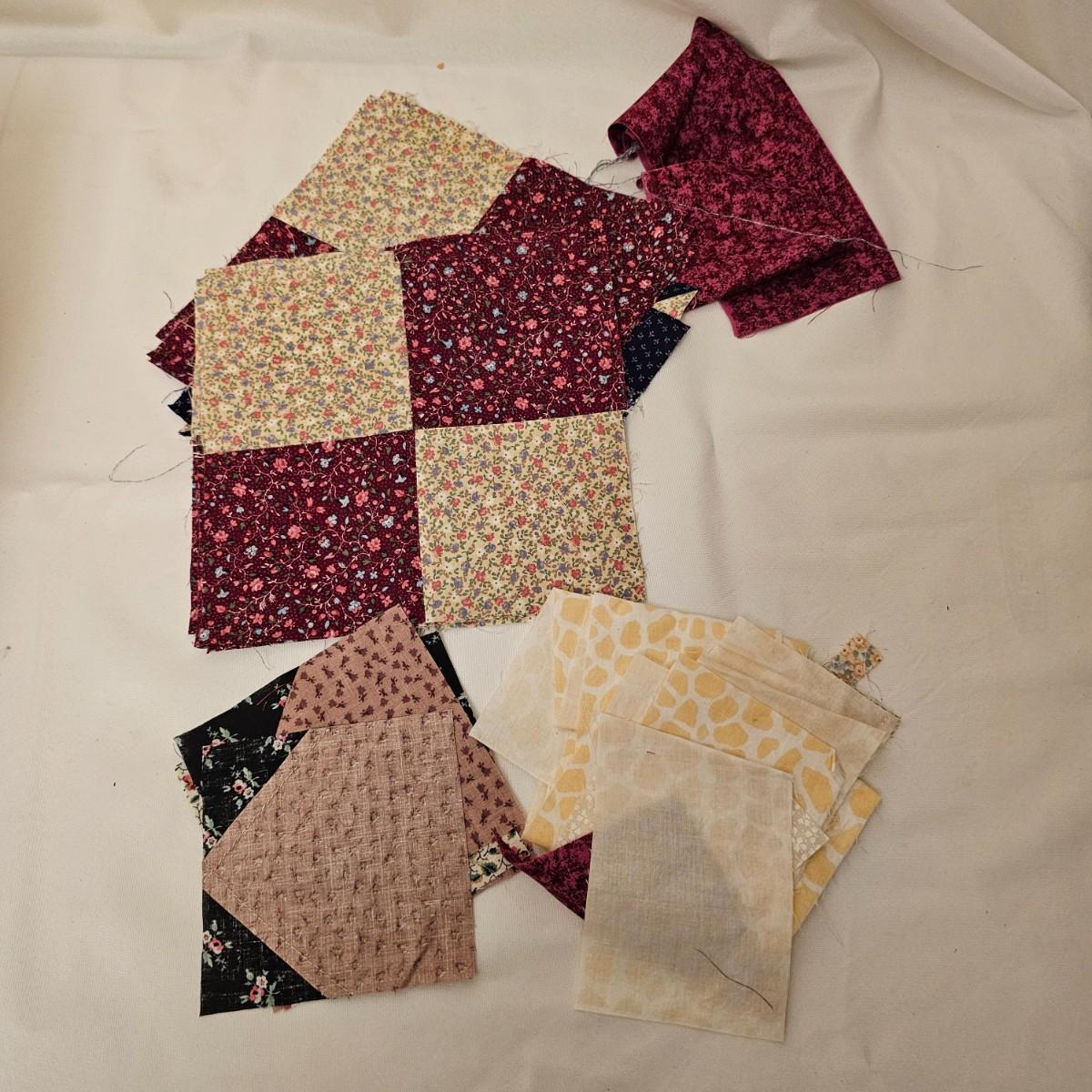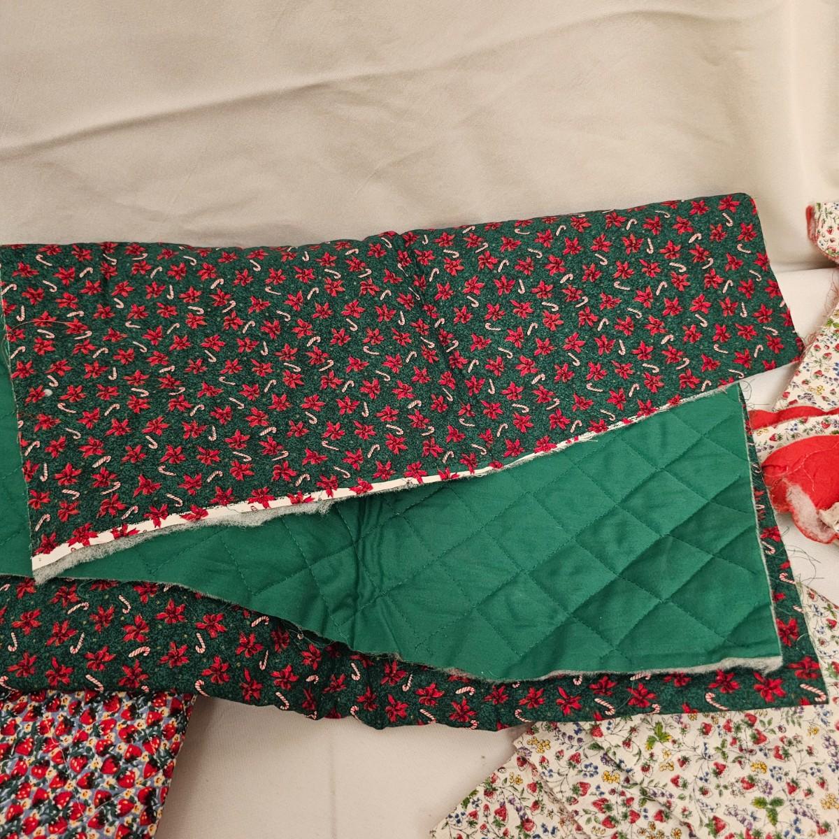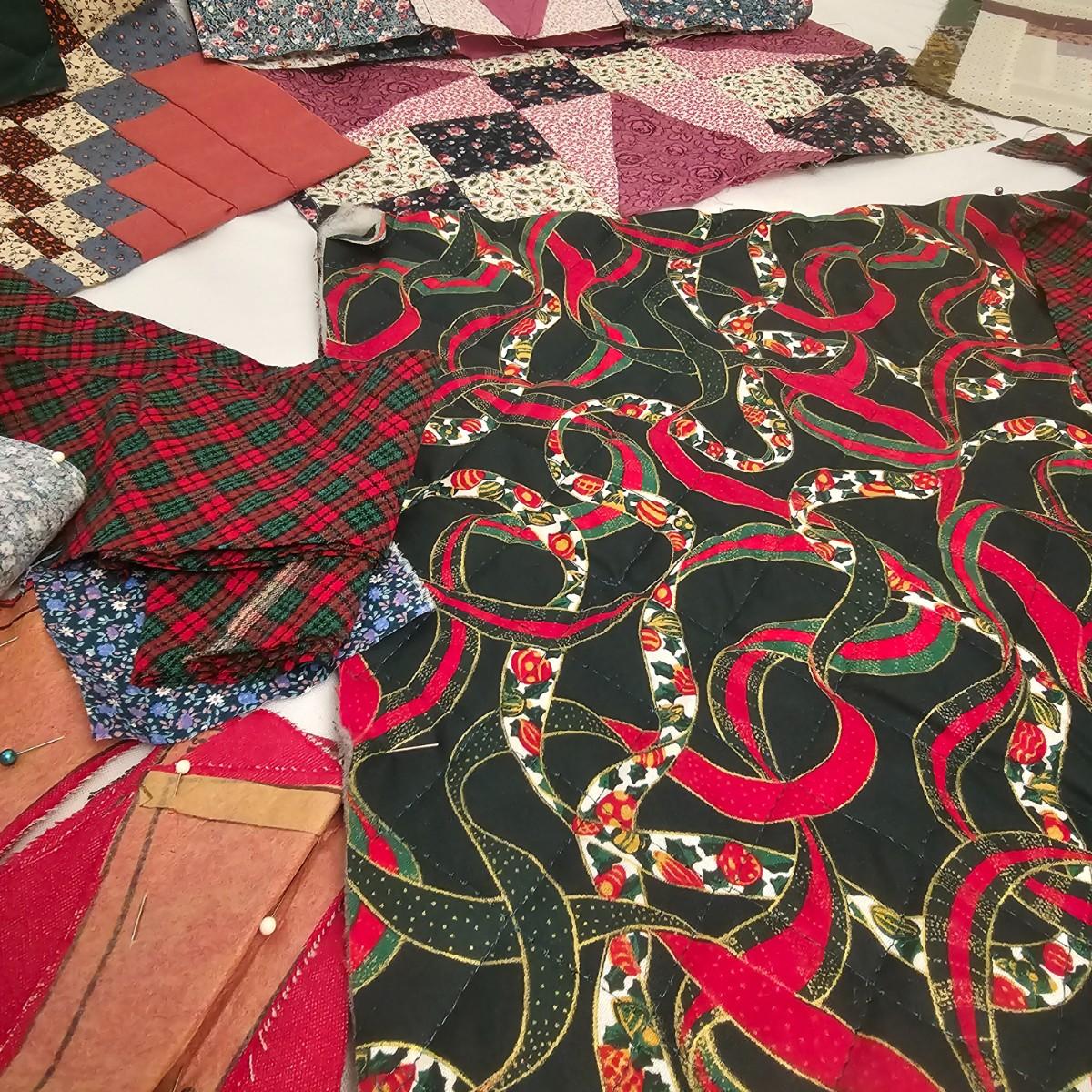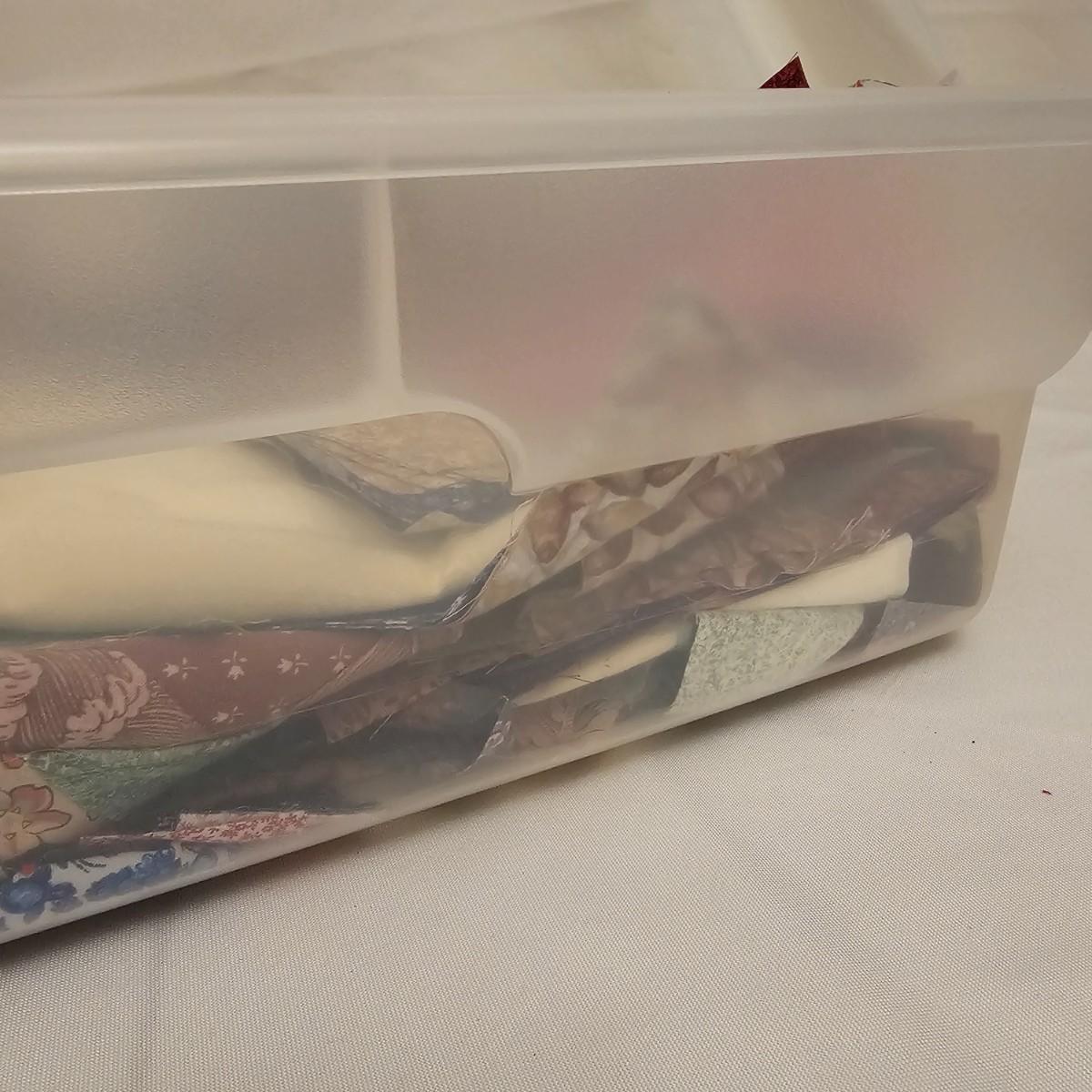 Precut pieces, loose strips and projects in progress make up this fabric offering. Many different styles and colors. Many pieces already have batting and pre quilting done, just need finished. Lot includes two flat storage bins and some bags. See photos for details. Local pickup only.