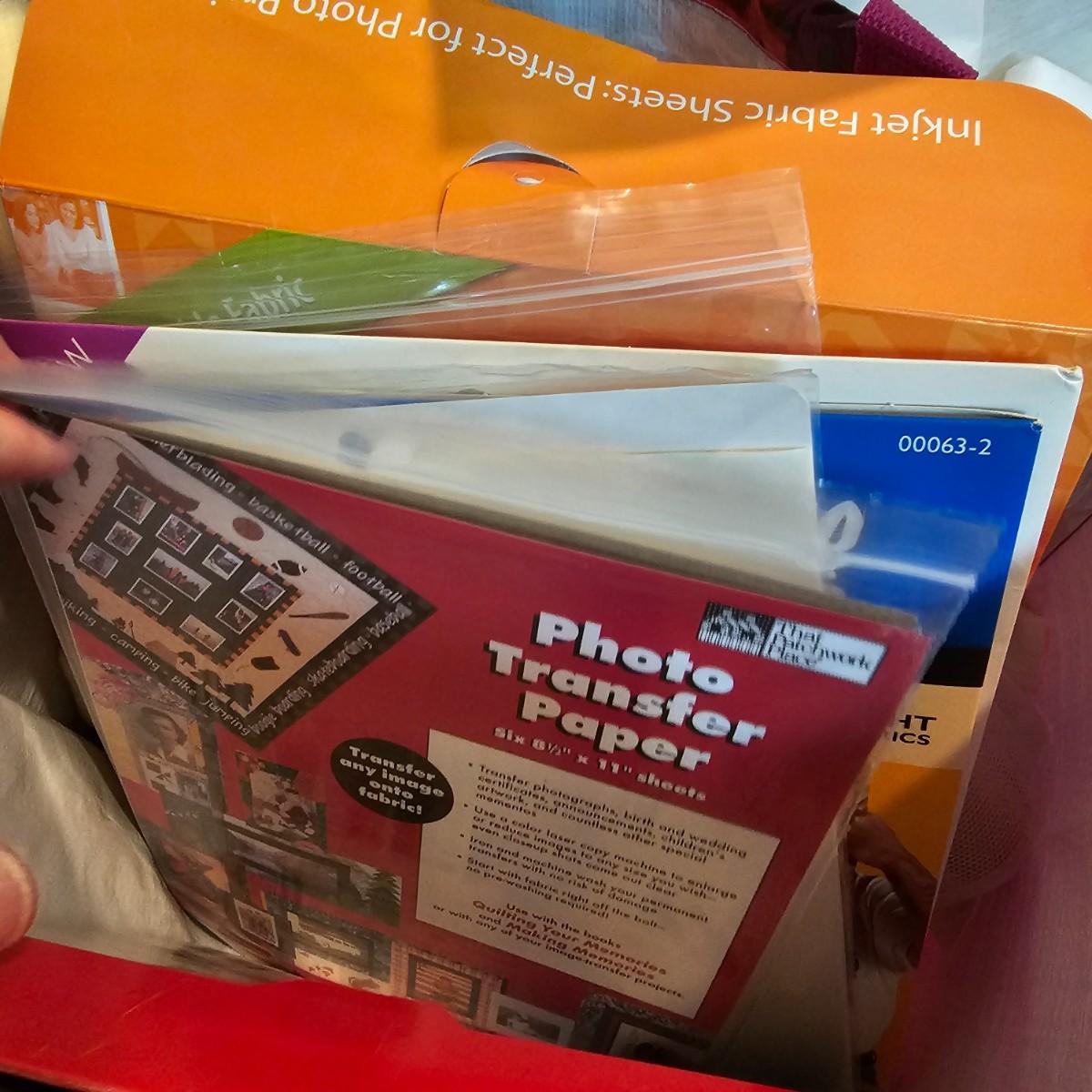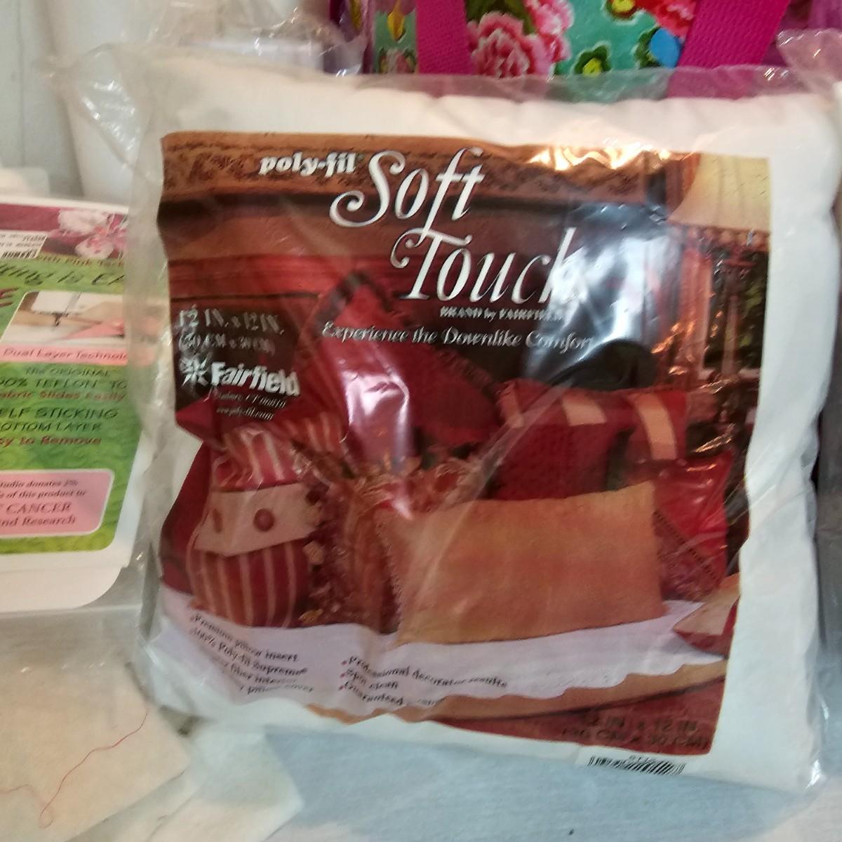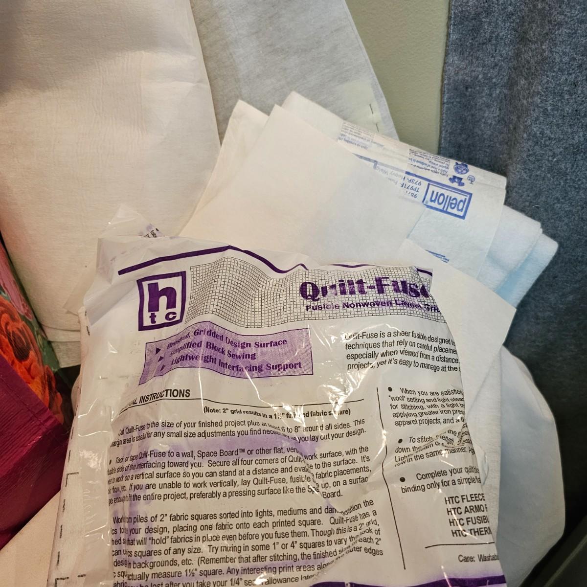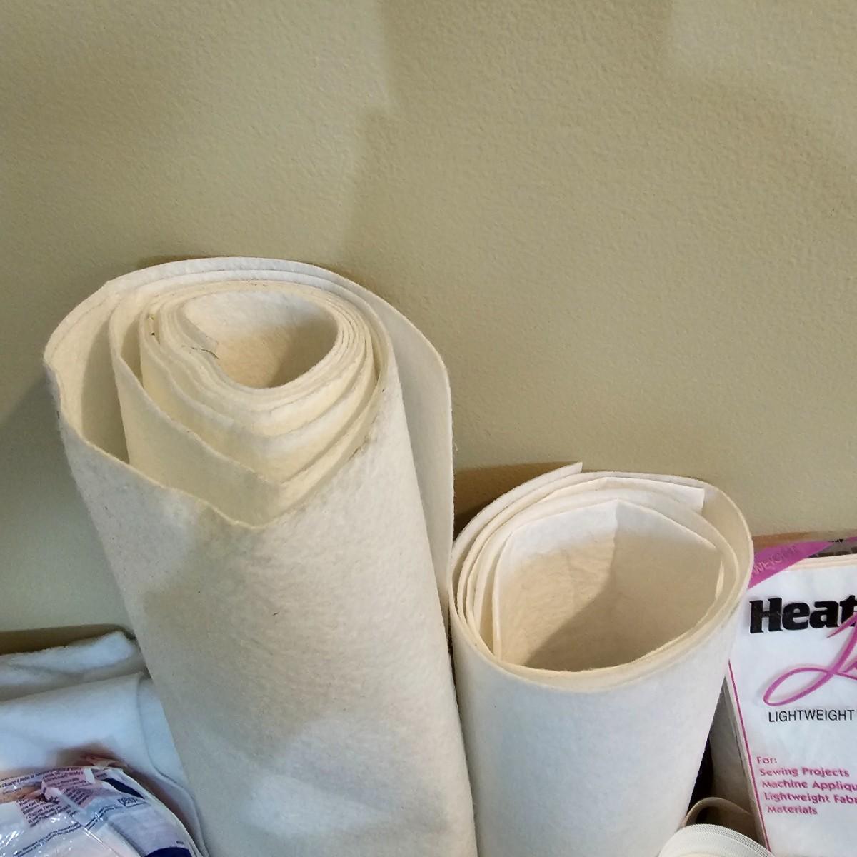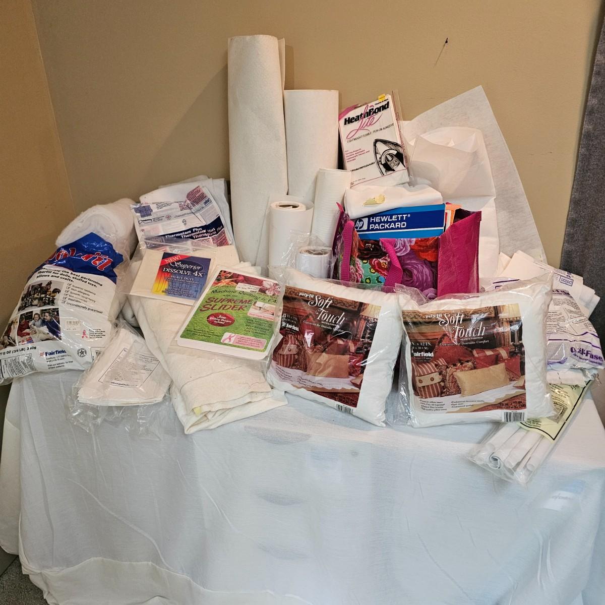 Lots of backing and fusibles for quilting or sewing. Also includes some poly fiber for pillows and batting. One bag full of iron on transfers. Rolls of backing in 12", 23" and 27" length. See photos for details. Shipping available.